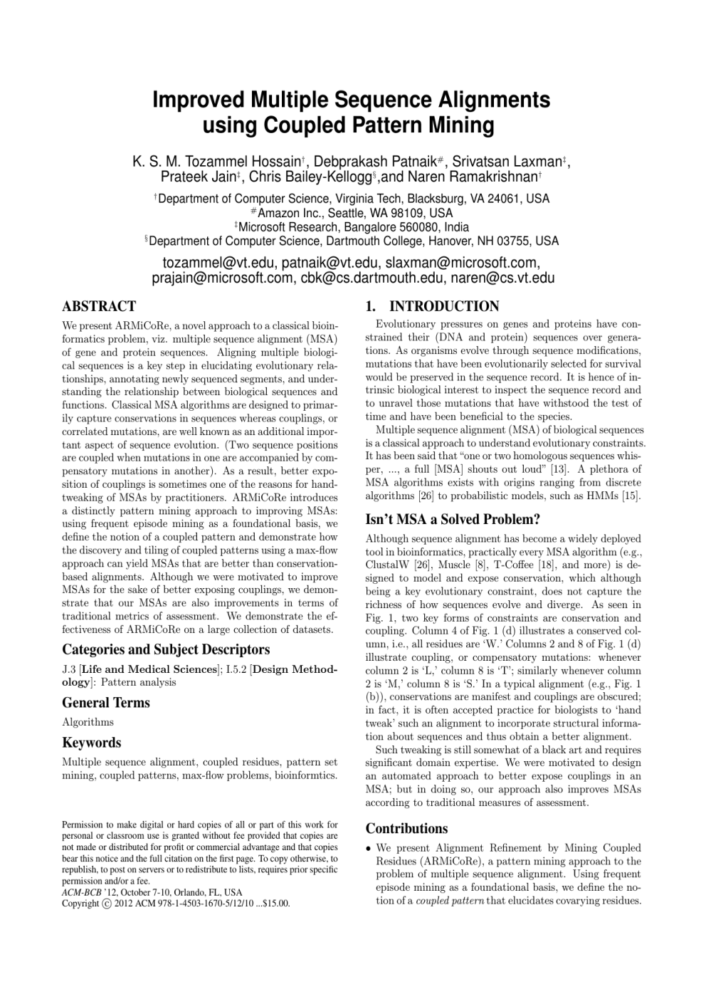 Improved Multiple Sequence Alignments using Coupled Pattern Mining K. S. M. Tozammel Hossain† , Debprakash Patnaik# , Srivatsan Laxman‡ , Prateek Jain‡ , Chris Bailey-Kellogg§ ,and Naren Ramakrishnan† † Department of Computer Science, Virginia Tech, Blacksburg, VA 24061, USA # Amazon Inc., Seattle, WA 98109, USA ‡ Microsoft Research, Bangalore 560080, India § Department of Computer Science, Dartmouth College, Hanover, NH 03755, USA [email protected], [email protected], [email protected], [email protected], [email protected], [email protected] ABSTRACT 1. We present ARMiCoRe, a novel approach to a classical bioinformatics problem, viz. multiple sequence alignment (MSA) of gene and protein sequences. Aligning multiple biological sequences is a key step in elucidating evolutionary relationships, annotating newly sequenced segments, and understanding the relationship between biological sequences and functions. Classical MSA algorithms are designed to primarily capture conservations in sequences whereas couplings, or correlated mutations, are well known as an additional important aspect of sequence evolution. (Two sequence positions are coupled when mutations in one are accompanied by compensatory mutations in another). As a result, better exposition of couplings is sometimes one of the reasons for handtweaking of MSAs by practitioners. ARMiCoRe introduces a distinctly pattern mining approach to improving MSAs: using frequent episode mining as a foundational basis, we define the notion of a coupled pattern and demonstrate how the discovery and tiling of coupled patterns using a max-flow approach can yield MSAs that are better than conservationbased alignments. Although we were motivated to improve MSAs for the sake of better exposing couplings, we demonstrate that our MSAs are also improvements in terms of traditional metrics of assessment. We demonstrate the effectiveness of ARMiCoRe on a large collection of datasets. Evolutionary pressures on genes and proteins have constrained their (DNA and protein) sequences over generations. As organisms evolve through sequence modifications, mutations that have been evolutionarily selected for survival would be preserved in the sequence record. It is hence of intrinsic biological interest to inspect the sequence record and to unravel those mutations that have withstood the test of time and have been beneficial to the species. Multiple sequence alignment (MSA) of biological sequences is a classical approach to understand evolutionary constraints. It has been said that “one or two homologous sequences whisper, ..., a full [MSA] shouts out loud” [13]. A plethora of MSA algorithms exists with origins ranging from discrete algorithms [26] to probabilistic models, such as HMMs [15]. Categories and Subject Descriptors J.3 [Life and Medical Sciences]; I.5.2 [Design Methodology]: Pattern analysis General Terms Algorithms Keywords Multiple sequence alignment, coupled residues, pattern set mining, coupled patterns, max-flow problems, bioinformtics. Permission to make digital or hard copies of all or part of this work for personal or classroom use is granted without fee provided that copies are not made or distributed for profit or commercial advantage and that copies bear this notice and the full citation on the first page. To copy otherwise, to republish, to post on servers or to redistribute to lists, requires prior specific permission and/or a fee. ACM-BCB ’12, October 7-10, Orlando, FL, USA c 2012 ACM 978-1-4503-1670-5/12/10 ...$15.00. Copyright INTRODUCTION Isn’t MSA a Solved Problem? Although sequence alignment has become a widely deployed tool in bioinformatics, practically every MSA algorithm (e.g., ClustalW [26], Muscle [8], T-Coffee [18], and more) is designed to model and expose conservation, which although being a key evolutionary constraint, does not capture the richness of how sequences evolve and diverge. As seen in Fig. 1, two key forms of constraints are conservation and coupling. Column 4 of Fig. 1 (d) illustrates a conserved column, i.e., all residues are ‘W.’ Columns 2 and 8 of Fig. 1 (d) illustrate coupling, or compensatory mutations: whenever column 2 is ‘L,’ column 8 is ‘T’; similarly whenever column 2 is ‘M,’ column 8 is ‘S.’ In a typical alignment (e.g., Fig. 1 (b)), conservations are manifest and couplings are obscured; in fact, it is often accepted practice for biologists to ‘hand tweak’ such an alignment to incorporate structural information about sequences and thus obtain a better alignment. Such tweaking is still somewhat of a black art and requires significant domain expertise. We were motivated to design an automated approach to better expose couplings in an MSA; but in doing so, our approach also improves MSAs according to traditional measures of assessment. Contributions • We present Alignment Refinement by Mining Coupled Residues (ARMiCoRe), a pattern mining approach to the problem of multiple sequence alignment. Using frequent episode mining as a foundational basis, we define the notion of a coupled pattern that elucidates covarying residues. 1 2 Sequences 3 4 5 6 7 8 9 10 LYWAFST HMNWWHLSIF CLWYQTEM PMWTNSAM MLRWEYKTAF IMMWFRLS LWPCTLM VMQWMAVSM FLEWNPTM MAWTHASLM (a) Protein sequences Initial alignment -LYWAFST-HMNWWHLSIF -CLWYQTEM-PMWTNSAM- Mine coupled MLRWEYKTAF IMMWFRLS-- pattern set --LWPCTLMVMQWMAVSMFLEWNPTM--MAWTHASLM (b) Input alignment (E.g., ClustalW) -LYWAFST-HMNWWHLSIF -CLWYQTEM-PMWTNSAMMLRWEYKTAF IMMWFRLS---LWPCTLMVMQWMAVSMFLEWNPTM--MAWTHASLM (c) A coupled pattern -LYWAFST-HMNWWHLSIF CL-WYQ-TEM PM-WTN-SAM MLRWEYKTAF IMMWFRLS--L-WPC-TLM VMQWMAVSMFLEWN-PTM-MAWTHASLM Update alignment (d) Improved alignment Figure 1: Realignment of a hypothetical MSA using coupled pattern mining. Panel (b) is input to ARMiCoRe and (d) is the improved alignment. Coupled patterns are inferred using a levelwise approach and subsequently ‘tiled’ using a max-flow algorithm. The tiling is