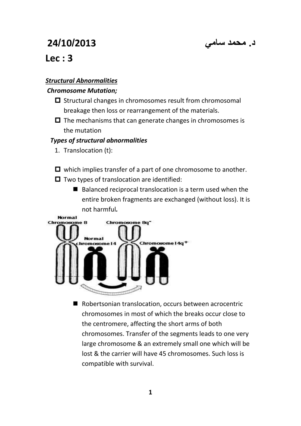 24/10/2013 Lec : 3 محمد سامي.د Structural Abnormalities Chromosome Mutation; Structural changes in chromosomes result from chromosomal breakage then loss or rearrangement of the materials. The mechanisms that can generate changes in chromosomes is the mutation Types of structural abnormalities 1. Translocation (t): which implies transfer of a part of one chromosome to another. Two types of translocation are identified: Balanced reciprocal translocation is a term used when the entire broken fragments are exchanged (without loss). It is not harmful. Robertsonian translocation, occurs between acrocentric chromosomes in most of which the breaks occur close to the centromere, affecting the short arms of both chromosomes. Transfer of the segments leads to one very large chromosome & an extremely small one which will be lost & the carrier will have 45 chromosomes. Such loss is compatible with survival. 1 2. Isochromosomes In which the centromere divides horizontally rather than vertically. One of the two arms is then lost & the remaining arm is duplicated resulting in a chromosome with either 2 long or 2 short arms only. The most common isochromosome in live births involve the long arm of X-chromosome & is designated as i(Xq), when fertilized with normal gamete the result will be monosomy for genes on Xp & trisomy for those on Xq. 3. Deletion: Involves loss of a portion of a chromosome. A single break may delete a terminal segment or two interstitial breaks which may result in loss of chromosome material between the breaks and reunion of the proximal & distal segments. Terminal (rare), result from single break in a chromosome arm producing a fragment with no centromere which is lost in next division. 2 Ring chromosome is a variant of a deletion, after loss of segments from each end of the chromosome, the arms unite to form a ring. Ring chromosomes do not behave normally in meiosis or mitosis and usually results in serious consequences. 3 Features of chromosomal disorders Chromosomal disorders may be associated with Absence (deletion or monosomy) Excess (trisomy) or Abnormal rearrangement (translocation, inversion) Loss of chromosomal material produces more severe defects than gain. Excess chromosomal material may result from complete chromosome (as in trisomy) or part of a chromosome (as in robertsonian translocation). Imbalances of sex chromosome (excess or loss) are tolerated much better than similar changes of autosomes. Sex chromosomal disorders often produce subtle abnormalities that are sometimes not detected at birth. Infertility which is a common manifestation cannot be diagnosed until adolescence. Most of chromosomal disorders result from de novo changes (i.e. parents are normal & the risk of recurrence in siblings is low). An important exception is the translocation form of Down syndrome. A-Cytogenetic disorders involving autosomes Trisomy (21, 18, 13) Deletion (Cri du chat syndrome which involves chromosome 5). Trisomy 21 (Down syndrome) It is the most common chromosomal disorder. About 95% of affected persons have trisomy 21 (usually nondisjunction). In 95%, the extra chromosome is maternal in origin. The parents are normal in all respects. Maternal age has a strong influence on the incidence which is 1 in 1550 live births in women < 20, in contrast to 1 in 25 live births in women > 45 years. No effect of paternal age. 4 In 4%, the extra chromosomal material is present not as a trisomy but as a translocation of the long arm of chromosome 21 to chromosome 22 or 14. Such cases are usually familial. Approximately 1% of trisomy 21 are mosaics, usually having a mixture of 47 & 46 chromosome cells. Symptoms in such cases are variable & milder, depending on the proportion of abnormal cells. B-Cytogenetic disorders involving sex chromosomes A number of abnormal karyotypes involving sex chromosomes, ranging from 45X to 49XXXXY, are compatible with life. On the other hand males who are phenotypically normal may have two or even three Y- chromosomes. Klinefelter syndrome Defined as a male hypogonadism that develops when there are at least two X chromosomes & one or more Y-chromosomes. Most patients are 47,XXY. The extra X may be maternal or paternal. Advanced maternal age & a history of irradiation of either parent may contribute to the condition. Approximately 15% of patients show mosaic patterns including 46,XY/47,XXY, /48,XXXY & others. The presence of 46,XY line is associated with a milder form. Turner syndrome (45,X0) A primary hypogonadism in phenotypic females. Results from partial or complete monosomy of the short arm of Xchromosome. 5 In 57% of patients, the entire X-chromosome is missing, resulting in 45,X karyotype. These patients are the most severely affected & can be diagnosed early in life. C/ Disorders of multifactorial inheritance (polygenic) Largest group among genetic disorders Governed by the additive effects of two or more genes with a small effect & conditioned by environmental influences. Involved in many physiologic characteristics of human like height, weight, blood pressure, hair color. Features of multifactorial inheritance The risk of expressing the disorder is conditioned by the number of mutant genes inherited. Also the greater the number of affected relatives, the higher the risk for other relatives The rate of recurrence is the same for all first-degree relatives of the affected individual (between 2-7 %). The risk of recurrence of the phenotypic abnormality in the subsequent pregnancies rises to 9% after 2 affected siblings. The frequency of concordance for both identical twins is significantly less than 100 % (20-40%), but is much greater than the chance of nonidentical twins. Expression of the disorder depends on when the combined influences of genes and environmental factors cross a certain threshold. E.g. Hypertension, diabetes mellitus, gout, cleft lips, cleft palates and pyloric stenosis, congenital heart diseases, cancer. D/ Single gene disorder