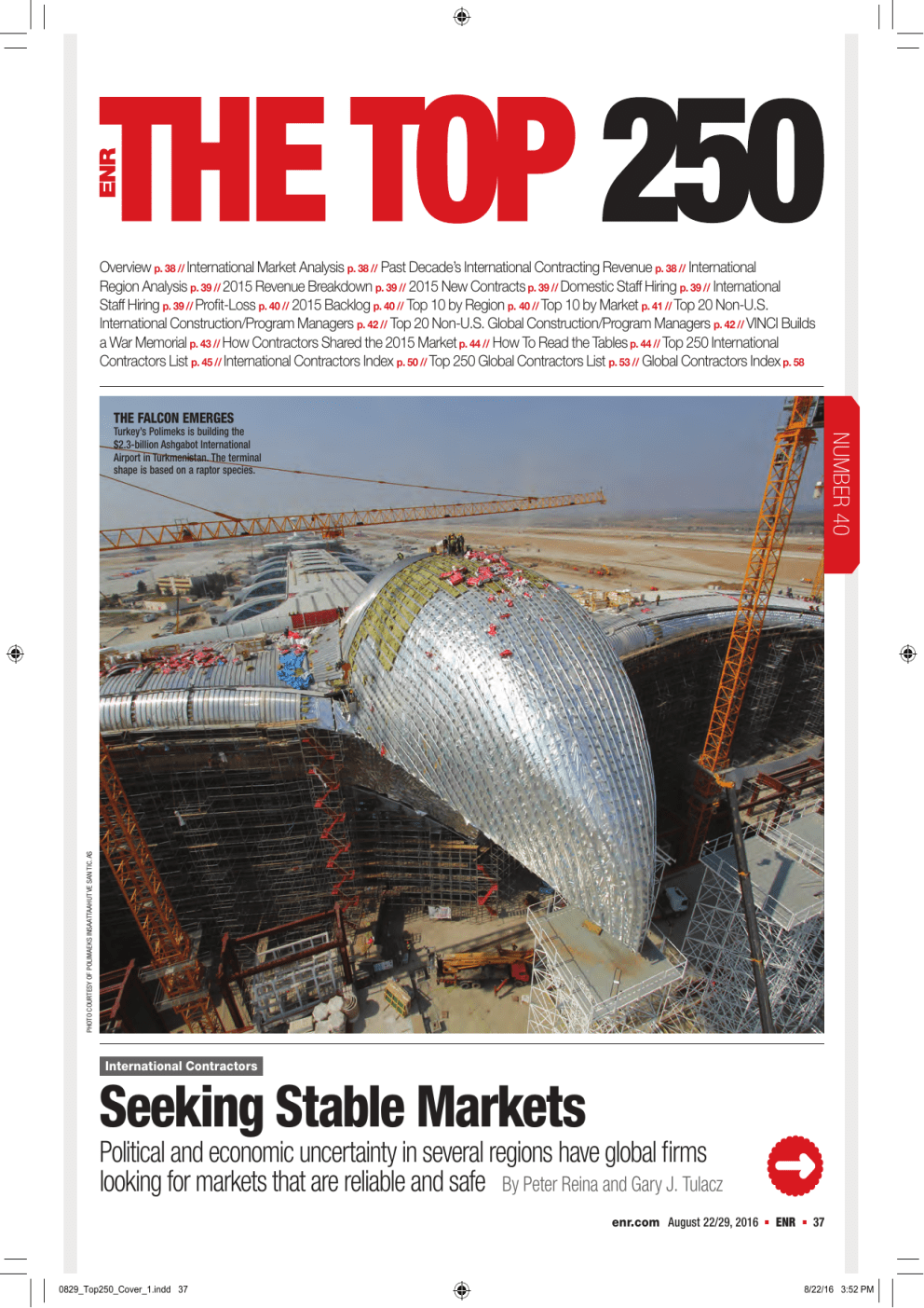 Overview p. 38 // International Market Analysis p. 38 // Past Decade’s International Contracting Revenue p. 38 // International Region Analysis p. 39 // 2015 Revenue Breakdown p. 39 // 2015 New Contracts p. 39 // Domestic Staff Hiring p. 39 // International Staff Hiring p. 39 // Profit-Loss p. 40 // 2015 Backlog p. 40 // Top 10 by Region p. 40 // Top 10 by Market p. 41 // Top 20 Non-U.S. International Construction/Program Managers p. 42 // Top 20 Non-U.S. Global Construction/Program Managers p. 42 // VINCI Builds a War Memorial p. 43 // How Contractors Shared the 2015 Market p. 44 // How To Read the Tables p. 44 // Top 250 International Contractors List p. 45 // International Contractors Index p. 50 // Top 250 Global Contractors List p. 53 // Global Contractors Index p. 58 THE FALCON EMERGES PHOTO COURTESY OF POLIMAEKS INSAATTAAHUT VE SAN TIC. AS NUMBER 40 Turkey’s Polimeks is building the $2.3-billion Ashgabot International Airport in Turkmenistan. The terminal shape is based on a raptor species. International Contractors Seeking Stable Markets Political and economic uncertainty in several regions have global firms looking for markets that are reliable and safe By Peter Reina and Gary J. Tulacz enr.com August 22/29, 2016 0829_Top250_Cover_1.indd 37 ENR 37 8/22/16 3:52 PM THE TOP 250 INTERNATIONAL CONTRACTORS 27.9% Transportation $139,563.9 Int’l Market Analysis 22.9% 21.4% Buildings $106,839.6 Petroleum $114,383.2 (Measured $ millions) 10.8% Power $54,134.5 6.0% 4.1% 2.2% 0.8% 0.2% Telecom $4,050.5 Hazardous Waste $1,210.5 Industrial $20,615.7 Manufacturing $10,808.9 Other $29,805.5 2.8% 1.0% Water $13,876.8 Sewer/Waste $4,956.0 SOURCE: ENR DATA. Comparing the Past Decade’s International Contractor Revenue $ 224.4 2006 $ 310.3 2007 $ 390.0 2008 $ 383.8 2009 $ 383.7 2010 $ 453.0 2011 $ 507.5* 2012 $ 544.0 2013 $ 521.5 2014 $ 500.1 2015 (in $ billions) *THE 2012 FIGURE IS FOR THE TOP 225 INTERNATIONAL CONTRACTORS. THE EXPANDED TOP 250 LIST FIRMS HAD A COMBINED REVENUE OF $511.1 BILLION. The global construction market has taken a series of hits over the past couple of years. First, there was the economic slowdown in China, hurting the miningand-metals sector as Chinese imports dried up. Then, the plunge in oil prices hit markets in that sector and spending in oil-producing countries. Now, international contractors are being forced to assess the impact of Britain’s exit from the European Union as well as growing political turmoil in the Middle East and elsewhere. The uncertainties in the international construction market can be seen in the results of the ENR Top 250 International Contractors list. On this list, firms are ranked based on contracting revenue from projects outside of their home countries, measuring their presence in international commerce. ENR’s Top 250 Global Contractors list ranks contractors based on total worldwide contracting revenue, regardless of the projects’ locations. The ENR Top 250 International Contractors had $501.14 billion in contracting revenue in 2015 from projects outside their home countries, down 4.1%, from $521.55 billion, in 2014. This drop comes after a similar 4.1% slide in 2014 Top 250 revenue. The Top 250, as a group, also had $897.33 billion in revenue from domestic projects in 2015, down 1.3%, from $909.26 billion, in 2014. 38 ENR “A negative factor is the entry of low-cost contractors from India, China and Korea. These contractors are affecting the market unfavorably.” Samer Khoury, President, Engineering and Construction, Consolidated Contractors Group. SOURCE: ENR DATA. On a regional basis, North Africa was the biggest gainer, at 6.7%; its markets continue to recover after several years of political strife. Latin America also was a major gainer, rising 5.1% in 2015 over 2014, as was the U.S. market, which grew 4.4% in 2015. On the other hand, the international contracting market in Canada took the biggest hit, falling 22.4%, reflecting the downturn in its oil-sands market. Central and southern Africa also fell dramatically, down 17.0% in 2015. Asia, the largest global market, also saw a double-digit decline, dropping 12.1% in 2015. Further, Europe and the Middle East saw market slowdowns, falling 6.4% and 3.2%, respectively. Hanging Tough Many large global contractors saw the market soften in 2015 but are working hard to build their sales. For Sweden’s Skanska AB, construction is generally “slightly slower” than last year, says Johan Karlström, president and CEO. But the order book is “considerably up,” mainly in the U.S. but also in Sweden and Norway, he adds. Sales by France’s VINCI Construction SA have been stalled by a dip in public-sector work at home, says Jérôme Stubler, chairman. “After the [2015] local elections, we have [suffered] a drop of 30%” in sales, he says. However, VINCI is benefiting from “the very high level of dynamism” of the firm’s concessions unit. August 22/29, 2016 enr.com 0829_Top250_Overview.indd 38 8/22/16 5:08 PM VINCI on April 6 won a $560-million contract to build the new La Defense subway station and adjacent tunnels for the RER subway system in Paris. #5 OVERVIEW Int’l Region Analysis 24.2% 15.3% (Measured $ millions) 7.9% South and Central Africa $39,435.0 4.6% 2.8% United States $53,376.9 Revenue (in $ billions) $1,397.5 18.7% Europe $93,418.5 $897.3 Domestic Revenue International Revenue Total Revenue $500.1 10.6% Canada $22,945.8 Arctic/ Antarctic $13,819.4 10.7% Middle East $76,507.2 Asia and Australia $120,839.9 Latin America $52,690.8 5.0% SOURCE: ENR DATA. North Africa $25,080.2 New Contracts (in $ billions) $1,732.5 0.4% $1,213.8 Caribbean Islands $2,029.4 Domestic New Contracts Int’l New Contracts Total New Contracts $518.9 SOURCE: ENR DATA. Professional Domestic Staff Hiring 89 46 68 Professional International Staff Hiring Some large firms believe there is growing interest in infrastructure that will boost their markets. For example, Hochtief Chairman Mar
