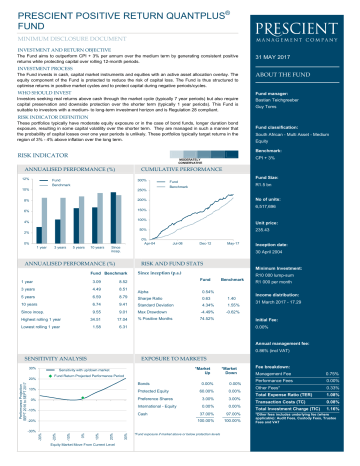 PRESCIENT POSITIVE RETURN QUANTPLUS® FUND MINIMUM DISCLOSURE DOCUMENT INVESTMENT AND RETURN OBJECTIVE The Fund aims to outperform CPI + 3% per annum over the medium term by generating consistent positive returns while protecting capital over rolling 12-month periods. 31 MAY 2017 INVESTMENT PROCESS The Fund invests in cash, capital market instruments and equities with an active asset allocation overlay. The equity component of the Fund is protected to reduce the risk of capital loss. The Fund is thus structured to optimise returns in positive market cycles and to protect capital during negative periods/cycles. ABOUT THE FUND WHO SHOULD INVEST Fund manager: Investors seeking real returns above cash through the market cycle (typically 7 year periods) but also require capital preservation and downside protection over the shorter term (typically 1 year periods). This Fund is suitable to investors with a medium- to long-term investment horizon and is Regulation 28 compliant. Bastian Teichgreeber Guy Toms RISK INDICATOR DEFINITION These portfolios typically have moderate equity exposure or in the case of bond funds, longer duration bond exposure, resulting in some capital volatility over the shorter term. They are managed in such a manner that the probability of capital losses over one year periods is unlikely. These portfolios typically target returns in the region of 3% - 4% above inflation over the long term. Fund classification: South African - Multi Asset - Medium Equity Benchmark: RISK INDICATOR ANNUALISED PERFORMANCE (%) 12% CPI + 3% MODERATELY CONSERVATIVE CUMULATIVE PERFORMANCE Fund Benchmark 300% 10% 250% 8% 200% 6% 150% Fund Size: Fund Benchmark R1.5 bn No of units: 6,517,696 100% 4% Unit price: 50% 2% 0% Apr-04 0% 1 year 3 years 5 years 10 years 235.43 Jul-08 Dec-12 May-17 Since incep. Inception date: 30 April 2004 ANNUALISED PERFORMANCE (%) RISK AND FUND STATS Minimum Investment: Fund Benchmark Since inception (p.a.) R10 000 lump-sum Fund Benchmark 1 year 3.09 8.52 3 years 4.49 8.51 Alpha 0.54% 5 years 6.59 8.79 Sharpe Ratio 0.63 1.40 10 years 6.74 9.41 Standard Deviation 4.34% 1.55 % Since incep. 9.55 9.01 Max Drawdown -4.49% -0.62 % % Positive Months 74.52% Highest rolling 1 year 34.51 17.04 Lowest rolling 1 year 1.58 6.31 R1 000 per month Income distribution: 31 March 2017 - 17.29 Initial Fee: 0.00% Annual management fee: 0.86% (incl VAT) SENSITIVITY ANALYSIS 30% *Market Up Sensitivity with up/down market Fund Return Projected Performance Period 20% 10% 0.00% 60.00% 0.00 % Preference Shares 3.00% 3.00% International - Equity 0.00 % 0.00 % 37.00% 97.00% 100.00 % 100.00 % Protected Equity 0% -10% Cash -20% 30% 20% 10% 0% -10% -20% -30% Equity Market Move From Current Level *Market Down 0.00% Bonds -30% Performance Projection SEPT 2016 to SEPT 2017 EXPOSURE TO MARKETS *Fund exposure if market above or below protection levels Fee breakdown: Management Fee 0.75% Performance Fees 0.00% Other Fees* 0.33% Total Expense Ratio (TER) 1.08% Transaction Costs (TC) 0.08% Total Investment Charge (TIC) 1.16% *Other fees includes underlying fee (where applicable): Audit Fees, Custody Fees, Trustee Fees and VAT PRESCIENT POSITIVE RETURN QUANTPLUS® FUND ASSET ALLOCATION SA EQUITY SECTOR EXPOSURE Financials 20.15% Telecoms 5.23% Property 4.00% Cash 5.00% Cash 0.79% Consumer Services 25.58% Income Assets 62.00% Basic Materials 21.58% Equity 26.00% Health Care 4.14% Preference Shares 3.00% Consumer Goods 18.53% Industrials 4.00% FUND MONTHLY RETURNS JAN FEB MAR APR 2004 MAY JUN JUL AUG SEP OCT NOV DEC YTD 0.91% -0.68% 1.13% 2.52% 1.86% -0.15% 1.68% 0.55% 8.04% 2005 0.54% 2.57% -0.31% -1.46% 4.82% 1.49% 3.45% 1.60% 5.56% 0.86% 0.89% 3.71% 26.17% 2006 4.49% -1.19% 2.89% 1.65% -0.02% 1.83% -0.64% 2.24% 0.50% 2.04% 0.10% 0.82% 15.60% 2007 1.67% 1.22% 3.29% 0.94% 1.65% 0.00% 1.17% 0.59% 2.50% 2.11% -1.25% -2.19% 12.21% 2008 -1.12% 4.10% -0.30% 1.21% 1.77% 0.57% 1.23% 0.93% 0.59% 0.24% 0.78% 0.63% 11.06% 2009 -0.04% -0.69% 2.87% 0.90% 2.13% 0.07% 1.47% 0.62% 0.48% 0.84% 0.65% 0.45% 10.15% 2010 0.49% 0.47% 1.21% 0.34% -0.01% -0.01% 1.22% -0.21% 1.50% 0.83% 0.41% 1.03% 7.50% 2011 -0.15% 0.76% 0.39% 0.54% 0.00% -0.39% -0.71% 0.49% -0.17% 1.78% -0.24% -0.14% 2.16% 2012 1.43% 0.45% -0.92% 0.78% -0.75% 0.20% 0.55% 0.56% 0.39% 2.14% 1.05% 1.24% 7.29% 2013 1.39% -0.46% 0.02% -0.79% 3.32% -2.01% 1.57% 1.46% 2.16% 1.94% -0.65% 1.36% 9.57% 2014 -0.87% 1.69% 0.83% 0.77% 1.14% 1.28% 0.95% -0.31% -0.86% 0.55% 0.28% -0.01% 5.53% 2015 1.08% 1.57% -0.15% 1.60% -0.90% 0.28% 0.13% -0.80% 0.51% 2.78% -1.34% -0.37% 4.40% 2016 0.21% 0.32% 1.30% 0.70% 1.47% 0.30% 1.14% 0.69% 0.10% -1.10% 0.06% 0.14% 5.42% 2017 1.46% -1.55% 0.18% 1.11% 0.58% 1.76% FUND COMMENTARY The Fund ended the month about a percent higher, outperforming equities, underperforming bonds and performing in line with cash. Implied volatility was unchanged and still traded close to all-time lows. Protection has therefore rarely been cheaper. Domestically, we've seen lower levels of volatility only during a short period in 2014. The low level of implied volatility itself raises some caution: Market participants are not positioned for a sell off and seem complacent. We do acknowledge that earnings have been improving, leading to slightly better valuations. But the recovery could be deemed fragile as the business cycle is long in the tooth and tightening financial conditions globally raise additional reasons to be careful. We continue to run our equity allocation with a high nominal but low effective exposure. This positioning enables us to capture significant equity upside while being protected on the downside. Bonds experienced a strong May, ending the month 1 percent higher. We continue to see value at yields on the SA 10Y Treasury bond around 9%, where we would consider entering again. Until we get there, however, we stay on the side-line, as we consider the compensation for taking on additional credit and duration risk not sufficient. Contributors to performan