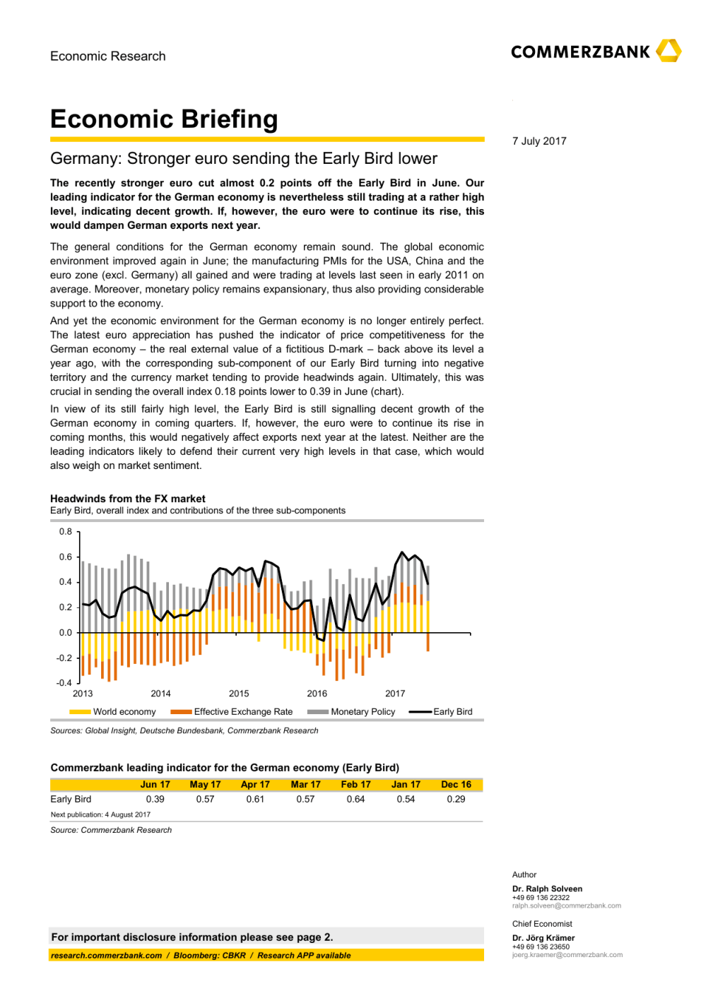 Economic Research e Economic Briefing 7 July 2017 Germany: Stronger euro sending the Early Bird lower The recently stronger euro cut almost 0.2 points off the Early Bird in June. Our leading indicator for the German economy is nevertheless still trading at a rather high level, indicating decent growth. If, however, the euro were to continue its rise, this would dampen German exports next year. The general conditions for the German economy remain sound. The global economic environment improved again in June; the manufacturing PMIs for the USA, China and the euro zone (excl. Germany) all gained and were trading at levels last seen in early 2011 on average. Moreover, monetary policy remains expansionary, thus also providing considerable support to the economy. And yet the economic environment for the German economy is no longer entirely perfect. The latest euro appreciation has pushed the indicator of price competitiveness for the German economy – the real external value of a fictitious D-mark – back above its level a year ago, with the corresponding sub-component of our Early Bird turning into negative territory and the currency market tending to provide headwinds again. Ultimately, this was crucial in sending the overall index 0.18 points lower to 0.39 in June (chart). In view of its still fairly high level, the Early Bird is still signalling decent growth of the German economy in coming quarters. If, however, the euro were to continue its rise in coming months, this would negatively affect exports next year at the latest. Neither are the leading indicators likely to defend their current very high levels in that case, which would also weigh on market sentiment. Headwinds from the FX market Early Bird, overall index and contributions of the three sub-components 0.8 0.6 0.4 0.2 0.0 -0.2 -0.4 2013 2014 World economy 2015 2016 Effective Exchange Rate 2017 Monetary Policy Early Bird Sources: Global Insight, Deutsche Bundesbank, Commerzbank Research Commerzbank leading indicator for the German economy (Early Bird) Early Bird Jun 17 May 17 Apr 17 Mar 17 Feb 17 Jan 17 Dec 16 0.39 0.57 0.61 0.57 0.64 0.54 0.29 Next publication: 4 August 2017 Source: Commerzbank Research Author Dr. Ralph Solveen +49 69 136 22322 [email protected] Chief Economist For important disclosure information please see page 2. Dr. Jörg Krämer research.commerzbank.com / Bloomberg: CBKR / Research APP available +49 69 136 23650 [email protected] Economic Research | Economic Briefing In accordance with ESMA MAR requirements this report was completed 07/07/2017 07:37 CEST and disseminated 07/07/2017 07:38 CEST. This document has been created and published by the Research department within the Corporate Clients division of Commerzbank AG, Frankfurt/Main or Commerzbank’s branch offices mentioned in the document. Commerzbank AG is a provisionally registered swap dealer with the CFTC. If this report includes an analysis of one or more equity securities, please note that the author(s) certify that (a) the views expressed in this report accurately reflect their personal views; and (b) no part of their compensation was, is, or will be directly or indirectly related to the specific recommendation(s) or views expressed by them contained in this document. The research analyst(s) named on this report are not registered / qualified as research analysts with FINRA. Such research analyst(s) may not be associated persons of Commerz Markets LLC and therefore may not be subject to FINRA Rule 2241 restrictions on communications with a subject company, public appearances and trading securities held by a research analyst account. It has not been determined in advance whether and in what intervals this document will be updated. Unless otherwise stated current prices refer to the most recent trading day’s closing price or spread which may fluctuate. Conflicts of interest Disclosures of potential conflicts of interest relating to Commerzbank AG, its affiliates, subsidiaries (together “Commerzbank”) and its relevant employees with respect to the issuers, financial instruments and/or securities forming the subject of this document valid as of the end of the month prior to publication of this document*: Please refer to the following link for disclosures on companies included in compendium reports or disclosures on any company covered by Commerzbank analysts: http://research.commerzbank.com/web/commerzbank-research-portal/public-page/disclosures* *Updating this information may take up to ten days after month end. Disclaimer This document is for information purposes only and does not take into account specific circumstances of any recipient. The information contained herein does not constitute the provision of investment advice. It is not intended to be and should not be construed as a recommendation, offer or solicitation to acquire, or dispose of, any of the financial instruments and/or securities mentioned in this document and will not form the basis or a part of any contract or commitment whatsoever. Investors should seek independent professional advice and draw their own conclusions regarding suitability of any transaction including the economic benefits, risks, legal, regulatory, credit, accounting and tax implications. The information in this document is based on public data obtained from sources believed by Commerzbank to be reliable and in good faith, but no representations, guarantees or warranties are made by Commerzbank with regard to accuracy, completeness or suitability of the data. Commerzbank has not performed any independent review or due diligence of publicly available information regarding an unaffiliated reference asset or index. The opinions and estimates contained herein reflect the current judgement of the author(s) on the date of this document and are subject to change without notice. The opinions do not necessarily correspond to the opinions of Commerzbank. Commerzbank does not have an obligation to update, modify or 