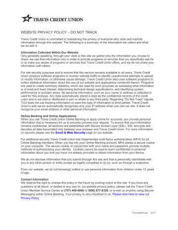 WEBSITE PRIVACY POLICY – DO NOT TRACK Travis Credit Union is committed to maintaining the privacy of everyone who visits and submits information through this website. The following is a summary of the information we collect and what we do with it. Information Collected Within Our Website Very generally speaking, through your visits to this site we gather only the information you choose to share, we use that information only in order to provide programs or services that you specifically ask for or to make you aware of programs or services that Travis Credit Union offers, and we do not share your information with others. For site security purposes and to ensure that this service remains available to all users, Travis Credit Union employs software programs to monitor website traffic to identify unauthorized attempts to upload or modify information, or otherwise cause damage. Travis Credit Union also uses software programs to collect statistical information about the use of our website and applications contained therein. Programs are used to create summary statistics, which are used for such purposes as assessing what information is of most and least interest, determining technical design specifications, and identifying system performance or problem areas. No personal information, such as your name or address is collected or used for this analysis. Any data automatically stored is kept as the confidential records of the credit union and is not sold or distributed in part or whole to any third party. Regarding "Do Not Track" signals, TCU does not use tracking information or pass this type of information to third parties. Travis Credit Union’s web server automatically recognizes only your IP address when you visit our site. It does not recognize your email address or other personal information. Online Banking and Online Applications When you use Travis Credit Union Online Banking or apply online for accounts, you provide personal information that is necessary for us to securely process your request. To ensure that your information remains confidential, all sessions are established with Secure Socket Layer (SSL). SSL encrypts and decodes all data transmitted only between your browser and Travis Credit Union. For more information on security please see the Email & Web Security page on our website. For additional security Travis Credit Union has implemented multi-factor authentication (MFA) for all Online Banking members. When you log into your Online Banking account, MFA places a secure cookie on your computer. The secure cookie, in conjunction with your name and password, provide multiple methods of authenticating your identity. Cookies cannot be used to learn confidential or personal information about you that you have not already provided or obtain information from your device. We do not disclose information that you submit through this site and that is personally identifiable with you to any other person or entity except as legally compelled to do so, such as through a subpoena. From our website, we do not knowingly collect or use personal information from children under 13 years of age. Contact Information We reserve the right to change this policy in the future by posting notice at this site. If you have any questions at all about, or related in any way to, our website privacy policy, please call the Travis Credit Union Member Service Center at (707) 449-4000 or (800) 877-8328, or e-mail us anytime using Secure Messaging within Online Banking. Your privacy is very important to us. Please click here to view our Privacy Policy. TCU-DoNotTrack 01/17