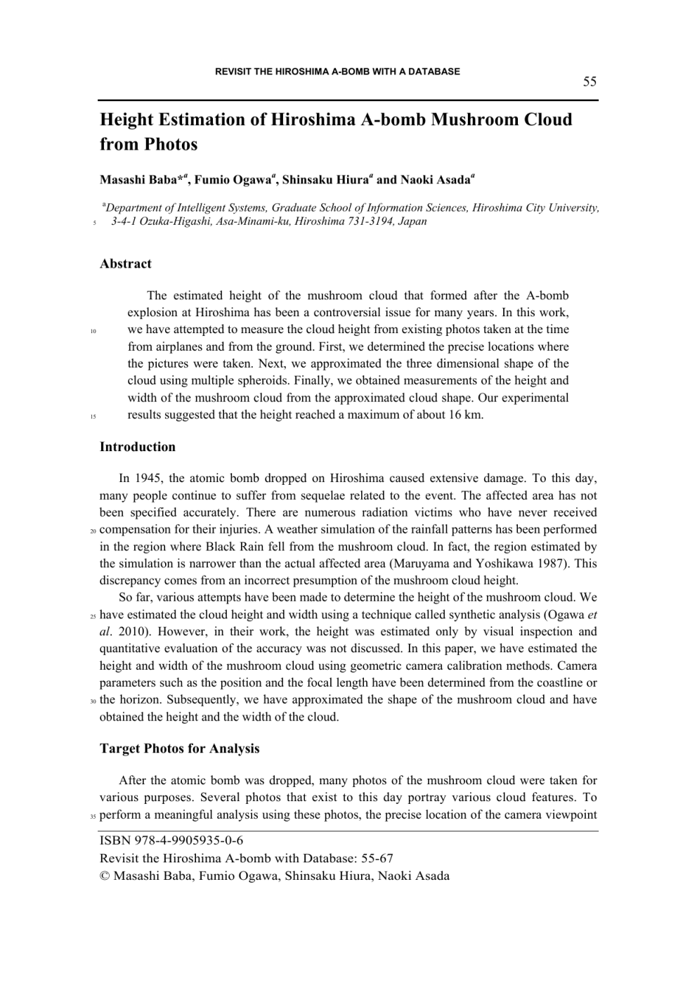 REVISIT THE HIROSHIMA A-BOMB WITH A DATABASE 55 Height Estimation of Hiroshima A-bomb Mushroom Cloud from Photos Masashi Baba*a, Fumio Ogawaa, Shinsaku Hiuraa and Naoki Asadaa a 5 Department of Intelligent Systems, Graduate School of Information Sciences, Hiroshima City University, 3-4-1 Ozuka-Higashi, Asa-Minami-ku, Hiroshima 731-3194, Japan Abstract 10 15 The estimated height of the mushroom cloud that formed after the A-bomb explosion at Hiroshima has been a controversial issue for many years. In this work, we have attempted to measure the cloud height from existing photos taken at the time from airplanes and from the ground. First, we determined the precise locations where the pictures were taken. Next, we approximated the three dimensional shape of the cloud using multiple spheroids. Finally, we obtained measurements of the height and width of the mushroom cloud from the approximated cloud shape. Our experimental results suggested that the height reached a maximum of about 16 km. Introduction In 1945, the atomic bomb dropped on Hiroshima caused extensive damage. To this day, many people continue to suffer from sequelae related to the event. The affected area has not been specified accurately. There are numerous radiation victims who have never received 20 compensation for their injuries. A weather simulation of the rainfall patterns has been performed in the region where Black Rain fell from the mushroom cloud. In fact, the region estimated by the simulation is narrower than the actual affected area (Maruyama and Yoshikawa 1987). This discrepancy comes from an incorrect presumption of the mushroom cloud height. So far, various attempts have been made to determine the height of the mushroom cloud. We 25 have estimated the cloud height and width using a technique called synthetic analysis (Ogawa et al. 2010). However, in their work, the height was estimated only by visual inspection and quantitative evaluation of the accuracy was not discussed. In this paper, we have estimated the height and width of the mushroom cloud using geometric camera calibration methods. Camera parameters such as the position and the focal length have been determined from the coastline or 30 the horizon. Subsequently, we have approximated the shape of the mushroom cloud and have obtained the height and the width of the cloud. Target Photos for Analysis After the atomic bomb was dropped, many photos of the mushroom cloud were taken for various purposes. Several photos that exist to this day portray various cloud features. To 35 perform a meaningful analysis using these photos, the precise location of the camera viewpoint ISBN 978-4-9905935-0-6 Revisit the Hiroshima A-bomb with Database: 55-67 © Masashi Baba, Fumio Ogawa, Shinsaku Hiura, Naoki Asada REVISIT THE HIROSHIMA A-BOMB WITH A DATABASE 56 is needed in each case. To estimate the point where each photo was taken, geographical features can be used as a means to find the specific locations. Among these features, we have used coastlines, horizontal lines and ridgelines of mountains as clues. We have acquired the geographical features of coastlines from maps and aerial photos taken around the time of the 5 event. Some of our analysis has relied on matching features of the coastline in a photo of the event to the features of the coastline in a control photo. The horizon alone cannot be used as a clue to determine camera position. However, the horizontal line of the horizon can be used as a constraint on the elevation angle so that the horizontal distance from the viewpoint to the hypocenter can be estimated from the photography altitude and the field of view. In addition to 10 these clues, it is necessary that the top of the cloud is included in the photo under examination. There are a limited number of photos that satisfy all of these conditions and can be used to analyze the dimensions of the mushroom cloud. The target photos for our analysis that contain the characteristics mentioned above are listed as follows. Photos in which coastlines appear 15 The images in which coastlines appear are shown in Figure 1. The coastline near Kurahashi Island is shown in the Figure 1 (a) and the coastline near the city of Hiroshima is shown in Figure 1 (b). In these cases, the camera position can be estimated by calculating the relationship between the coastline in the photo and the coastline on the map or the aerial photo. Photos taken with known altitude 20 25 These are images that have no clues specifying the location, yet the horizon is clearly indicated and the altitude is known, as shown in Figure 2. These photos were taken from the airplane that followed the bomber Enola Gay, which dropped the atomic bomb. Testimony about the altitude at the time of the photography was obtained from the photographer. From this testimony, the horizontal distance between the hypocenter and the airplane has been estimated. Photos in which the mountain ridge appears It is difficult to analyze photos taken from the ground because these contain few visible clues to use as a means to estimate the viewpoint. However, there exists an image of the event with a mountain ridge visible in the foreground, as shown in Figure 3. It is possible to use the mountain ridge as a means of comparison to estimate the location of the photo. 30 Viewpoint Estimation In this section, we describe the procedure for estimating the viewpoint of the photo of the event. This piece of information is the first stage in estimating the shape of the mushroom cloud. Viewpoint estimation by aligning the coastline To estimate the cloud size using coastline images, we have acquired corresponding points on 35 the coastline in the image and on the map as feature points. For these feature points, we have obtained the correspondence using the Iterative Closest Point (ICP) method (Besl and McKay 1992). Subsequently, we calculated the homography matrix between corresponding feature points, as shown in Figure 4. We then estimated t
