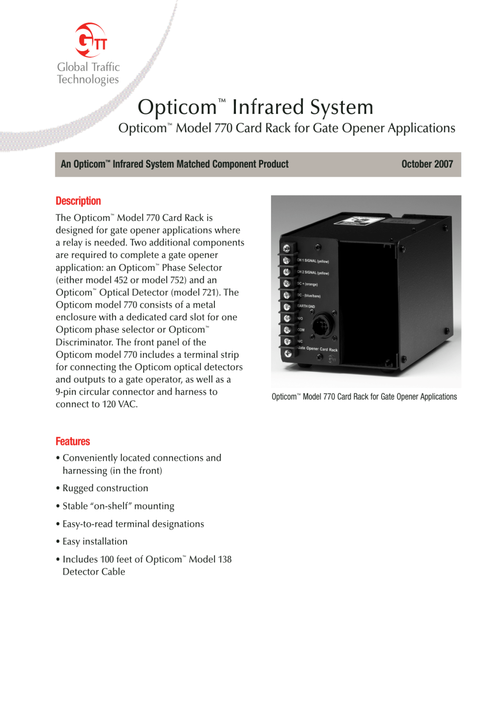 Opticom™ Infrared System Opticom™ Model 770 Card Rack for Gate Opener Applications An Opticom™ Infrared System Matched Component Product October 2007 Description The Opticom™ Model 770 Card Rack is designed for gate opener applications where a relay is needed. Two additional components are required to complete a gate opener application: an Opticom™ Phase Selector (either model 452 or model 752) and an Opticom™ Optical Detector (model 721). The Opticom model 770 consists of a metal enclosure with a dedicated card slot for one Opticom phase selector or Opticom™ Discriminator. The front panel of the Opticom model 770 includes a terminal strip for connecting the Opticom optical detectors and outputs to a gate operator, as well as a 9-pin circular connector and harness to connect to 120 VAC. Features • Conveniently located connections and harnessing (in the front) • Rugged construction • Stable “on-shelf” mounting • Easy-to-read terminal designations • Easy installation • Includes 100 feet of Opticom™ Model 138 Detector Cable Opticom™ Model 770 Card Rack for Gate Opener Applications TB1 Terminal Block Connections Physical Dimensions The terminal block on the front of the Opticom™ Model 770 Card Rack, TB1, is intended for primary optical detector connections for channels A, B, C and D. It is located on the left side of the Opticom model 770. Opticom™ Model 770 Card Rack Pin 1 2 3 4 5 6 7 8 Width: 5.25 in. (13.3 cm) Height: 5.25 in. (13.3 cm) Weight: 1.37 lbs. (620 g) Function Channel A detector signal input Channel B detector signal input Detector power (DC+) Earth ground (DC-) Earth ground Normally open contact (relay) Common contact (relay) Normally closed contact (relay) Relay Specification • Designed to actuate gate opener circuit • Designed to switch AC or DC • Includes normally open and closed contacts • Contact ratings: J1 Connector The J1 connector is intended to connect the gate opener system to AC power. It is located next to TB1. Pin 1 2 3 4 5 6 7 8 9 Length: 8.5 in. (21.6 cm) Function 115 VAC (AC+) AC return (AC-) Chassis ground Not used Not used Not used Not used Not used Not used Resistive —10A 240 VAC —10A 30 VDC General Use —7.5A 120 VAC —7.5A 240 VAC —7A 30 VDC —1/6 hp 120 VAC —1/3 hp 240 VAC Important Notice to Purchaser: EXCEPT FOR THE LIMITED WARRANTIES SET FORTH IN THIS DOCUMENT, GLOBAL TRAFFIC TECHNOLOGIES (GTT) MAKES NO OTHER WARRANTIES AND EXPRESSLY DISCLAIMS ALL OTHER WARRANTIES, WHETHER EXPRESS OR IMPLIED, INCLUDING, WITHOUT LIMITATION, ANY WARRANTY AS TO MERCHANTABILITY OR FITNESS FOR A PARTICULAR USE. GTT will, at its sole option, repair, replace or refund any amounts paid for any Opticom™ Infrared System component found to be defective in materials or manufacture within five (5) years from the date of shipment from GTT. See “Warranty and Extended Coverage” for details and limitations of the coverage plan. GTT will provide a functioning replacement component at a standard charge per unit for an additional five (5) years. GTT warrants future system operability coverage as described herein. The warranties set forth in this document shall not apply to (A) incandescent lamps (confirmation lights) or (B) any Opticom infrared system components which have been (1) repaired or modified by persons not authorized by GTT; (2) subjected to incorrect installation, misuse, neglect or accident; (3) damaged by extreme atmospheric or weather-related conditions; or (4) subjected to events or use outside the normal or anticipated course. IN NO EVENT SHALL GTT BE LIABLE FOR ANY INJURY (INCLUDING, WITHOUT LIMITATION, PERSONAL INJURY), DEATH, LOSS, OR DAMAGE (INCLUDING, WITHOUT LIMITATION, PROPERTY DAMAGE), WHETHER DIRECT, INDIRECT, INCIDENTAL, SPECIAL, CONSEQUENTIAL OR OTHERWISE, ARISING OUT OF THE USE OR INABILITY TO USE, REPAIR OR FAILURE TO REPAIR, ANY GTT PRODUCT, REGARDLESS OF THE LEGAL THEORY ASSERTED. THE REMEDIES SET FORTH IN THIS DOCUMENT ARE EXCLUSIVE. Sale and use of the Opticom infrared system is expressly restricted to authorized agencies of government customers, within their specific jurisdictions. However, because the infrared signal generated by the Opticom infrared system is not exclusive, GTT does not warrant exclusive activation by purchaser. Authorized users who desire to use or coordinate use of the Opticom infrared system with that of other jurisdictions must first obtain the prior written approval of each authorized user in the jurisdiction where use is sought. Global Traffic Technologies, LLC 7800 Third Street North St. Paul, Minnesota 55128-5441 1-800-258-4610 651-789-7333 www.gtt.com Global Traffic Technologies Canada, Inc. 157 Adelaide Street West Suite 448 Toronto, ON M5H 4E7 Canada 1-800-258-4610 Opticom is a trademark of Global Traffic Technologies, LLC. Used under license in Canada. Please recycle. Printed in U.S.A. © Global Traffic Technologies, LLC 2007, 2008 All rights reserved. 76-0100-1001-3 (B)
