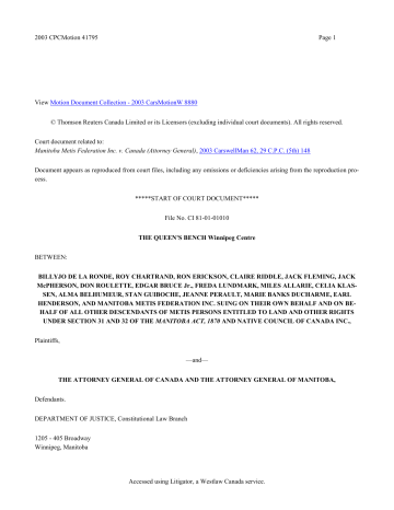 2003 CPCMotion 41795 Page 1 View Motion Document Collection - 2003 CarsMotionW 8880 © Thomson Reuters Canada Limited or its Licensors (excluding individual court documents). All rights reserved. Court document related to: Manitoba Metis Federation Inc. v. Canada (Attorney General), 2003 CarswellMan 62, 29 C.P.C. (5th) 148 Document appears as reproduced from court files, including any omissions or deficiencies arising from the reproduction process. *****START OF COURT DOCUMENT***** File No. CI 81-01-01010 THE QUEEN'S BENCH Winnipeg Centre BETWEEN: BILLYJO DE LA RONDE, ROY CHARTRAND, RON ERICKSON, CLAIRE RIDDLE, JACK FLEMING, JACK McPHERSON, DON ROULETTE, EDGAR BRUCE Jr., FREDA LUNDMARK, MILES ALLARIE, CELIA KLASSEN, ALMA BELHUMEUR, STAN GUIBOCHE, JEANNE PERAULT, MARIE BANKS DUCHARME, EARL HENDERSON, AND MANITOBA METIS FEDERATION INC. SUING ON THEIR OWN BEHALF AND ON BEHALF OF ALL OTHER DESCENDANTS OF METIS PERSONS ENTITLED TO LAND AND OTHER RIGHTS UNDER SECTION 31 AND 32 OF THE MANITOBA ACT, 1870 AND NATIVE COUNCIL OF CANADA INC., Plaintiffs, —and— THE ATTORNEY GENERAL OF CANADA AND THE ATTORNEY GENERAL OF MANITOBA, Defendants. DEPARTMENT OF JUSTICE, Constitutional Law Branch 1205 - 405 Broadway Winnipeg, Manitoba Accessed using Litigator, a Westlaw Canada service. 2003 CPCMotion 41795 Page 2 R3C 3L6 Holly Penner Telephone: (204) 945-0679 Facsimile: (204) 945-0053 AFFIDAVIT OF HEATHER LEONOFF, Q.C. Affirmed the 14 th day of December, 2001 Hearing Date: Tuesday, January 8th, 2002 at 10:00 a.m. DEPARTMENT OF JUSTICE Constitutional Law Branch 1205 - 405 Broadway Winnipeg, Manitoba R3C 3L6 Holly Penner Telephone: (204) 945-0679 Facsimile: (204) 945-0053 THE QUEEN'S BENCH Winnipeg Centre BETWEEN: BILLYJO DE LA RONDE, ROY CHARTRAND, RON ERICKSON, CLAIRE RIDDLE, JACK FLEMING, JACK McPHERSON, DON ROULETTE, EDGAR BRUCE Jr., FREDA LUNDMARK, MILES ALLARIE, CELIA KLASSEN, ALMA BELHUMEUR, STAN GUIBOCHE, JEANNE PERAULT, MARIE BANKS DUCHARME, EARL HENDERSON, AND MANITOBA METIS FEDERATION INC. SUING ON THEIR OWN BEHALF AND ON BEHALF OF ALL OTHER DESCENDANTS OF METIS PERSONS ENTITLED TO LAND AND OTHER RIGHTS UNDER SECTION 31 AND 32 OF THE MANITOBA ACT, 1870 AND NATIVE COUNCIL OF CANADA INC., Plaintiffs, —and— THE ATTORNEY GENERAL OF CANADA AND THE ATTORNEY GENERAL OF MANITOBA, Defendants. Accessed using Litigator, a Westlaw Canada service. 2003 CPCMotion 41795 Page 3 AFFIDAVIT OF HEATHER LEONOFF I, HEATHER LEONOFF, of the City of Winnipeg, in the Province of Manitoba, lawyer, AFFIRM THAT: 1. I am Counsel with the Constitutional Law Branch of the Department of Justice for the Province of Manitoba and I have had conduct of this litigation since September, 1998. As a result of having had conduct of this litigation, and having reviewed the file created prior to my assuming conduct of this litigation, I have personal knowledge of the facts and matters hereinafter deposed to by me except where those facts are stated to be on information and belief. 2. The Statement of Claim was originally filed in this matter on April 15th, 1981. I have informed myself by reviewing the file and do believe that from that date to this the following concrete steps have been taken in this litigation:a) On July 17th, 1981, the defendant Attorney General of Canada filed a Statement of Defence;b) On August 26th, 1981, the plaintiffs filed an Amended Statement of Claim;c) On January 25th, 1982, the defendant Attorney General of Manitoba filed a Statement of Defence;d) On January 8th, 1987, the plaintiffs filed a Further Amended Statement of Claim;e) On February 18th, 1987, Justice Barkman of the Court of Queen's Bench dismissed the motion of the Attorney General of Canada to strike the plaintiffs' Statement of Claim;f) On March 3rd, 1987, the plaintiffs filed a Further Amended Statement of Claim which appears to be identical to the January 8th, 1987 Further Amended Statement of Claim;g) On June 17th, 1988, the Manitoba Court of Appeal reversed the decision of Justice Barkman and struck the plaintiffs' Statement of Claim as against the Attorney General of Canada;h) On March 2nd, 1990, the Supreme Court of Canada allowed the plaintiffs' appeal and reversed the decision of the Manitoba Court of Appeal;i) On October 29th, 1990 and October 30th, 1990 respectively, the Attorneys General of Manitoba and Canada brought motions for particulars;j) On December 20th, 1990, both motions were dismissed by Justice Schwartz of the Court of Queen's Bench;k) On February 9th, 1991, an Order was signed allowing the plaintiffs to file another Amended Statement of Claim. It is not clear from the Court pocket whether this Amended Statement of Claim was ever filed;l) On December 30th, 1991, the Court of Appeal reversed the decision of Justice Schwartz and ordered that particulars be provided;m) On September 1st, 1992, the plaintiffs filed particulars;n) On December 24th, 1992, the Attorney General of Canada filed a Statement of Defence to the Amended Statement of Claim;o) In March, 1995, the plaintiffs served an Affidavit of Documents;p) On October 31st, 1995, the plaintiffs filed a Further Amended Statement of Claim;q) In December, 1997, the Attorney General of Canada served an Affidavit of Documents; andr) In March, 2001, the Attorney General of Manitoba served an Affidavit of Documents. 3. The Statement of Claim filed on January 8th and March 3rd, 1987 contains two allegations of particular concern to the Attorney General of Manitoba. The first is the allegation in paragraph 7 that the impugned federal and provincial legislation "had the purpose and effect of stripping the Metis of the land base promised to them under sections 31 and 32 of the Manitoba Act, 1870". The second is the allegation in paragraph 13 that "[a]pproximately 85% of Metis persons entitled to rights under sections 31 and 32 of the Manitoba Act failed to receive or were deprived of such rights by reason of this unconstitutional federal and provincial legislation purporting to al