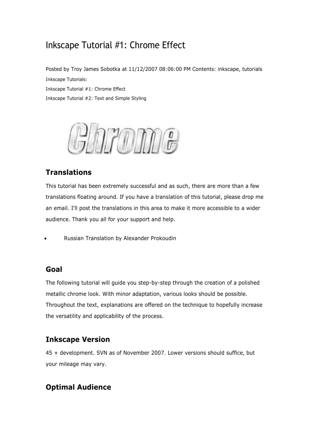 Inkscape Tutorial #1: Chrome Effect Posted by Troy James Sobotka at 11/12/2007 08:06:00 PM Contents: inkscape, tutorials Inkscape Tutorials: Inkscape Tutorial #1: Chrome Effect Inkscape Tutorial #2: Text and Simple Styling Translations This tutorial has been extremely successful and as such, there are more than a few translations floating around. If you have a translation of this tutorial, please drop me an email. I'll post the translations in this area to make it more accessible to a wider audience. Thank you all for your support and help. Russian Translation by Alexander Prokoudin Goal The following tutorial will guide you step-by-step through the creation of a polished metallic chrome look. With minor adaptation, various looks should be possible. Throughout the text, explanations are offered on the technique to hopefully increase the versatility and applicability of the process. Inkscape Version 45 + development. SVN as of November 2007. Lower versions should suffice, but your mileage may vary. Optimal Audience This tutorial assumes that you are an intermediate Inkscape user. A basic knowledge of Inkscape's functionality will be useful to speed through the tutorial. It is assumed that you are relatively familiar with Inkscape's various tool positions and how to use them. Background Chroming became extremely pervasive in the early 1950s. Later, the technique was used in the 'Boraxification" of all things, subject to a damning critique by Edgar Kaufmann in Architectural Review titled "Borax, or the Chromium Plated Calf"(1). The trend died towards the late 1950s. As with all things, that which is old becomes new again... Chrome effects exhibit the following common characteristics: 1. Specular highlights. Sharp curves result in steep changes in gradation. Flat surfaces often exhibit smooth gradients. We will utilize sharp edges and soft blurs to attain the complexity of a chromed object. 2. Three dimensionality. Chrome exists in our 'real world'. We will apply a simple 3D techniques to sell the effect. 3. Irregularity. Tightly bound with (1) above, the reflections generated on a chrome surface vary from angle to angle. Further along this path, the reflections are often somewhat randomly dictated by the surroundings. We will use a non-uniform gradient that is 'reflected' as the easiest way to accomplish this irregularity. Variations The following technique will be a 'studio' presentation of chrome. It is assumed that the light sources and surroundings are either entirely black or white, as they might be were you to photograph a chrome object under a studio setting. Variations on the following technique might include: 1. Adjusting the colour values of the gradients to indicate sky or ground. This technique was used extensively in airbrushing renditions of chrome. 2. Adjusting the width of blurs to change the feeling of the 3D underlying object. This may be used in conjunction with clip masks to control the spill. 3. Adjusting the directionality of light / perspective. Move the 3D effect around to suit your needs. Technique Step 1: Choose your font / shape. Select a font. Our example uses "Impact" stretched to 158 points. To ease organization, locate the basic font shape on a separate layer called "Base Text". Step 2: Add the primary 3D layer. To accomplish this, select your base text / shape from step #1 and choose "Linked Offset" from the path menu. This will immediately create a 'cloned' offset attached to our base text. Inkscape will locate the 'clone' below the basic shape. After selecting "Linked Offset", fill the offset with pure white and raise the object using "Page Up" via the menu or key. Cut this object and paste it into a new layer called "3D Extrusion". Create the three dimensionality by slightly shifting the white "Linked Offset" object up and to the left. Step 3: Add a secondary 3D gradient shape layer. This will become our subtle gradient shape. We will create a "Linked Offset" from the "Base Text" object created above. Select the "Base Text" object and from the path menu again, select "Linked Offset". Set this objects fill to black, cut it, and paste it into a new layer above the other two called "Subtle Gradient". You will want to make this shape smaller than the white by a decent margin to accomodate blurring. Step 4: Create a repeating gradient on the "Subtle Gradient" and create our "utility" gradient in the process. As with our note under "Background", we will use subtle gradients on our flat surface "Subtle Gradient" and sharper transitions on the steeper 3D edge of "Base Text". To do this, we must first create our multi-purpose gradient object. Select the "Linked Object" on our "Subtle Gradient" layer. Select the "Fill" tab from the "Fill and Stroke" options. Select "Radial Gradient" from the toolbox and set the "Repeat" combo box to "Reflected". Click the "Edit..." button to pull up the gradient editing tool dialog. Add two stops by clicking the "Add Stop" button in the dialog. Choose the "Create and Edit Gradients" tool from the toolbox on the left to bring up the interactive gradient editor. At this point you will have the 'L' shaped interactive gradient gripper visible. The first stop at the centre will be black -- the base tone of our original fill. The following three stops will vary in opacity to transparent. Select the second stop from the centre, and choose pure white as the colour. Select our third stop, and choose pure black. Finally, select the fourth and last stop and choose pure black again. Step 5: Stretch the gradient and fine tune the stops. Using either the interactive gradient tool or the dialog, adjust the offset of the white intermediate stop to about 30% (0.30 in the dialog) and the offset of the intermediate black stop to about 90% (0.90 in the dialog). This is a rough guess, and as you become more adventurous, you will want to experiment with the values yourself. Using the interactive gradient tool, stretch the gradient out such that you achie