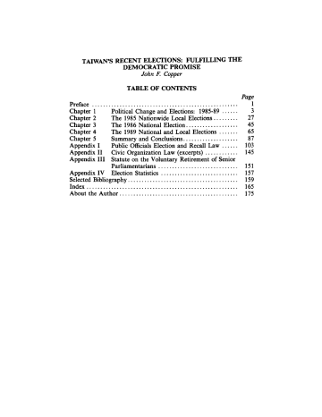 TAIWAN'S RECENT ELECTIONS: FULFILLING THE DEMOCRATIC PROMISE John F. Copper TABLE OF CONTENTS Preface . . . . . . . . . . . . . . . . . . . . . . . . . . . . . . . . . . . . . . . . . . . . . . . . . . . . . Chapter 1 Political Change and Elections: 1985-89 . . . . . . Chapter 2 The 1985 Nationwide Local Elections......... Chapter 3 The 1986 National Election. . . . . . . . . . . . . . . . . . . Chapter 4 The 1989 National and Local Elections . . . . . . . Chapter 5 Summary and Conclusions. . . . . . . . . . . . . . . . . . . . Appendix I Public Officials Election and Recall Law . . . . . . Appendix II Civic Organization Law (excerpts) . . . . . . . . . . . . Appendix III Statute on the Voluntary Retirement of Senior Parliamentarians . . . . . . . . . . . . . . . . . . . . . . . . . . . . . Appendix IV Election Statistics . . . . . . . . . . . . . . . . . . . . . . . . . . . . Selected Bibliography . . . . . . . . . . . . . . . . . . . . . . . . . . . . . . . . . . . . . . . . Index....................................................... About the Author . . . . . . . . . . . . . . . . . . . . . . . . . . . . . . . . . . . . . . . . . . . Page 1 3 27 45 65 87 103 145 151 157 159 165 175 PUBLISHER'S NOTE Chapters 2, 3 and 4 of this work were taken from articles written by the author and previously published in the following journals: Chapter 2, Asian Affairs, Spring 1986, pp. 27-45 Chapter 3, Asian Thought and Society, July 1987, pp. 115-136 Chapter 4, Journal of Northeast Asian Studies, Spring 1990, pp. 22-40 The publisher wishes to thank these journals for permissions granted. The articles were edited or shortened for use here. PREFACE In 1984, the author, with Professor George P. Chen, published the book Taiwan's Elections: Political Development and Democratization in the Republic of China. We assessed Taiwan's political system as it related to election politics, early local elections, national supplementary elections beginning in 1969, and the watershed competitive national election in 1980--which inaugurated democratic politics in Taiwan at the national level. That work also included a chapter on the 1983 national election, which proved to many observers that the 1980 election had not been just a show offered during an "election holiday" or a temporary democratic event. The present volume covers the elections since 1983. Included are the nationwide national election in 1985, the first two-party election in Taiwan's history (or for that matter ever in a Chinese nation) in 1986, and the "dual" 1989 election-which many observers perceived to be another breakthrough-perhaps the final step in routinizing a competitive election process that will serve as the foundation for a fully democratic system. Hence, three different kinds of elections are assessed in this work: an election of local officials, a national election of both of the major elective bodies (the Legislative Yuan and the National Assembly), and a "combination" election of the Legislative Yuan and local offices. All, however, were national and of lasting influence. During the period covered, a number of events occurred that changed the electoral processes and profoundly influenced politics in the Republic of China. Most were calculated; some were not. Several were formalized in legislative acts. These changes are discussed in Chapter 1. It is almost axiomatic to say that elections have been a major contributing force behind the democratization process in Taiwan. The discussions in the chapters 2, 3, and 4 will so indicate. The analyses of these elections reflect, in the opinion of the author, that the Republic of China is a transformed nation: from authoritarianism to near or perhaps even full democracy. That transition has been rapid. It may have been faster than the democratization process in any nation in recent history where violence and upheaval have not been a part of the process. For that reason Taiwan may be a unique model of political modernization. (1) 2 CONTEMPORARY ASIAN STUDIES SERIES The author wishes to thank Professor George P. Chen for sharing his wisdom on both the issues and the elections themselves and June T. Dreyer, who organized and led two of the election observer teams in which I participated when I saw firsthand the 1986 and the 1989 elections. I also want to express my gratitude to the Pacific Cultural Foundation for support that helped make possible the publishing of this work. I will assume responsibility for any errors herein. John F. Copper Memphis, Tennessee CHAPTER 1 INTRODUCfiON POLITICAL CHANGE AND TAIWAN'S ELECTIONS1985-89 Taiwan, or the Republic of China, is a nation that has clearly experienced profound and broad political change in recent years. It has probably experienced political modernization at a faster rate of speed than any other nation in the world, at least among those that did not self-destruct or fail in an effort to democratize. Certainly few would disagree that political change in Taiwan has been phenomenal and has changed electoral politics in that country. However, this writer can only attempt in cursory fashion to relate elections to political development in general. This was done in some detail in the previous volume on Taiwan's elections. 1 Suffice it to say in the way of background that the two are intimately related, and they are related not only by chance, but also by design: Sun Yat-sen, the father of Republican China, put election politics in a central place in his teachings about political modernization and democracy. His plan, most would say, has been largely fulfilled; at least it is proceeding quickly along that path. In this work the author will discuss other more specific relationships: between recent elections and past elections; the role of new political parties, especially the Democratic Progressive Party; the impact of terminating martial law; other important political reforms; the effect of Chiang Ching-kuo's death; Nationalist Party or Kuomintang (KMT) int