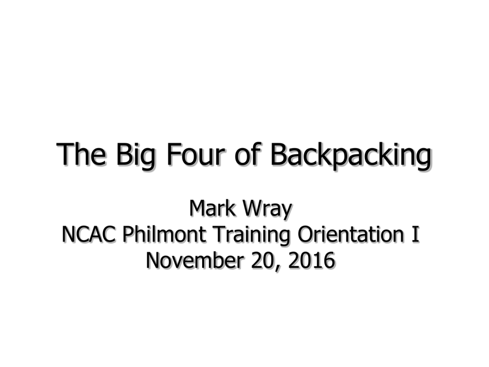 The Big Four of Backpacking Mark Wray NCAC Philmont Training Orientation I November 20, 2016 Preview ► Packs ► Sleeping Bags ► Boots ► Clothing & Raingear 2 Types of Packs External Frame ► Cheaper ► Spaced from back Cooler Tolerates lumps More freedom packing ► ► “Some gear outside More pockets Internal Frame ► Close to back Hotter Careful packing required Trade-offs ► Gear both inside & outside Packs, con’t… Size ► Must be adequate for both personal and crew gear! ► Recommend Min. of 4500 cu in min ► Remember to try on many different packs Sleeping Bags Buy the bag you will use year around Mummy Less room Less to heat Hooded lighter Rectangular More room No hood Heavier Sleeping Bags Down ► Warmest ► Lightest ► Looses insulation ability when wet ► Very hard to dry Synthetic ► Warm enough ► Light enough ► Reasonable value when wet Ground Pads ¾ length ground pad suggested for Philmont Closed-cell foam ► Water proof ► Cheap ► Lightest ► Indestructible ► Packs quickly Self-inflating ► More expensive ► Heavier ► Slightly more comfortable ► Adults prefer Boots & Socks •Lightest boot capable of handling trails and loads you’ll have •Remember your weight is going to be you plus your pack (Approx 50lbs) Leather ► More expensive ► Careful break in ► Heavier Fabric & Leather ► Less expensive ► Not waterproof ► Lighter ► Minimal break-in Boots & Socks Fitting ► It’s the fit not the size ► Wear 2 pair socks- thin synthetic liner, midweight wool. ► No toe contact with front on incline ► Walk around- does it feel right? Rain Gear Suggested: Two piece Rainsuit Objective- stay warm & dry Not worth it to go cheap Look for Nylon w/ Gortex Pack small Pants with side zips and/or boot zips Clothing ► NO COTTON! ► Minimum requirement 50/50 blend ► Recommend nylon quick dry clothing Questions? About: ► Packs ► Sleeping Bags ► Boots ► Clothing & Raingear