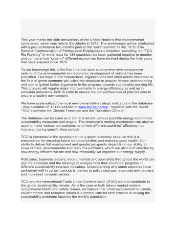 This year marks the 40th anniversary of the United Nation’s first environmental conference, which was held in Stockholm in 1972. The anniversary will be celebrated with a pre-conference two months prior to the "earth summit" in Rio. TCO (The Swedish Confederation of Professional Employees) is therefore launching the "TCO Rio Ranking" in which data for 134 countries has been gathered together to monitor and compare how "greenly" different economies have evolved during the forty years that have elapsed since 1972. To our knowledge this is the first time that such a comprehensive comparative ranking of the environmental and economic development of nations has been published. Our hope is that researchers, organizations and other actors interested in the field of green economy will utilize the database to acquire deeper understanding and also to gather better arguments in the progress towards sustainable working life. This process will require major improvements in energy efficiency as well as in emission reductions, both in order to secure the competitiveness of jobs but also to ensure a healthy environment. We have systematized the most environmentally strategic indicators in the database - now available on TCO's website at www.tco.se/riorank - together with the report “TCO examines the Climate Transition and the Transition Climate”. The database can be used as a tool to evaluate various possible energy economics sustainability measures and targets. The database’s ranking mechanism can also be used to make various comparisons as to how different countries’ efficiency has improved during specific time periods. TCO is interested in the development of a green economy because this is a precondition for securing future job opportunities and ensuring good health. Our ability to deliver full employment and greater prosperity depends on our ability to solve climate, environmental and resource problems, which are all in turn affected by how energy efficient we are and how renewably we organize our energy supply. Politicians, business leaders, trade unionists and journalists throughout the world can use the database and the rankings to analyze how their countries’ progress in different sustainability-relevant indicators. Understanding why some countries have performed well in certain periods is the key to policy changes, improved environment and increased competitiveness. TCO and the International Trade Union Confederation (ITUC) want to contribute to the global sustainability debate. As is the case in both labour market matters, occupational health and safety issues, we believe that union involvement in climate, environmental and resource issues is a prerequisite for best practice in solving the sustainability problems faced by the world’s population. The database is hereby made available in order to enable anyone interested to use the data and advocate the importance of improvements there they live and work. Measuring, setting targets, and evaluating outcomes will force decision-makers to come up with - not just pretty words - but concrete plans and actions that can change reality and secure sustainable development. Efforts to create sustainable development must take place globally within the UN framework, through responsible national policies in all countries, and via the involvement of business leaders and unions in all workplaces. TCO and ITUC want to contribute to all of these processes and demonstrate the desire to be involved and to take responsibility for the necessary transition. One way of achieving this has been to produce, present and make openly accessible the above-mentioned database.