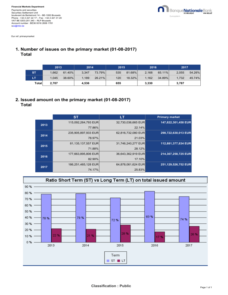 Financial Markets Department Payments and securities Securities Settlement Unit boulevard de Berlaimont 14 – BE-1000 Brussels Phone : +32 2 221 22 17 – Fax : +32 2 221 31 20 VAT BE 0203.201.340 – RLP Brussels Account number : BE36 0016 2658 1781 [email protected] Our ref: primarymarket 1. Number of issues on the primary market (01-08-2017) Total 2013 2014 2015 2016 2017 ST 1,662 61.40% 3,347 73.79% 535 81.68% 2,168 65.11% 2,055 54.26% LT 1,045 38.60% 1,189 26.21% 120 18.32% 1,162 34.89% 1,732 45.74% Total 2,707 4,536 655 3,330 3,787 2. Issued amount on the primary market (01-08-2017) Total ST 2013 2014 2015 2016 2017 LT Primary market 115,092,264,793 EUR 32,730,036,665 EUR 77.86% 22.14% 235,905,897,933 EUR 62,816,732,080 EUR 78.97% 21.03% 81,135,137,557 EUR 31,746,240,277 EUR 71.88% 28.12% 177,663,895,806 EUR 36,643,362,919 EUR 82.90% 17.10% 186,251,465,128 EUR 64,878,061,624 EUR 74.17% 25.83% Classification : Public 147,822,301,458 EUR 298,722,630,013 EUR 112,881,377,834 EUR 214,307,258,725 EUR 251,129,526,752 EUR Page 1 of 1 Financial Markets Department Payments and securities Securities Settlement Unit boulevard de Berlaimont 14 – BE-1000 Brussels Phone : +32 2 221 22 17 – Fax : +32 2 221 31 20 VAT BE 0203.201.340 – RLP Brussels Account number : BE36 0016 2658 1781 [email protected] Our ref: primarymarket 1. Number of issues on the primary market (01-08-2017) Belgian Government Securities* 2013 2014 2015 2016 2017 ST 148 13.07 % 218 17.02 % 287 72.29 % 124 10.87 % 289 15.14 % LT 984 86.93 % 1,063 82.98 % 110 27.71 % 1,017 89.13 % 1,620 84.86 % Total 1,132 1,281 397 1,141 1,909 2. Issued amount on the primary market (01-08-2017) Belgian Government Securities* ST 2013 2014 2015 2016 2017 LT Primary market 48,418,408,147 EUR 21,858,070,947 EUR 68.90 % 31.10 % 88,425,582,759 EUR 40,686,662,026 EUR 68.49 % 31.51 % 67,620,971,953 EUR 29,973,581,400 EUR 69.29 % 30.71 % 49,708,464,704 EUR 20,884,852,908 EUR 70.42 % 29.58 % 64,867,535,355 EUR 42,375,669,501 EUR 60.49 % 39.51 % 70,276,479,094 EUR 129,112,244,785 EUR 97,594,553,353 EUR 70,593,317,612 EUR 107,243,204,856 EUR * securities without issuance program Classification : Public Page 1 of 1 Financial Markets Department Payments and securities Securities Settlement Unit boulevard de Berlaimont 14 – BE-1000 Brussels Phone : +32 2 221 22 17 – Fax : +32 2 221 31 20 VAT BE 0203.201.340 – RLP Brussels Account number : BE36 0016 2658 1781 [email protected] Our ref: primarymarket 1. Number of issues on the primary market (01-08-2017) Commercial Paper* 2013 2014 2015 2016 2017 ST 1,515 96.01 % 3,130 96.04 % 249 95.77 % 2,045 93.29 % 1,766 93.99 % LT 63 3.99 % 129 3.96 % 11 4.23 % 147 6.71 % 113 6.01 % Total 1,578 3,259 260 2,192 1,879 2. Issued amount on the primary market (01-08-2017) Commercial Paper* ST 2013 2014 2015 2016 2017 LT Primary market 66,673,856,646 EUR 10,871,965,718 EUR 85.98 % 14.02 % 147,480,315,174 EUR 22,130,070,054 EUR 86.95 % 13.05 % 13,514,165,604 EUR 1,772,658,877 EUR 88.40 % 11.60 % 127,955,431,102 EUR 15,758,510,010 EUR 89.03 % 10.97 % 121,383,929,774 EUR 22,502,392,123 EUR 84.36 % 15.64 % 77,545,822,364 EUR 169,610,385,228 EUR 15,286,824,481 EUR 143,713,941,113 EUR 143,886,321,896 EUR * securities with an issuance program Classification : Public Page 1 of 1