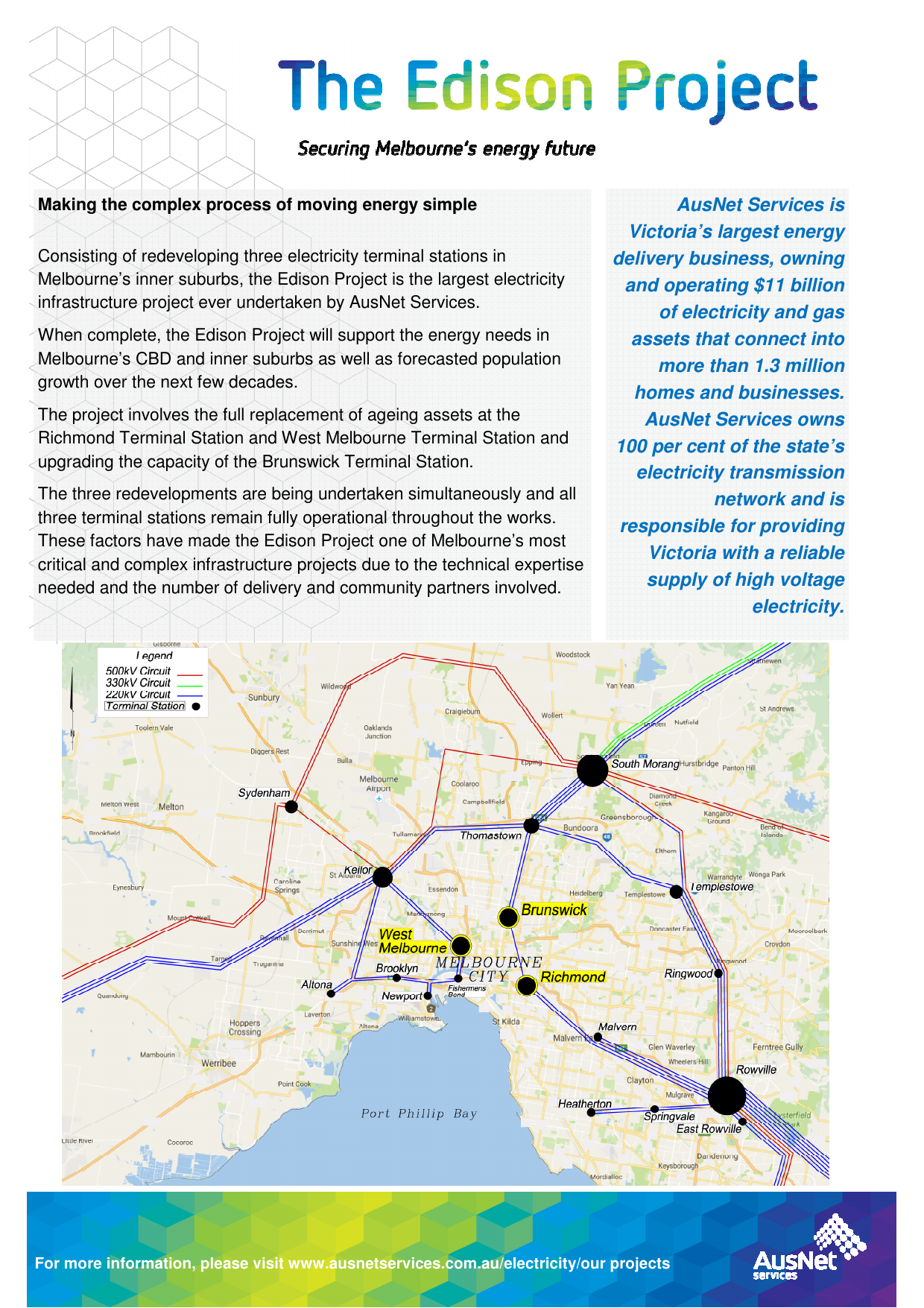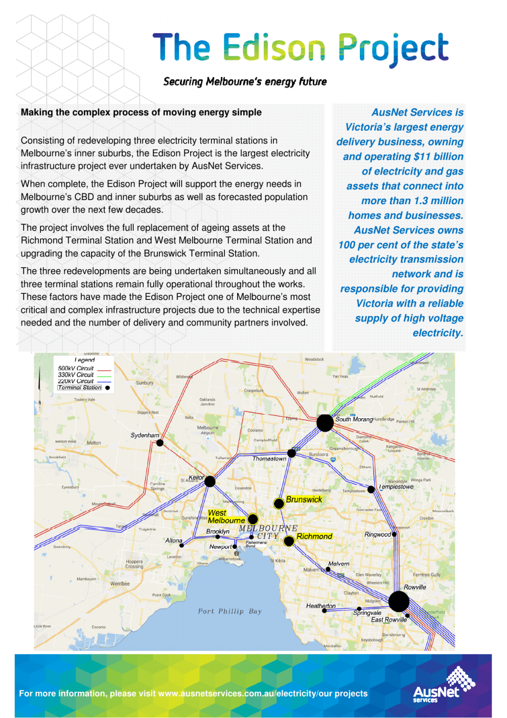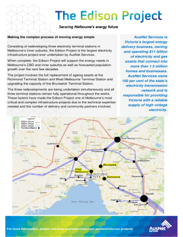 Making the complex process of moving energy simple Consisting of redeveloping three electricity terminal stations in Melbourne’s inner suburbs, the Edison Project is the largest electricity infrastructure project ever undertaken by AusNet Services. When complete, the Edison Project will support the energy needs in Melbourne’s CBD and inner suburbs as well as forecasted population growth over the next few decades. The project involves the full replacement of ageing assets at the Richmond Terminal Station and West Melbourne Terminal Station and upgrading the capacity of the Brunswick Terminal Station. The three redevelopments are being undertaken simultaneously and all three terminal stations remain fully operational throughout the works. These factors have made the Edison Project one of Melbourne’s most critical and complex infrastructure projects due to the technical expertise needed and the number of delivery and community partners involved. AusNet Services is Victoria’s largest energy delivery business, owning and operating $11 billion of electricity and gas assets that connect into more than 1.3 million homes and businesses. AusNet Services owns 100 per cent of the state’s electricity transmission network and is responsible for providing Victoria with a reliable supply of high voltage electricity. For more information, please visit www.ausnetservices.com.au/electricity/our projects Focus on: Brunswick Terminal Station The Project The Brunswick Terminal Station began operation in 1939 to service the local area. It is now undergoing a $200M+ upgrade so that it can help secure the future energy needs of Melbourne’s increasing population. Previously, the station supplied 22 kV to the local inner northern distribution network which services about 25,000 customers. It was predominately an outdoor Air Insulated Switchgear (AIS) Terminal Station. When the project is complete, the facility will be expanded to supply both 22 kV and 66 kV and will service an additional 65,000 customers using three new 225 MVA B transformers. World-class design While the focus of the project is increasing the capacity of the site, work is also being done to decrease the site’s footprint and improve the appearance to suit the surrounds. The project involves replacing the existing AIS equipment with compact Gas Insulated Switchgear, that will be hidden inside architecturally-designed buildings. Extensive landscaping will further soften the industrial site’s interface with its residential and parkland setting. Similarly, the undergrounding of the 220 kV into the site has allowed for the removal of a tower line that used to dominate our neighbours’ views (see photo). Also removed was a redundant three storey machine hall building, an old control room and Air Insulated Switchyards. Community Engagement and Environmental Management Community engagement has been a key consideration in the design and construction process. This has been critical given the quiet residential setting with neighbours living just a few metres to the south and west. Project Manager, Stephen Perera joins locals to witness the removal of the existing onsite transmission tower Concept view of Richmond Terminal Stationand Adding to the importance of careful stakeholder environmental management is the parkland that is next to the site to the north and east. This much-valued public open space contains a flood-prone waterway, abundant birdlife and vegetation, cycle and pedestrian paths, and other popular recreation facilities. The project team undertakes monthly doorknocking, regular newsletter drops and participates in a Community Reference Group that was set up for the Project. Commitment to safety The Brunswick Terminal Station Upgrade has required careful coordination and management of various delivery partners while maintaining full station operations and supply. AusNet Services’ Senior Project Manager, Stephen Perera said that: “Safety has been paramount throughout the project with 1,400 days with no lost time injuries and no medical treatment injuries. Considering the complexities presented by having more than 170 personnel onsite during busy times, achieving this safety record required the utmost diligence and adherence to all safety measures implemented onsite”. Concept view of Brunswick Terminal Station Connect with us @AusNet Services AusNet Services Concept view of the finished Brunswick Terminal Station