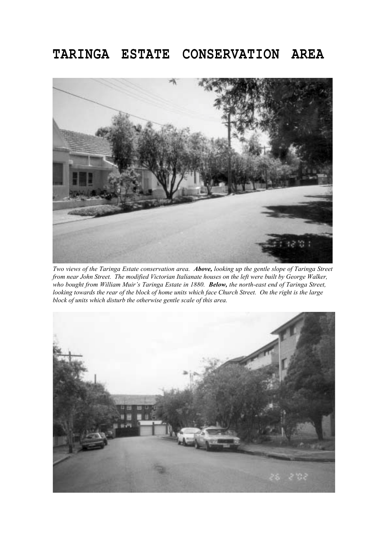 TARINGA ESTATE CONSERVATION AREA Two views of the Taringa Estate conservation area. Above, looking up the gentle slope of Taringa Street from near John Street. The modified Victorian Italianate houses on the left were built by George Walker, who bought from William Muir’s Taringa Estate in 1880. Below, the north-east end of Taringa Street, looking towards the rear of the block of home units which face Church Street. On the right is the large block of units which disturb the otherwise gentle scale of this area. TARINGA ESTATE CONSERVATION AREA 1 Boundary This Conservation Area is centred on the historic property ‘Taringa’ which in 1880 gave its name to the Taringa Estate. It comprises the 17 properties addressing the two arms of Taringa Street, 11 properties along John Street north-west from Alt Street, and five properties along Alt Street north-east from John Street. The part of Taringa Street running north-east from John Street was formerly known as Princes (sometimes Princess) Street. The Alt Street end of Taringa Street is now closed by a small reserve. There are three prominent corner sites, one occupied by the house ‘Taringa’ (No 4 Taringa Street), one by the house ‘Amesbury’ (78 Alt Street) and the other by a block of home units (9-11 Taringa Street). 2 Historical notes and description This area is part of a grant of 280 acres of land made to Augustus Alt in 1810, which by about 1820 had been acquired by Joseph Underwood and incorporated into his Ashfield Park Estate.1 William Muir purchased about five acres of Underwood’s land in 1860 and had built the first part of the house ‘Taringa’ by 1865. Muir became an alderman of Ashfield Municipality.2 In 1880 he subdivided his land into building allotments surrounding the house, which were offered for sale on behalf of ‘Mr Alderman Muir’ by Richardson & Wrench and shown on a map by Ferdinand Reuss, architect and surveyor.3 The footprint of the house is shown on that map and also on the Higinbotham & Robinson map of Ashfield published in 1883.4 On these maps the east-west arm of Taringa Street, branching off John Street, is shown as Princes Street and is shorter than it now is. Six lots faced Alt Street, eight faced John Street, four faced Princes Street and six, including the one containing Taringa, faced Taringa Street. The land sold well, more than half being bought by George Baker Walker, an accountant and general manager of the Land Company of Australasia Ltd. Walker also moved into ‘Taringa’, which was on Allotment 23. Right, a reduced copy of the Taringa Estate plan, as sketched in Journal No 1 of the Ashfield & District Historical Society. The original was prepared by Ferdinand Reuss, architect and surveyor, for the auction sale held in 1880. 1 2 3 4 Ashfield Heritage Study 1993, vol 1, pp 32, 36. Ashfield & District Historical Society Journal, No 1, p 12-17. Taringa Estate Subdivision Plan, in the collection of Ashfield & District Historical Society. Ashfield Heritage Study 1993, vol 2, reference No 258. The Higinbotham & Robinson map is at Ashfield Council Archives. Above: A detail of the Higinbotham & Robinson map of 1883, showing one of the the two arms of the present Taringa Street called Princes Street. Below: An extract from the H E C Robinson map of about 1912, showing the area of William Muir’s estate as enlarged by George Baker Walker in about 1880. Above, a detail of the planning scheme map, showing the Taringa Estate conservation area in its present-day context. Walker re-subdivided four of his lots into five, on which he built the Italianate houses at Nos 21-29 Taringa Street, including two interesting though now compromised semidetached pairs. Three lots on the north-east side of Taringa Street were lengthened to the north-east and re-subdivided into seven lots, on one of which, at the Alt Street corner, the famous engineer Norman Selfe erected his fine house ‘Amesbury’ in 1887.5 Alt sold his tennis court land in 1913 and on it was erected the house ‘Roselea’, 1 Taringa Street. ‘Warringulla’, the house standing at No 11 John street, at the corner of Alt Street, was built by the surveyor Thomas Melrose, who bought this allotment at the 1880 auction. Alfred Crane built his home ‘Wynella’ on the two Alt Street allotments which he also bought at the auction; it is the house still standing at No 76 Alt Street. The Victorian Regency house at No 23 John Street is most likely the one built by Elizabeth Lyttle on the lots she purchased at the same auction.6 Its style suggests the possibility that it was designed by Ferdinand Reuss, who was the architect-surveyor commissioned by William Muir to plan the Taringa subdivision. Interestingly, this house is similar in style to the one at No 27 John Street, leading to speculation that No 27 could also have been Ferdinand Reuss’s work. Early in the 20th century Princes Street had been re-named as the return leg of Taringa Street and was extended further to the north-east, towards Church Street, as it is now. More allotments in the estate were changed and re-subdivided, so that there are now 31 properties.7 3 Statement of townscape character Though this area is diverse and not the most beautiful in Ashfield, it bespeaks its history in its street layouts and built form and has a compellingly interesting townscape variety. The T-shaped Taringa Street, the ‘interior’ of the estate, now accessed from John Street, is not quite a cul-de-sac, its north-east end flowing into the little lane at the back of Church Street, and its south-east end being closed as a little reserve. The land slopes gently down from that reserve towards John Street. The four existing heritage items provide visual foci, ‘Taringa’ by virtue of its spacious setting, ‘Amesbury’ on account of its impressive scale and presence addressing two streets, ‘Roselea’ as a fine example of an unusual architectural style, and No 17 Taringa Street as an attractive Federa