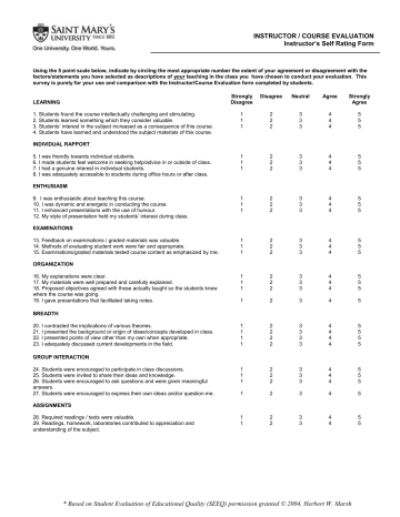INSTRUCTOR / COURSE EVALUATION Instructor’s Self Rating Form Using the 5 point scale below, indicate by circling the most appropriate number the extent of your agreement or disagreement with the factors/statements you have selected as descriptions of your teaching in the class you have chosen to conduct your evaluation. This survey is purely for your use and comparison with the Instructor/Course Evaluation form completed by students. LEARNING 1. Students found the course intellectually challenging and stimulating. 2. Students learned something which they consider valuable. 3. Students’ interest in the subject increased as a consequence of this course. 4. Students have learned and understood the subject materials of this course. Strongly Disagree Disagree Neutral Agree Strongly Agree 1 1 1 2 2 2 3 3 3 4 4 4 5 5 5 1 1 1 2 2 2 3 3 3 4 4 4 5 5 5 1 1 1 2 2 2 3 3 3 4 4 4 5 5 5 1 1 1 2 2 2 3 3 3 4 4 4 5 5 5 1 1 1 2 2 2 3 3 3 4 4 4 5 5 5 1 2 3 4 5 1 1 1 1 2 2 2 2 3 3 3 3 4 4 4 4 5 5 5 5 1 1 1 2 2 2 3 3 3 4 4 4 5 5 5 1 2 3 4 5 1 1 2 2 3 3 4 4 5 5 INDIVIDUAL RAPPORT 5. I was friendly towards individual students. 6. I made students feel welcome in seeking help/advice in or outside of class. 7. I had a genuine interest in individual students. 8. I was adequately accessible to students during office hours or after class. ENTHUSIASM 9. I was enthusiastic about teaching this course. 10. I was dynamic and energetic in conducting the course. 11. I enhanced presentations with the use of humour. 12. My style of presentation held my students’ interest during class. EXAMINATIONS 13. Feedback on examinations / graded materials was valuable. 14. Methods of evaluating student work were fair and appropriate. 15. Examinations/graded materials tested course content as emphasized by me. ORGANIZATION 16. My explanations were clear. 17. My materials were well prepared and carefully explained. 18. Proposed objectives agreed with those actually taught so the students knew where the course was going. 19. I gave presentations that facilitated taking notes. BREADTH 20. I contrasted the implications of various theories. 21. I presented the background or origin of ideas/concepts developed in class. 22. I presented points of view other than my own when appropriate. 23. I adequately discussed current developments in the field. GROUP INTERACTION 24. Students were encouraged to participate in class discussions. 25. Students were invited to share their ideas and knowledge. 26. Students were encouraged to ask questions and were given meaningful answers. 27. Students were encouraged to express their own ideas and/or question me. ASSIGNMENTS 28. Required readings / texts were valuable. 29. Readings, homework, laboratories contributed to appreciation and understanding of the subject. * Based on Student Evaluation of Educational Quality (SEEQ) permission granted © 2004, Herbert W. Marsh INSTRUCTOR / COURSE EVALUATION Instructor’s Self Rating Form OVERALL Very Poor Poor Average Good Very Good 30. Overall, how does this course compare with other courses at Saint Mary’s? 1 2 3 4 5 31. Overall, how do you compare with other instructors at Saint Mary’s? 1 2 3 4 5 32. Course pace was: (1=Too slow, 2= Slow, 3=About right, 4= Fast, 5= Too fast) 1 2 3 4 5 33. Hours per week required outside of class: (1= 0 to 2, 2=2 to 4, 3= 5 to 7, 4= 8 to 10, 5 = > 10) 1 2 3 4 5 34. Course difficulty, relative to other courses was: (1= Very easy, 2=Easy, 3=Average, 4= Difficult, 5=Very difficult) 1 2 3 4 5 35. Course workload, relative to other courses was: (1=Very light, 2= Light, 3= Average, 4= Heavy, 5= Very heavy) 1 2 3 4 5 COURSE WORKLOAD / DIFFICULTY CLASS CHARACTERISTICS You may wish to anticipate what the majority of students are likely to say in answer to the following questions 37. In comparison with other courses, how easy is it to get good marks in this course? (1=very easy, 2=easy, 3=average, 4=difficult, 5=very difficult) 1 2 3 4 5 40. Students likely level of interest in this subject prior to this course: (1=Very Low, 2=Low, 3=Medium, 4=High, 5=Very High) 1 2 3 4 5 3 3 3 3 3 3 3 3 3 4 4 4 4 4 4 4 4 4 5 5 5 5 5 5 5 5 5 IMPORTANT COMPONENTS OF TEACHING EFFECTIVENESS Please indicate how important you consider the following factors to be in teaching this course effectively Stimulate learning / Academic Value Examinations / Grading Group Interaction Instructor Enthusiasm Organization / Clarity Assignments / Reading Individual rapport with students Breadth of coverage Appropriate workload / difficulty 1 1 1 1 1 1 1 1 1 2 2 2 2 2 2 2 2 2