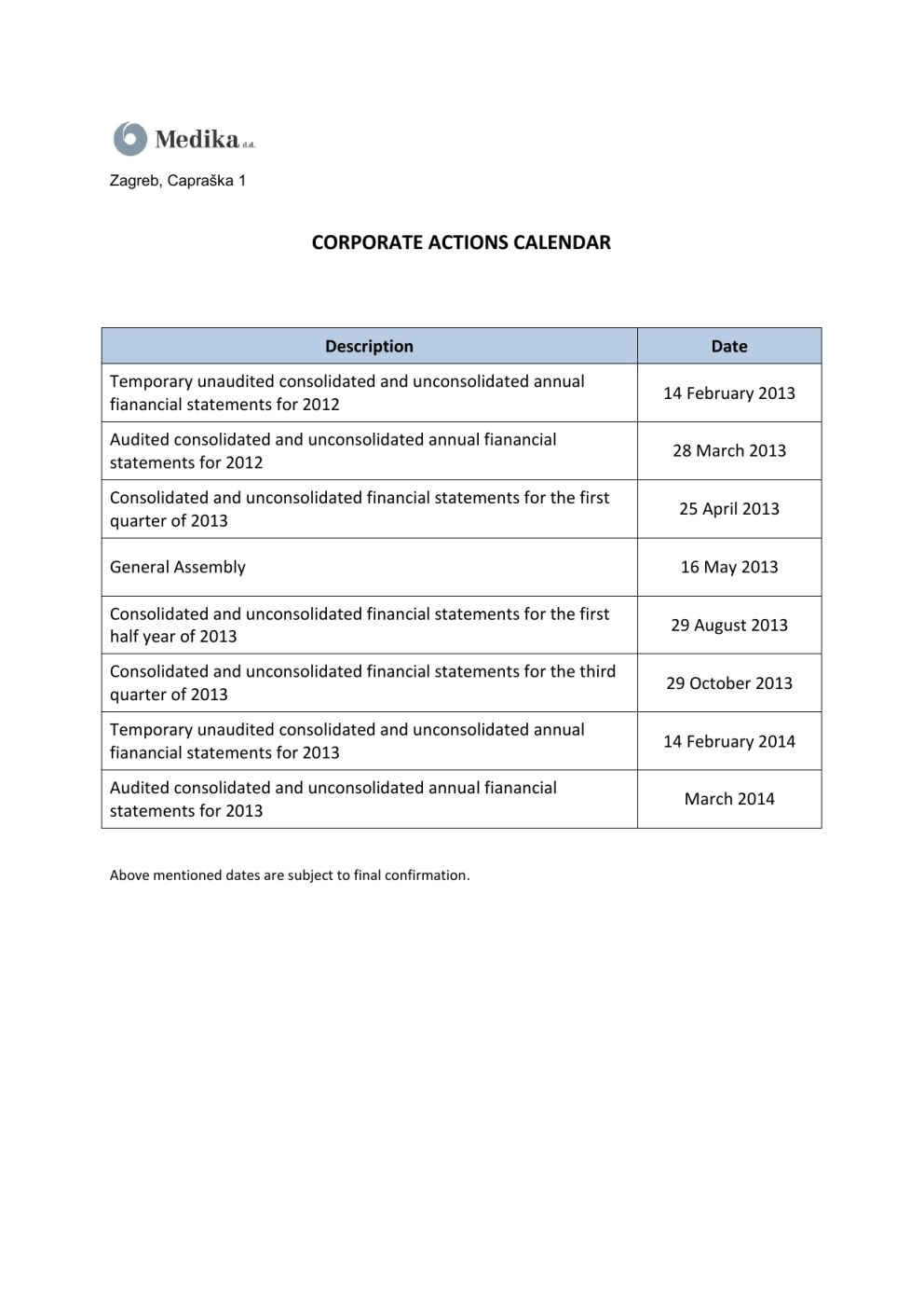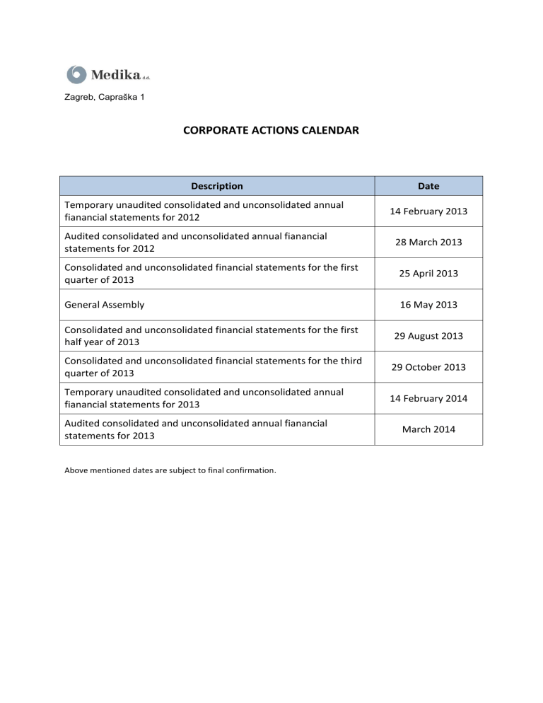 Zagreb, Capraška 1 CORPORATE ACTIONS CALENDAR Description Temporary unaudited consolidated and unconsolidated annual fianancial statements for 2012 Audited consolidated and unconsolidated annual fianancial statements for 2012 Date 14 February 2013 28 March 2013 Consolidated and unconsolidated financial statements for the first quarter of 2013 25 April 2013 General Assembly 16 May 2013 Consolidated and unconsolidated financial statements for the first half year of 2013 29 August 2013 Consolidated and unconsolidated financial statements for the third quarter of 2013 29 October 2013 Temporary unaudited consolidated and unconsolidated annual fianancial statements for 2013 14 February 2014 Audited consolidated and unconsolidated annual fianancial statements for 2013 Above mentioned dates are subject to final confirmation. March 2014