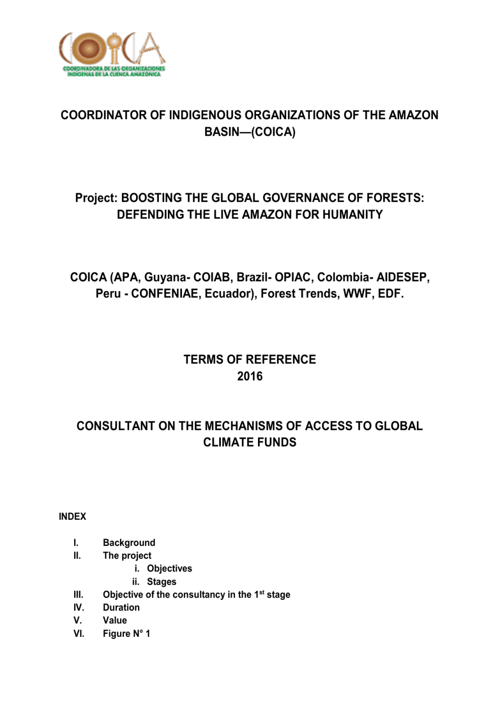 COORDINATOR OF INDIGENOUS ORGANIZATIONS OF THE AMAZON BASIN—(COICA) Project: BOOSTING THE GLOBAL GOVERNANCE OF FORESTS: DEFENDING THE LIVE AMAZON FOR HUMANITY COICA (APA, Guyana- COIAB, Brazil- OPIAC, Colombia- AIDESEP, Peru - CONFENIAE, Ecuador), Forest Trends, WWF, EDF. TERMS OF REFERENCE 2016 CONSULTANT ON THE MECHANISMS OF ACCESS TO GLOBAL CLIMATE FUNDS INDEX I. II. III. IV. V. VI. Background The project i. Objectives ii. Stages Objective of the consultancy in the 1st stage Duration Value Figure N° 1 TERMS OF REFERENCE I. Background The Coordinator of Indigenous Organizations of the Amazon Basin—COICA—in its status as an international indigenous organization, and within the framework of its objectives and mission, has accompanied the processes of legal protection of indigenous territories as one of its central program policies. Not only has this exercise been done in practice, but it has also been claimed by COICA as an inalienable right in all of the international forums, as a way to avoid dispossession, appropriation, and land grabbing by multinational companies dedicated to agribusiness, petroleum, mining, hydroelectric construction, etc. Given that 25% of all of the Amazon Basin is indigenous territory and that the forests in these territories store between 30 and 46 million tons of carbon, these territories offer great potential for the reduction of emissions of greenhouse gases, the mitigation of climate change, and the adaptation and resilience to climate change. The figures of carbon storage are so immense that they largely exceed the Protected Natural Areas in the Amazon Basin, the Democratic Republic of the Congo, and the Republic of Indonesia. The conservation of forests and the ecosystem services that indigenous territories offer are the result of a profound idiosyncrasy linked to nature and the respect for biodiversity; as such, the unity between nature and the Amazonian man is a factor of forest and jungle conservation in the Amazon that, against the states, empowers them to demand the right to the legal protection of indigenous territories, and, as an irrefutable and proper right, access to Global Climate Funds. II. The Project The main activity of Outcome 1, one the components of the project “Boosting the Global Governance of Forests: Defending the Live Amazon for Humanity,” is designing culturally appropriate mechanisms to channel climate funds. The foci of interest for COICA and its member organizations are: The Forest Carbon Partnership Facility (FCPF), Forest Investment Program (FIP), ONU REDD, Bilateral Climate Funds, Green Climate Fund (GCF) and Climate and Forest Governance Working Group, and the Bilateral Climate Funds: Amazon Vision (Colombia), Amazon Fund (Brazil), Zero Net Deforestation Agreement (Peru); REDD+ Investment Fund (Guyana), and ONU REDD+ (Ecuador). Project Objectives The project seeks to: 1. Organize an evaluation workshop a. Objectives i. Evaluate the status and current experience of indigenous peoples ii. Identify the challenges to participation and inclusion of the proposals of indigenous men and women iii. Identify the opportunities, strengths, and weaknesses for the inclusion of the indigenous proposals and participation in funds/climate programs iv. Focus and allocate funds to indigenous peoples 2. Analyze the legal framework, programs, strategies, and implementation of the climate funds a. Objectives i. Identify lessons learned and best practices in the context of rights ii. Obtain access and benefits for indigenous communities in various national contexts iii. Provide information for the initial workshops to be developed by all countries involved in this project 3. Generate influence through the dialogue and the establishment of agreements between national Amazonian indigenous confederations and their national governments a. Objectives i. Attain access, participation, rights, and benefits for the indigenous in public climate funds ii. Link advocacy efforts on the national level with the governing bodies of climate funds for implementation at the national level and for increasing access to existing international funds 4. Draft proposals with national and sub-national organizations to access existing funds a. Understanding i. Limitations of respective financing mechanisms should be taken into account ii. This objective will be completed after the initial international/regional workshop held in late February or early March to present the results to COICA’s 5 base organizations and will build upon the analysis completed to present and guide proposals in order to maximize their success. III. Objective of the consultancy in the 1st Stage COICA is soliciting consultants in the countries of Guyana, Brazil, Colombia, Ecuador, and Peru, with the following profile: - Must have experience working with indigenous organizations in the Amazon - Must be an expert on the issue of climate change with the knowledge of and capacity to analyze the functioning of Global Climate Funds and of Bilateral Climate Funds (see Figure No. 1) in the countries mentioned, in the terms required by the project, detailed in the lines above. 1. Consultant tasks: a. As articulated by the Technical Coordinator of the COICA project, consultant will develop a diagnostic that contains the following information: i. Which organizations (of the legal type) can access the funds ii. The type of support granted by the fund (donations, loans, etc.) iii. Scope of the activities that can be financed—management plans, land titling, new companies, etc. iv. Form of governance—who will make decisions about which projects or proposals are financed b. Presentation of this diagnostic in PowerPoint and in a written report (about 8 to 15 pages) c. By the 15th of January, the consultant should provide initial drafts of their products and the final versions by the 3rd of February. d. The international/regional workshop will be held between the end of February and beginning of March 