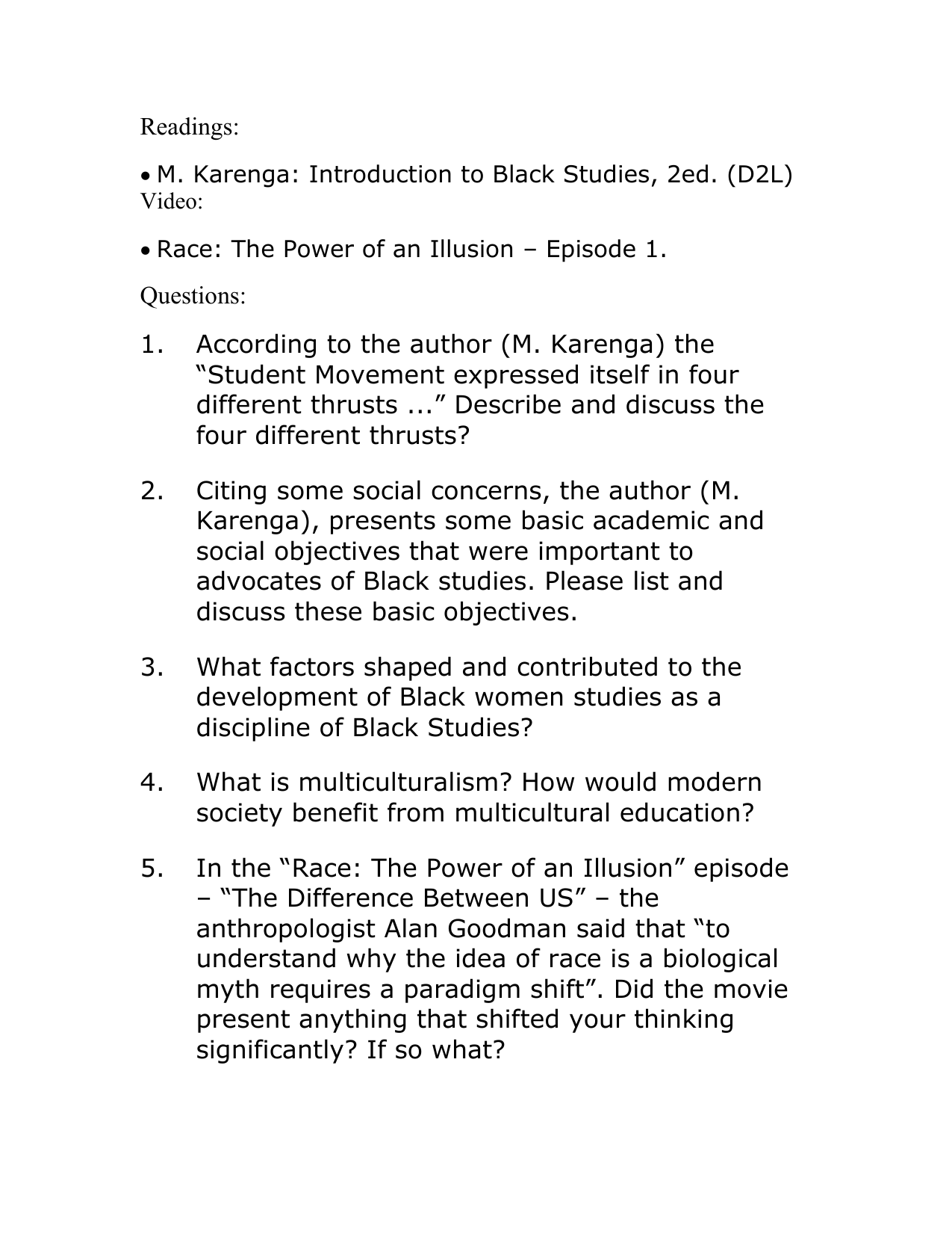Readings: M. Karenga: Introduction to Black Studies, 2ed. (D2L) Video: Race: The Power of an Illusion – Episode 1. Questions: 1. According to the author (M. Karenga) the “Student Movement expressed itself in four different thrusts ...” Describe and discuss the four different thrusts? 2. Citing some social concerns, the author (M. Karenga), presents some basic academic and social objectives that were important to advocates of Black studies. Please list and discuss these basic objectives. 3. What factors shaped and contributed to the development of Black women studies as a discipline of Black Studies? 4. What is multiculturalism? How would modern society benefit from multicultural education? 5. In the “Race: The Power of an Illusion” episode – “The Difference Between US” – the anthropologist Alan Goodman said that “to understand why the idea of race is a biological myth requires a paradigm shift”. Did the movie present anything that shifted your thinking significantly? If so what?