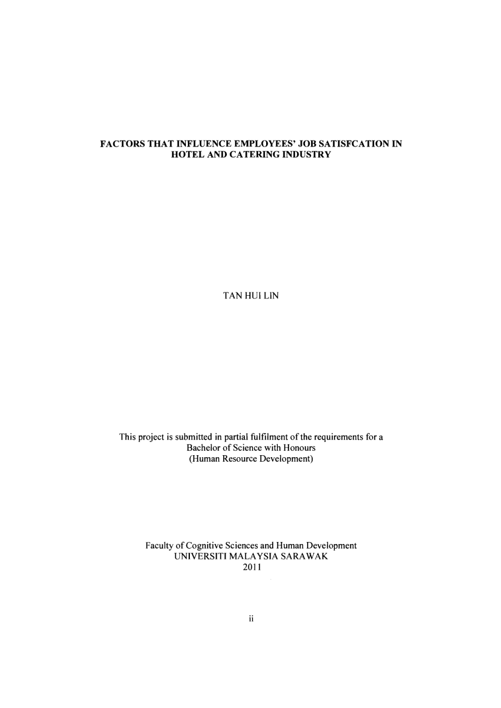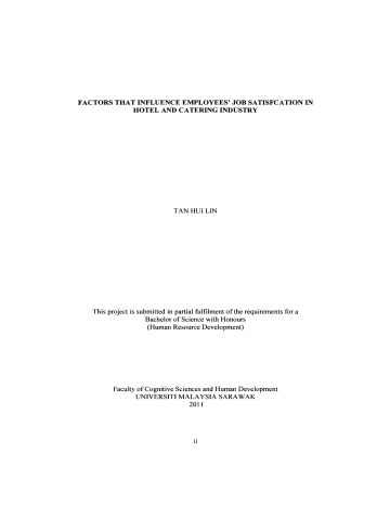 FACTORS THAT INFLUENCE EMPLOYEES' JOB SATISFCATION IN HOTEL AND CATERING INDUSTRY TAN HUILIN This project is submitted in partial fulfilment of the requirements for a Bachelor of Science with Honours (Human Resource Development) Faculty of Cognitive Sciences and Human Development UNIVERSITI MALAYSIA SARA W AK 2011 11 ..,.; ACKNOWLEDGEMENT First of all, I would like to thank my final year project supervisor, Encik Abang Ekhsan Abang Othman for his keen interest in providing useful resources, giving comments, critics, support and guidance on my final year project. I also appreciate his effort by spending his precious time to guide and encouraging me to complete the research process. I would also like to take this opportunity to express my sincere thanks to Dr. Tan Kock Wah who is willing to spend his precious time in guiding me to complete my SPSS procedure. I am grateful for his kindness to teach me the steps regarding SPSS. I would like to express my special thanks to all of the respondents who have devoted their time and energy in filling up my research questionnaires and provide me with the useful information and feedbacks to make this research successful. I would like to extend my gratitude to my friends and course mates who are always willing to help me. Last but not least, I would like to thank my beloved family members who have always supported me in terms of finance and emotion. Once again, thank you to all of you. v TABLE OF CONTENTS Pages Acknowledgements Table of Contents List of Tables List of Figures v vi-viii ix- x xi Abstract xii Abstrak xiii CHAPTER 1 INTRODUCTION 1.0 1.1 1.2 1.3 1.4 1.5 1.6 1.7 1.8 Introduction Background of the Study Statement of the Problem Objectives of the Study 1.3.1 General Objective 1.3.2 Specific Objectives Conceptual Framework Research Hypotheses Definition of Terms 1.6.1 Job Satisfaction 1.6.2 Work Environment 1.6.3 Training and Development 1.6.4 Supervision 1.6.5 Pay and Benefits Significance of the Study Conclusion 1 2-5 5-7 8 8 8-9 9-10 10-11 11 11-12 12 12-13 13-14 14 CHAPTER 2 LITERATURE REVIEW 2.0 Introduction 2.1 Context for the Topic 2.1.1 Job Satisfaction 2.1.2 Work Environment 2.1.3 Training and Development 2.1.4 Supervision 2.1.5 Pay and Benefits 2.2 Basic for Formulating Conceptualffheoretical Framework 2.2.1 Maslow's Hierarchy of Needs Theory vi 15 16-17 18-19 19-21 21-22 22-23 23-24 ·.. ~ i f 2.2.2 Herzberg's Motivation-Hygiene Theory 2.2.3 Equity Theory 2.3 Past Research Supporting This Study 2.3.1 Relationship between Work Environment and Employees' Job Satisfaction 2.3.2 Relationship between Training and Development and Employees' Job Satisfaction 2.3.3 Relationship between Supervision and Employees' Job Satisfaction 2.3.4 Relationship between Pay and Benefits and Employees' Job Satisfaction 2.3.5 Relationship between Gender and Employees' Job Satisfaction 2.4 Conclusion 25-26 26-27 27-28 28-29 29-31 31-32 33-34 34 CHAPTER 3 RESEARCH METHODOLOGY 3.0 3.1 3.2 3.3 3.4 3.5 3.6 3.7 3.8 3.9 Introduction Research Design Location of the Study Population and Sample of the Study Instrument of the Study Data Collection Method and Procedure Pilot Study Data Screening Reliability and Validity of the Questionnaires Data Analysis Procedure 3.9.1 Descriptive Statistic 3.9.2 Inferential Statistic 1) Independent sample t -Test 2) Pearson Correlation Coefficient 3) Multiple Linear Regression 3.10 Conclusion 35 36 37 37-38 38-41 41-42 42-43 43-45 45-51 vii ~ i "1, , 52 "i .' ~ 53 53-54 54-55 55 CHAPTER 4 FINDING AND DISCUSSION 4.0 Introduction 4.1 Descriptive Statistic Section A: Demographic Characteristic of Respondents 4.1.1 Gender 4.1.2 Age 4.1.3 Length of Service 4.1.4 Position Section B: Factors that Influence Employees' Job Satisfaction .: 56 57-58 58-59 60-61 61-63 f' 4.1.5 Work Environment 4.1.6 Training and Development 4.1.7 Supervision 4.1.8 Pay and Benefits Section C: Employees' Job Satisfaction 4.1.9 Job Satisfaction 4.2 Inferential Statistic 4.2.1 Independent sample t-Test 4.2.2 Pearson Correlation Coefficient 4.2.3 Multiple Linear Regression 4.3 Summary of the Finding 4.4 Conclusion 63-66 66-69 69-72 72-75 75-78 79-81 81-88 89-91 92 92-93 CHAPTER 5 SUMMARY, RECOMMENDATIONS AND CONCLUTION 5.0 5.1 5.2 5.3 Introduction Summary of the Study Limitation ofthe Study Recommendations 5.3.1 Recommendation to the Organization 5.3.2 Recommendation to the Human Resource Practitioners 5.3.3 Recommendation to the Future Research 5.4 Conclusion REFERENCES APPENDICES 94 95-96 96-97 97-98 98-99 99 99-100 101-116 117-132 LIST OF TABLES Table 3.1: Five-Point Likert Scale Table 3.2: Reliability of Measures Table 3.3: Nonnality Test Table 3.4: Factors Analysis Result for Each Component Questionnaire Table 3.5: Goodness of Data Table 3.6: Illustration of strength of Pearson Correlation Coefficient Value between Independent and Dependent Variables Table 4.1: Illustration of strength of Pearson Correlation Coefficient value between independent and dependent variables Table 4.2: Distribution of Respondents Based on Age Table 4.3: Distribution of Respondents Based on Length of Service Table 4.4: Distribution of Respondents Based on Position Table 4.5: Mean, Standard Deviation, Frequency and Percentage of the Respondents Toward the Work Environment Table 4.6: Overall Mean and Standard Deviation for Work Environment Table 4.7: Mean, Standard Deviation, Frequency and Percentage of the Respondents Toward the Training and Development Table 4.8: Overall Mean and Standard Deviation for Training and Development Table 4.9: Mean, Standard Deviation, Frequency and Percentage of the Respondents Toward the Supervision Table 4.10: Overall Mean and Standard Deviation for Supervision Table 4.11: Mean, Standard Deviation, Frequency and Percentage of the IX Page 36 39 40-42 43-46 47 49 52 53 54 55-56 57-58 58 60 60 63 63 65 I I Respondents Toward the Pay and Benefits Table 4.12: Overall Mean and Standard Deviation for Pay and Benefits Table 4.13: Mean, Standard Deviation, Frequ