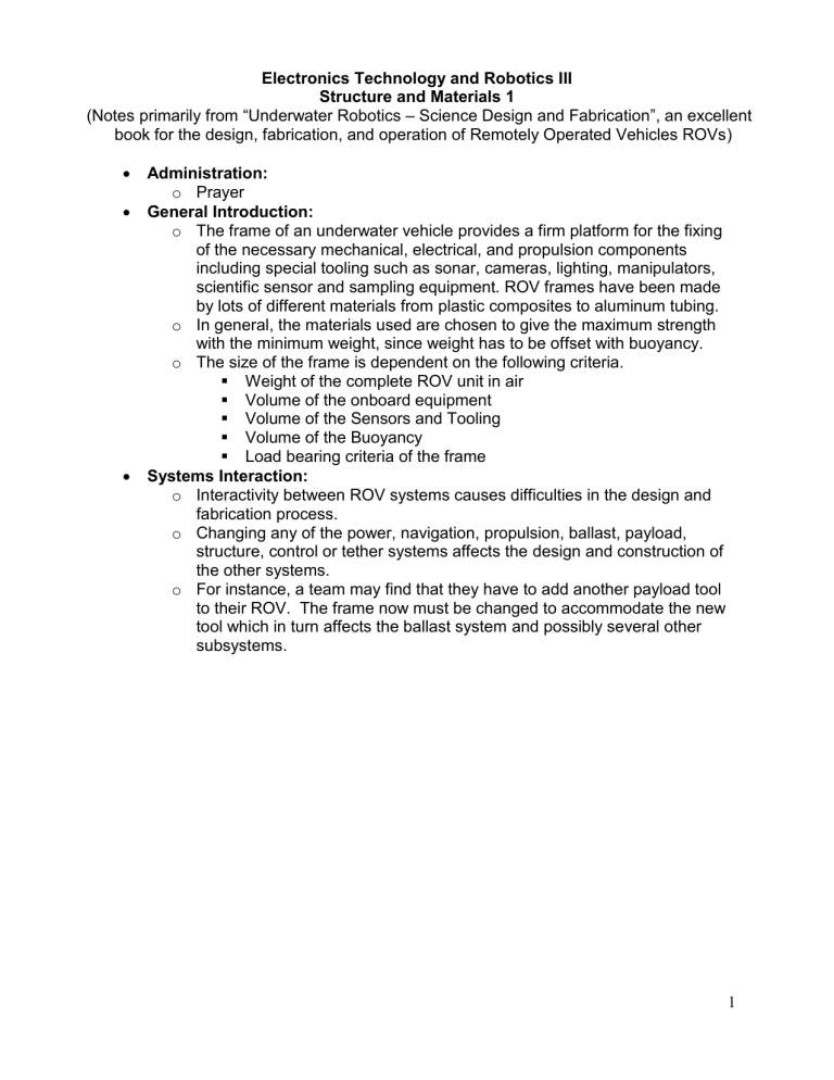 Electronics Technology and Robotics III Structure and Materials 1 (Notes primarily from “Underwater Robotics – Science Design and Fabrication”, an excellent book for the design, fabrication, and operation of Remotely Operated Vehicles ROVs) Administration: o Prayer General Introduction: o The frame of an underwater vehicle provides a firm platform for the fixing of the necessary mechanical, electrical, and propulsion components including special tooling such as sonar, cameras, lighting, manipulators, scientific sensor and sampling equipment. ROV frames have been made by lots of different materials from plastic composites to aluminum tubing. o In general, the materials used are chosen to give the maximum strength with the minimum weight, since weight has to be offset with buoyancy. o The size of the frame is dependent on the following criteria. Weight of the complete ROV unit in air Volume of the onboard equipment Volume of the Sensors and Tooling Volume of the Buoyancy Load bearing criteria of the frame Systems Interaction: o Interactivity between ROV systems causes difficulties in the design and fabrication process. o Changing any of the power, navigation, propulsion, ballast, payload, structure, control or tether systems affects the design and construction of the other systems. o For instance, a team may find that they have to add another payload tool to their ROV. The frame now must be changed to accommodate the new tool which in turn affects the ballast system and possibly several other subsystems. 1 Three Basic Structure Components of an Underwater Vehicle: o There are three components in an underwater vehicle’s structure, the frame, pressure canisters, and the fairing: Figure 1: Three Basic Components of an Underwater Vehicle Frame – the internal supporting structure that gives a vehicle its shape It is required to support the weight of the vehicle in and out of the water. It has to distribute concentrated forces such as lifting points. It must resist hydrodynamic forces from currents, waves, and thruster propulsion. All of the other ROV components such as cameras, pressure canisters, and thrusters must be mounted such a way that servicing is convenient. It must withstand the forces from the onboard tools themselves and the additional forces transferred to the frame while the tools are in operation. The frame should guard the underwater vehicle from collisions underwater and rough treatment out of water. It should protect the tether from damage. Pressure Canisters – rigid, watertight containers that protect contents from water and pressure They have to withstand water pressure forces. They must keep the integrity of the watertight seals. They need to provide a way to service their contents. They may include wire penetrations in their outer walls and still maintain water tightness. They must provide a way for mounting to the frame. Fairing – the external surface of a vehicle, such as a submarine, that serves to reduce drag Fairing should minimize the drag the vehicle encounters in the water. It should have a smooth surface so the vehicle does not get caught or entangled in its working environment. o ROVs are normally made without a fairing since they do not travel great distances nor at high speeds. 2 Structure Basics: o Strength and Stiffness: Strength – the power to resist strain or stress without experiencing damage; durability Stiffness – the measure of the resistance offered by a body to deformation. Figure 2: ROV Frame Under Three Basic Structural Forces The strength and stiffness of your ROV is subject to: The strength and stiffness of the individual parts The geometry of the structural members in the vehicle How the parts are fastened to each other Perform Structures and Materials Lab 1 – Strength and Stiffness of Geometric Configurations o Weight – the force that gravitation exerts upon a body Although buoyancy can be added to compensate for more weight under water, the additional weight encumbers the handling of the vehicle while out of water. In general, less weight is superior than more weight. Factors to consider when putting your underwater vehicle on a “diet”: Limit the size of your vehicle Use materials that have higher strength and stiffness for their density Make use of material cross-sections that lend themselves to higher strength and stiffness o Construction and Maintenance: Keep it simple; simple designs are easier to construct and have fewer things that can malfunction. One of the MATE competition score sheets lists “Components easy to access for maintenance & troubleshooting” as one of their line items. COTS parts – Commercial Off-The-Shelf parts: Parts that are ready-made and commercially available. The final part is normally quicker to purchase than to build the part yourself. 3 COTS parts are more reliable and occasionally cheaper than DIY parts. DIY parts – Do-It-Yourself parts: More educational Have a backup part available that can be easily inserted In the MATE competitions, multiple commercial components such as tethers or thrusters are encouraged. Systems designed to perform multiple, complex functions from one “black box” or series of components designed to integrate with each other are discouraged. An example is the FIRST controller system. o Safety: Safety by design Safety is always the first priority in the design and operation of an underwater vehicle. The standards for manned vehicles are understandably much higher and more rigid than an unmanned vehicle. Partial list of potential hazards for unmanned vehicles: Injury from rollover or shifting during transportation Electrical shock Discharge from stored energy such as hydraulics and pneumatics Lacerations from sharp objects Hazards to divers nearby Injuries during the fabrication process Safety by design is a concept that supports the view that along with quality and cost; safety is determined during the design stage. This proactive approach results in a dec