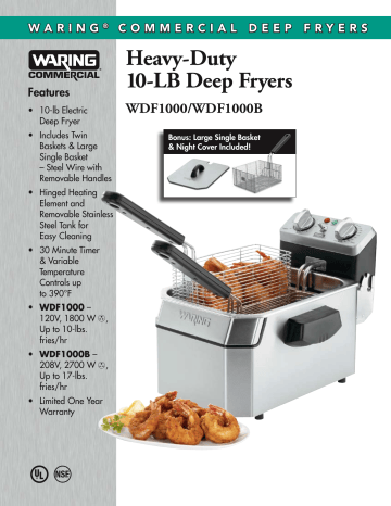 WARING ® WDF1000/WDF1000B • 10-lb Electric Deep Fryer • Includes Twin Baskets & Large Single Basket – Steel Wire with Removable Handles • Hinged Heating Element and Removable Stainless Steel Tank for Easy Cleaning • 30 Minute Timer & Variable Temperature Controls up to 390°F , • WDF1000B – 208V, 2700 W , Up to 17-lbs. fries/hr • Limited One Year Warranty NSF ® DEEP Heavy-Duty 10-LB Deep Fryers Features • WDF1000 – 120V, 1800 W Up to 10-lbs. fries/hr COMMERCIAL Bonus: Large Single Basket & Night Cover Included! FRYERS NSF Heavy-Duty 10-LB Deep Fryers WDF1000/WDF1000B Specifications Item Electrical Plug Listings Configuration ® Pound of Fries/Hr Dimensions (H" x W" x D") Warranty WDF1000 120 Volt, 1800 W UL, NSF 10 12" x 13" x 17" Limited 1 Year WDF1000B 208 Volt, 2700 W UL, NSF 17 12" x 13" x 17" Limited 1 Year Ordering Information Description Catalog # Std Pkg. Heavy-Duty 10-lb Fryer WDF1000 1 Heavy-Duty 10-lb Fryer WDF1000B 1 Ship Wt. Cubic Feet (Lbs.) UPC Code 15.5 lbs. 2.27 040072013522 15.5 lbs. 2.27 040072013539 22.75" D 12" H 13" W 17" D WDF1000/WDF1000B Waring Commercial • 314 Ella T. Grasso Ave. • Torrington • Connecticut 06790 Tel. (800) 492-7464 • Fax (860) 496-9008 • www.waringproducts.com ©2009 Conair Corporation 09WC15499 PG-25238