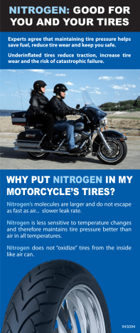 NITROGEN: GOOD FOR YOU AND YOUR TIRES Experts agree that maintaining tire pressure helps save fuel, reduce tire wear and keep you safe. Underinflated tires reduce traction, increase tire wear and the risk of catastrophic failure. WHY PUT NITROGEN IN MY MOTORCYCLE’S TIRES? Nitrogen’s molecules are larger and do not escape as fast as air... slower leak rate. Nitrogen is less sensitive to temperature changes and therefore maintains tire pressure better than air in all temperatures. Nitrogen does not “oxidize” tires from the inside like air can. 943094 MOTORCYCLE TIRE CARE HOW WILL MY TIRES BE CHANGED FROM AIR TO NITROGEN? First, the air will be completely removed from your tires. Then your shop will use a “Nitrogen Generator” to fill your tires with 96% pure Nitrogen. Green valve caps will be installed to indicate the change to Nitrogen. CAN I ADD AIR TO A TIRE WITH NITROGEN? Yes, but you may lose the benefit of using Nitrogen. We suggest that you top off with Nitrogen. Ask your service provider about their top-off policy. Contact your authorized service provider: Flo-Dynamics • 800-303-5874 • www.flodynamics.com