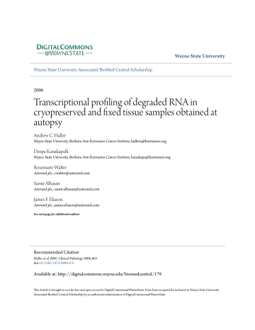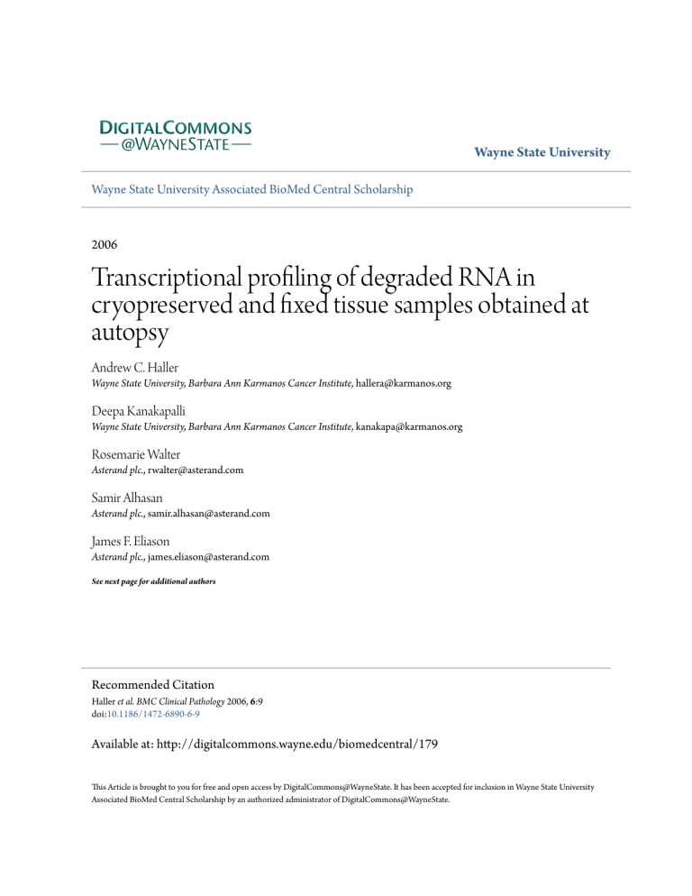 Wayne State University Wayne State University Associated BioMed Central Scholarship 2006 Transcriptional profiling of degraded RNA in cryopreserved and fixed tissue samples obtained at autopsy Andrew C. Haller Wayne State University, Barbara Ann Karmanos Cancer Institute, [email protected] Deepa Kanakapalli Wayne State University, Barbara Ann Karmanos Cancer Institute, [email protected] Rosemarie Walter Asterand plc., [email protected] Samir Alhasan Asterand plc., [email protected] James F. Eliason Asterand plc., [email protected] See next page for additional authors Recommended Citation Haller et al. BMC Clinical Pathology 2006, 6:9 doi:10.1186/1472-6890-6-9 Available at: http://digitalcommons.wayne.edu/biomedcentral/179 This Article is brought to you for free and open access by DigitalCommons@WayneState. It has been accepted for inclusion in Wayne State University Associated BioMed Central Scholarship by an authorized administrator of DigitalCommons@WayneState. Authors Andrew C. Haller, Deepa Kanakapalli, Rosemarie Walter, Samir Alhasan, James F. Eliason, and Richard B. Everson This article is available at DigitalCommons@WayneState: http://digitalcommons.wayne.edu/biomedcentral/179 BMC Clinical Pathology BioMed Central Open Access Research article Transcriptional profiling of degraded RNA in cryopreserved and fixed tissue samples obtained at autopsy Andrew C Haller1, Deepa Kanakapalli1, Rosemarie Walter2, Samir Alhasan2, James F Eliason2 and Richard B Everson*1,3 Address: 1Wayne State University, Barbara Ann Karmanos Cancer Institute, Detroit, MI, USA, 2Asterand plc., Detroit, MI, USA and 3Wayne State University School of Medicine, Departments of Medicine and Pathology, Detroit, MI, USA Email: Andrew C Haller - [email protected]; Deepa Kanakapalli - [email protected]; Rosemarie Walter - [email protected]; Samir Alhasan - [email protected]; James F Eliason - [email protected]; Richard B Everson* - [email protected] * Corresponding author Published: 04 December 2006 BMC Clinical Pathology 2006, 6:9 doi:10.1186/1472-6890-6-9 Received: 07 June 2006 Accepted: 04 December 2006 This article is available from: http://www.biomedcentral.com/1472-6890/6/9 © 2006 Haller et al; licensee BioMed Central Ltd. This is an Open Access article distributed under the terms of the Creative Commons Attribution License (http://creativecommons.org/licenses/by/2.0), which permits unrestricted use, distribution, and reproduction in any medium, provided the original work is properly cited. Abstract Background: Traditional multiplexed gene expression methods require well preserved, intact RNA. Such specimens are difficult to acquire in clinical practice where formalin fixation is the standard procedure for processing tissue. Even when special handling methods are used to obtain frozen tissue, there may be RNA degradation; for example autopsy samples where degradation occurs both pre-mortem and during the interval between death and cryopreservation. Although specimens with partially degraded RNA can be analyzed by qRT-PCR, these analyses can only be done individually or at low levels of multiplexing and are laborious and expensive to run for large numbers of RNA targets. Methods: We evaluated the ability of the cDNA-mediated Annealing, Selection, extension, and Ligation (DASL) assay to provide highly multiplexed analyses of cryopreserved and formalin fixed, paraffin embedded (FFPE) tissues obtained at autopsy. Each assay provides data on 1536 targets, and can be performed on specimens with RNA fragments as small as 60 bp. Results: The DASL performed accurately and consistently with cryopreserved RNA obtained at autopsy as well as with RNA extracted from formalin-fixed paraffin embedded tissue that had a cryopreserved mirror image specimen with high quality RNA. In FFPE tissue where the cryopreserved mirror image specimen was of low quality the assay performed reproducibly on some but not all specimens. Conclusion: The DASL assay provides reproducible results from cryopreserved specimens and many FFPE specimens obtained at autopsy. Gene expression analyses of these specimens may be especially valuable for the study of non-cancer endpoints, where surgical specimens are rarely available. Background Standard microarray analyses use cDNA synthesized from the poly-A tail of RNA. It requires highly intact RNA to be successful. Specimens must be obtained from intact tissues and processed immediately to avoid degradation of the RNA. Avoiding damage is difficult in clinical settings. Page 1 of 8 (page number not for citation purposes) BMC Clinical Pathology 2006, 6:9 Autopsy samples may undergo degradation postmortem, surgical samples may undergo degradation during processing, and both may be damaged during storage. Several recent studies demonstrate that real-time PCR can provide useful gene expression data from clinical specimens, but these assays analyze a single or low number of expression products. It was shown that gene expression analysis obtained with reverse transcription PCR from formalin-fixed, paraffin-embedded (FFPE) tissues is accurate and reproducible, and that results were comparable to those obtained with matching fresh cryopreserved tissue [1]. Also observed was that neither fixation grade nor delay in the formalin fixation of the tissue significantly affected the results. Similar results were also seen by Abrahamsen et al [2]. It was observed that a delay in freezing reduced the amount of total RNA detected, but time in the fixative seemed to have no effect on relative expression of mRNA. While informative, the small number of genes that can be assayed at one time makes assessing gene expression by qRT-PCR laborious and expensive, limiting is usefulness in phases of clinical research and medicine where a broader survey of gene expression is appropriate. A recently developed cDNA-mediated Annealing, Selection, extension, and Ligation (DASL) assay (Illumina, San Diego, California) promises to meet the needs 