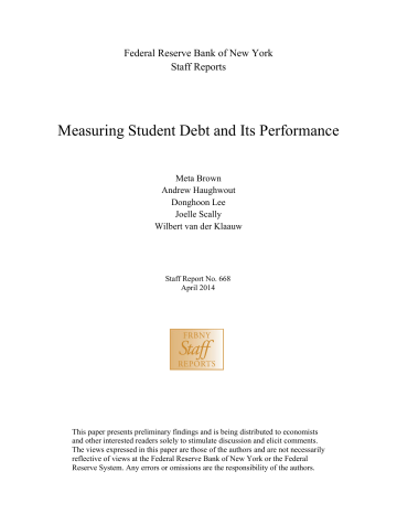 Federal Reserve Bank of New York Staff Reports Measuring Student Debt and Its Performance Meta Brown Andrew Haughwout Donghoon Lee Joelle Scally Wilbert van der Klaauw Staff Report No. 668 April 2014 This paper presents preliminary findings and is being distributed to economists and other interested readers solely to stimulate discussion and elicit comments. The views expressed in this paper are those of the authors and are not necessarily reflective of views at the Federal Reserve Bank of New York or the Federal Reserve System. Any errors or omissions are the responsibility of the authors. Measuring Student Debt and Its Performance Meta Brown, Andrew Haughwout, Donghoon Lee, Joelle Scally, and Wilbert van der Klaauw Federal Reserve Bank of New York Staff Reports, no. 668 April 2014 JEL classification: D12, I22, D14 Abstract Studies continue to indicate that higher education is frequently a worthwhile investment for individuals and that it raises the productivity of the workforce as a whole. While the rising cost of post-secondary education has not eliminated this “college premium,” it has raised new questions about how growing numbers of students can make these investments. One solution to this problem is student loans, which have come to play an increasingly important role in financing higher education. Yet, despite its importance, educational debt is not well understood. Among the reasons is that there exist few central repositories of information on the characteristics and performance of all student loans, which currently include loans made by both government and private lenders. In this paper, we bring a new data set to bear on this important issue and present a brief analysis of the historical and current levels of student debt and how those loans are performing. We also briefly discuss the implications of student loans for borrowers and the economy. Key words: student debt, household debt _________________ Brown, Haughwout, Lee, Scally, van der Klaauw: Federal Reserve Bank of New York (e-mail: [email protected], [email protected], [email protected], [email protected], [email protected]). The authors are grateful to Brian Cadena and Raven Molloy for helpful comments. The views expressed in this paper are those of the authors and do not necessarily reflect the position of the Federal Reserve Bank of New York or the Federal Reserve System. I. Introduction Studies continue to indicate that higher education is frequently a worthwhile investment for individuals (Goldin and Katz 2008), and raises the productivity of the workforce as a whole (Moretti 2004). While the rising cost of post-secondary education has not eliminated this “college premium,” it has raised new questions about how a growing numbers of students can make these investments (Archibald and Feldman 2010, Dynarski and Kreisman 2013). One solution to this problem is student loans, which have come to play an increasingly important role in financing higher education. Yet in spite of its importance, educational debt is not well understood. Among the reasons for this is the fact that the currently outstanding stock of student debt includes loans made by both government and private lenders, and there exist few central repositories of information on the characteristics and performance of all student loans. In this paper, we bring a new dataset to bear on this important issue, and present a brief analysis of the historical and current levels of student debt and how those debts are performing. We also briefly discuss the implications of student loans for borrowers and the economy. II. Data Our analysis is based on data drawn from the FRBNY Consumer Credit Panel (CCP). The CCP represents a 5 percent random sample of U.S. individuals with credit files as well as all of their household members.1 In all, the entire data set includes anonymous credit files on more than 15 percent of the population, or nearly 40 million individuals. The panel includes information from the credit reports for those individuals for each quarter during the last fourteen years, and we use data for this analysis through December 2012. While the CCP commences in 1999, irregularities in student 1 See Avery et al. (2003) for a detailed discussion of the contents, sources, and quality of credit report data. 1 loan reporting prior to 2004 suggest dropping the 1999-2003 data and we thus begin our analysis in 2004. The sampling exploits randomness in the last two digits of individuals’ Social Security numbers.2 The procedure ensures that the panel is dynamically updated in each quarter to reflect new entrants into credit markets. In addition, Equifax, the data provider, matches the primary individual’s mailing address to all records in the data in order to capture information about other members of the primary individual’s household. While these individuals are added to the overall CCP sample, in this paper we focus on the 5% primary sample members. The data set includes detailed data on individual student loans and individual mortgage loans such as: month and year the account was opened current balance and payment status origination balance whether the account is individual or joint scheduled monthly payment narrative codes giving details of the account such as the payment is deferred, etc. industry code indicating the type of the servicer In addition, the data set includes somewhat more aggregated data on individuals’ other loans, including credit cards, auto loans such as: . total number of each type of account (for example, the total number of credit cards), credit limit on each type of account (for example, the combined credit limit on all credit cards), 2 See Lee and van der Klaauw (2010) for further details about the sample design and content of the FRBNY Consumer Credit Panel. 2 total balance on each type of account in each status (for example, the total credit card balance that is current, thirty-days delinquent, and so on). More general infor