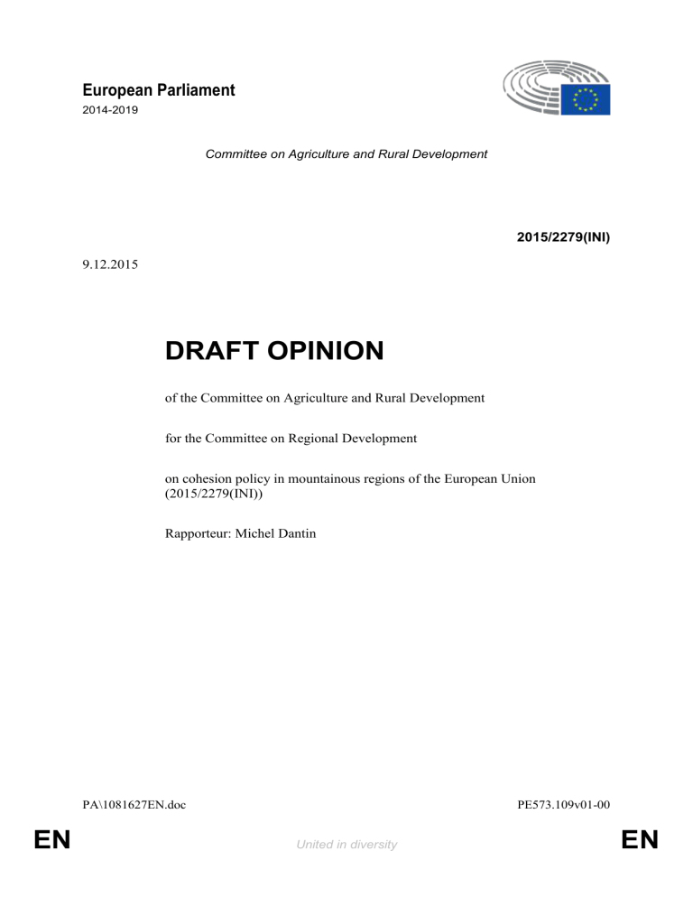 European Parliament 2014-2019 Committee on Agriculture and Rural Development 2015/2279(INI) 9.12.2015 DRAFT OPINION of the Committee on Agriculture and Rural Development for the Committee on Regional Development on cohesion policy in mountainous regions of the European Union (2015/2279(INI)) Rapporteur: Michel Dantin PA\1081627EN.doc EN PE573.109v01-00 United in diversity EN PA_NonLeg PE573.109v01-00 EN 2/4 PA\1081627EN.doc SUGGESTIONS The Committee on Agriculture and Rural Development calls on the Committee on Regional Development, as the committee responsible, to incorporate the following suggestions into its motion for a resolution: A. whereas the additional costs associated with climatic and topographical conditions, remoteness and isolation hinder the economic and social development of mountainous regions; whereas also efforts to maintain agricultural economic production in EU regions must be accompanied by physical and digital accessibility as well as access to public services for the inhabitants of such regions; B. whereas it is essential to secure agricultural and food production and maintain added value in these regions; C. whereas a response must be found to the challenges posed by desertification and lack of generational renewal in mountain areas; D. whereas mountain areas make a positive contribution to sustainable development and the preservation of regional ecosystems; Governance and synergy of the cohesion funds 1. Regrets that despite the sector-specific measures that have been taken, there does not yet exist a fully-fledged EU approach to mountain regions; proposes in this regard that efforts be made to adopt a common definition of mountain regions; 2. Notes that recent reforms of the Common Agricultural Policy (CAP) and regional policy allow the management of European cohesion funding to be undertaken at regional level; 3. Considers that the European Agricultural Fund for Rural Development (EAFRD) should form an integral part of the smart specialisation strategies of regions with mountain areas; calls therefore on the Commission, Member States and the regions to strengthen synergies between different funds and measures for mountain areas in preparing, examining and adopting operational programmes; 4. Calls on the Commission and Member States to develop strategies between local authorities, civil society and economic players in mountain ranges in order to determine joint action plans for the promotion, development and protection of the mountain ranges in question; welcomes and supports in this regard the Alpine macro-regional strategy initiative; Investments, competitiveness and economic diversification 5. Stresses the importance of aid under the first pillar of the CAP in maintaining agricultural production and income for farmers in mountain areas; recalls that Member States have the option of establishing specific direct aid and coupled payments to help attain these PA\1081627EN.doc 3/4 PE573.109v01-00 EN objectives; 6. Considers that measures under the second pillar of the CAP must ensure the sustainability and diversification of agricultural production in mountain areas by supporting the emergence of projects that create added value, innovation projects, agricultural investment projects and farm development projects and projects to maintain processing enterprises; stresses that these funds should be used as tools to boost the competitiveness of the regional agricultural sector and / or as a means of allowing the economic diversification of farms; 7. Recalls the essential character of measures to support generational renewal and the establishment of active young farmers, in particular by organising access to multidisciplinary training enabling them to carry out various activities simultaneously and successively over the year; Structuring the food chain 8. Stresses the importance of establishing producer groups or organisations to strengthen the bargaining power of farmers in the food chain; 9. Believes that such approaches help maintain and create local markets and short supply chains and initiate approaches geared to quality and promoting and protecting products (‘mountain products’, Protected Designations of Origin (PDO), Protected Geographical Indications (PGI) and Traditional Specialty Guaranteed (TSG)); 10. Calls on the Commission to strengthen promotion and information initiatives concerning the ‘mountain products’ label and, more generally, the PDO, PGI and TSG labels. PE573.109v01-00 EN 4/4 PA\1081627EN.doc