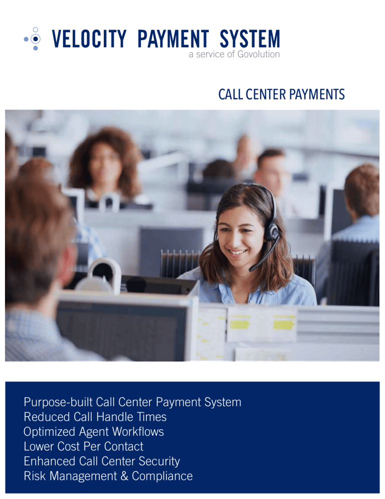 a service of Govolution CALL CENTER PAYMENTS Purpose-built Call Center Payment System Reduced Call Handle Times Optimized Agent Workflows Lower Cost Per Contact Enhanced Call Center Security Risk Management & Compliance a service of Govolution CALL CENTER PAYMENTS Features Optimized Agent Interface Inbound, Outbound, In-House & Remote Agent IVR Integration Lowest Cost Transaction Routing Risk Management Agent Workflow Optimization for Lower Costs Purpose-built for Call Centers, Velocity’s Call Center solution revolutionizes agent workflows related to payment acceptance and support for inbound and outbound calls. Seamless customer identification, predefined accounts receivable policies and an intuitive design result in reduced call handle times. Improved agent performance lowers operating costs while improving customer experience. Lower Transaction Costs Preconfigured payment policies and smart transaction routing automatically guide agents to lower cost transaction methods. For example, the system, can automatically identify branded debit cards and submit the transaction through PINless debit networks such as NYCE, Pulse and Star instead of using a more expensive credit card network. Lower Risks Benefits Reduced Call Handle Times Lower Cost Per Contact Reduced Fraud & Payment Abuse Improved Data Security, Operational Controls & Compliance Enhanced Risk Management & Audit Reporting Velocity’s Call Center solution is designed to mitigate the risk of fraud by automatically analyzing prior payments to identify high risk payment methods and payers. The system then alerts the agent and automatically blocks future payments based on a preconfigured fraud management policy. Velocity provides unparalleled fraud protection, management oversight, risk management controls and audit reporting to meet the high demands and requirements of call center operators. Multi-Channel Combined with Velocity’s other payment products, this system provides agents with complete visibility into a customer’s activity across all payment channels including: Web, Mobile, IVR In-person and Gateway. 2000 N. 14th Street | Suite 600 | Arlington, VA 22201 | V: 703.894.5000 | F: 703.894.5001 Velocity Payment System Is a service mark of Govolution, LLC, a wholly-owned subsidiary of First American Payment Systems.