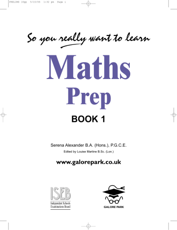 PRELIMS 10pp 5/10/06 1:32 pm Page i So you really want to learn Maths Prep BOOK 1 Serena Alexander B.A. (Hons.), P.G.C.E. Edited by Louise Martine B.Sc. (Lon.) www.galorepark.co.uk Independent Schools Examinations Board PRELIMS 10pp 5/10/06 1:32 pm Page ii Published by ISEB Publications, an imprint of Galore Park Publishing Ltd 19/21 Sayers Lane, Tenterden, Kent TN30 6BW www.galorepark.co.uk Text copyright © Serena Alexander Illustrations copyright © Galore Park 2003 Cartoons by Ian Douglass Technical drawings by Graham Edwards The right of Serena Alexander to be identified as the author of this work has been asserted by her in accordance with sections 77 and 78 of the Copyright, Designs and Patents Act 1988. The 3-D cartoons used in this book are © www.animationfactory.com. This publication includes images from CorelDRAW ® 9 which are protected by the copyright laws of the U.S., Canada and elsewhere. Used under licence. Typography and layout by Typetechnique, London W1 Cover design by GKA Design, London WC2H Printed by CPI, Glasgow The publishers would like to thank Teresa Sibree for her invaluable help during the production of this book. ISBN-13: 978 1 902984 18 6 ISBN-10: 1 902984 18 8 All rights reserved: no part of this publication may be reproduced, stored in a retrieval system, or transmitted in any form or by any means, electronic, mechanical, photocopying, recording or otherwise, without either the prior written consent of the copyright owner or a licence permitting restricted copying issued by the Copyright Licensing Agency, 90 Tottenham Court Road, London W1P 0LP. First published 2003 Reprinted 2004, 2006 Available in the series Maths Prep Book 1 Maths Prep Book 1 Answer Book Maths Prep Book 1 Worksheets CD Maths Prep Book 2 Maths Prep Book 2 Answer Book Maths Prep Book 2 Worksheets CD Maths Prep Book 3 Maths Prep Book 3 Answer Book Maths Prep Book 3 Worksheets CD ISBN-13: ISBN-13: ISBN-13: ISBN-13: ISBN-13: ISBN-13: ISBN-13: ISBN-13: ISBN-13: 978 978 978 978 978 978 978 978 978 Also available in the So you really want to learn series: English; History; Latin; French; Maths; Science; Spanish 1 1 1 1 1 1 1 1 1 902984 902984 902984 902984 902984 902984 902984 902984 902984 18 19 49 31 32 54 34 35 60 6 3 0 5 2 4 6 3 5 PRELIMS 10pp 5/10/06 1:32 pm Page iii Preface It has been a problem for Maths teachers in prep schools for many, many years that books suited to the requirements of the Common Entrance Examination have been hard to find. But help is now at hand. The main aim of this ISEB endorsed book is to give pupils a good grounding in Mathematics which will equip them for the 11+ Common Entrance (and other 11+ entrance exams), before embarking on the rigours of the ISEB 13+ Common Entrance Exam. Algebra is introduced in this book but the main emphasis is on sound number work with carefully written pencil and paper methods, geometry, probability and data handling. There are problem solving exercises throughout in order to develop reasoning skills. Worked examples are there for reference. Most chapters finish with an extension question designed to stretch the most able, then a summary exercise and finally an end of chapter activity. Interspersed between the chapters are a selection of investigations, puzzles and practical tasks which should be regarded as a starting point for further discussions. There is also considerable reference to the history and language of Mathematics in an attempt to make the subject more relevant for those who do not have a natural affinity with numbers. The book has been extensively tested and reviewed by a wide range of Maths teachers from both prep and senior schools, and has been endorsed by ISEB (the Independent Schools Examinations Board). The leader of the ISEB 11+ Mathematics setting team (who is also a member of the 13+ setting team), having reviewed the book, concluded: “I imagine that this text will enjoy widespread acclaim and become a ‘standard’ work.” Acknowledgements It would be impossible to write a textbook without being able to trial exercises and ideas. The most enormous thanks therefore must go to the boys and girls of Colet Court and Newton Prep for unwittingly proof reading, testing and criticising all the sample worksheets that were put before them. Thanks are also due to my colleagues in both schools for their support and encouragement, to Teresa Sibree at Marlborough House School, to the Galore Park team, to Kevin at Typetechnique, and to Justin Kirby at dmc for his technical support. Serena Alexander, November 2003 PRELIMS 10pp 5/10/06 1:32 pm Page iv Contents Chapter 1: Back to basics In the beginning . . . . . . . . . . . . . . . . . . . . . . . . . . . . . . . . . . . . . . . 1 Roman numerals . . . . . . . . . . . . . . . . . . . . . . . . . . . . . . . . . . . . . . 2 From Roman numerals to decimals . . . . . . . . . . . . . . . . . . . . . . . . . 3 Number bonds . . . . . . . . . . . . . . . . . . . . . . . . . . . . . . . . . . . . . . . . 4 Something special about 9 . . . . . . . . . . . . . . . . . . . . . . . . . . . . . . . 6 Subtracting . . . . . . . . . . . . . . . . . . . . . . . . . . . . . . . . . . . . . . . . . . . 7 Opposites . . . . . . . . . . . . . . . . . . . . . . . . . . . . . . . . . . . . . . . . . . . 12 Activity: Roman numeral investigations . . . . . . . . . . . . . . . . . . . . . 15 Chapter 2: More calculations Multiplying and dividing . . . . . . . . . . . . . . . . . . . . . . . . . . . . . . . . . 17 Doubles and near doubles . . . . . . . . . . . . . . . . . . . . . . . . . . . . . . 20 Larger numbers . . . . . . . . . . . . . . . . . . . . . . . . . . . . . . . . . . . . . . 21 Approximation and estimation . . . . . . . . . . . . . . . . . . . . . . . . . . . . 22 More calculations . . . . . . . . . . . . . . . . . . . . . . . . . . . . . . . . . . . . . 23 Addition . . . . . . . . . . . . . . . . . . . . . . . . . . . . . . . . . . . . . . . . . . . . 23 Subtraction . . . . . . . . 