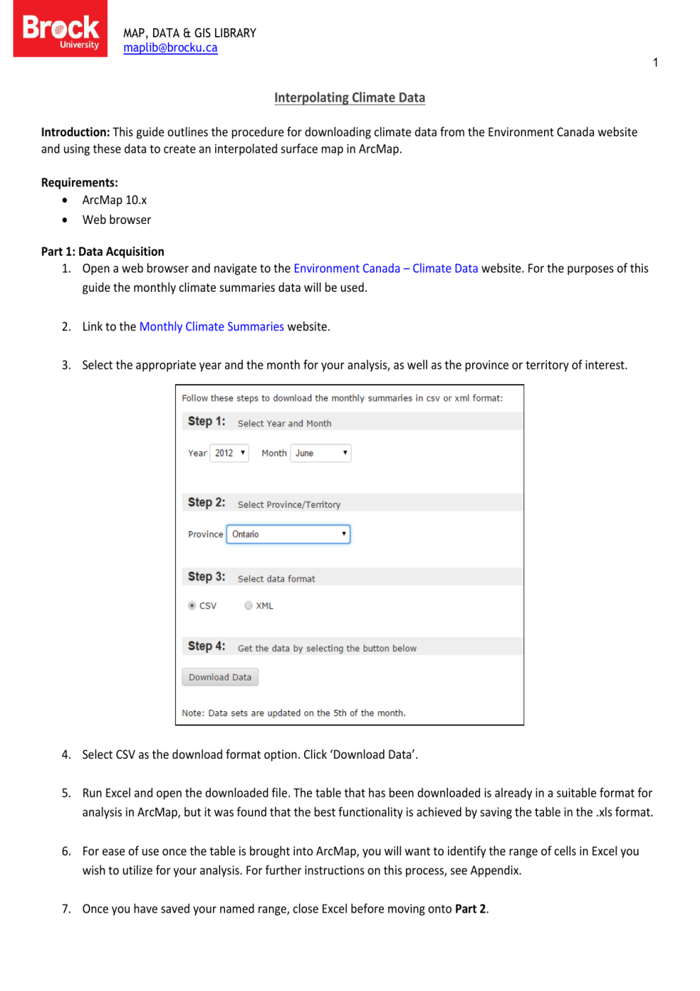 MAP, DATA & GIS LIBRARY [email protected] 1 Interpolating Climate Data Introduction: This guide outlines the procedure for downloading climate data from the Environment Canada website and using these data to create an interpolated surface map in ArcMap. Requirements: ArcMap 10.x Web browser Part 1: Data Acquisition 1. Open a web browser and navigate to the Environment Canada – Climate Data website. For the purposes of this guide the monthly climate summaries data will be used. 2. Link to the Monthly Climate Summaries website. 3. Select the appropriate year and the month for your analysis, as well as the province or territory of interest. 4. Select CSV as the download format option. Click ‘Download Data’. 5. Run Excel and open the downloaded file. The table that has been downloaded is already in a suitable format for analysis in ArcMap, but it was found that the best functionality is achieved by saving the table in the .xls format. 6. For ease of use once the table is brought into ArcMap, you will want to identify the range of cells in Excel you wish to utilize for your analysis. For further instructions on this process, see Appendix. 7. Once you have saved your named range, close Excel before moving onto Part 2. MAP, DATA & GIS LIBRARY [email protected] 2 Part 2: Interpolating Climate Variable in ArcMap 10.x 1. Run ArcMap 10.x. 2. Add the named range from Part 1 into ArcMap. 3. Set the projection (Right click ‘Layers’ in the Table of Contents > Properties… > Coordinate System tab) to a coordinate system that is appropriate for your study area. 4. Right click the table and select ‘Display XY Data…’. This displays the locations of the weather stations that you specified in your named range. 5. Once the points have been displayed you will save them as a shapefile (right click the point layer then select Data> Export Data…). Remove the Events layer from the contents. 6. From these points you can interpolate a continuous surface using a climate variable of your choosing, which can be found in the table downloaded from Environment Canada. For the purposes of this tutorial the two variables that will be utilized are temperature (Tm) and precipitation (P). 7. To interpolate a surface the ‘Kriging’ tool is used. Open the search tab and type in ‘Kriging’, select the ‘Kriging (Spatial Analyst)’ tool. 8. Select the shapefile that you created under ‘Input point features’ drop down menu. From the drop down menu under ‘Z value field’ select the variable of interest, in this case Tm, and accept all other defaults. You can only interpolate for one variable at a time. 9. After the tool has been carried out your interpolated surface will appear, this can then be clipped to a boundary file using the ‘Extract by Mask (Spatial Analyst)’ tool. 10. The symbology of the interpolated surface can be formatted (Properties… > Symbology tab) to change the colour and how the surface is displayed (i.e. classified or stretched). The example below utilizes two different colour ramps, and both data are displayed as ‘Classified’ as opposed to ‘Stretched’. 11. Repeat the process using different variables for a region, or a time series for one variable from different years. The map below is an example of two variables from the same month and year displayed on one map. MAP, DATA & GIS LIBRARY [email protected] 3 APPENDIX: Identifying a range of cells in Excel 1. 2. 3. 4. Click the top-leftmost cell to be included in the range (header of the first column of data). Hit F8 to begin the selection. On the keyboard hold down CTRL and hit END to stretch the range to the lowest rightmost cell of data. From the Excel ribbon, select FORMULAS and click NAME MANAGER. This tool allows us to assign a name to the selection of cells we are going to import to ArcGIS. 5. Click NEW and provide a descriptive name for the range of cells (i.e. Data_import). DO NOT INCLUDE SPACES OR SPECIAL CHARACTERS. 6. Click OK and close the Name Manager. 7. Select File > Save as… and save the file as an Excel Workbook 97-2003 (i.e. census_data.xls). DO NOT INCLUDE SPACES OR SPECIAL CHARACTERS. February 2015