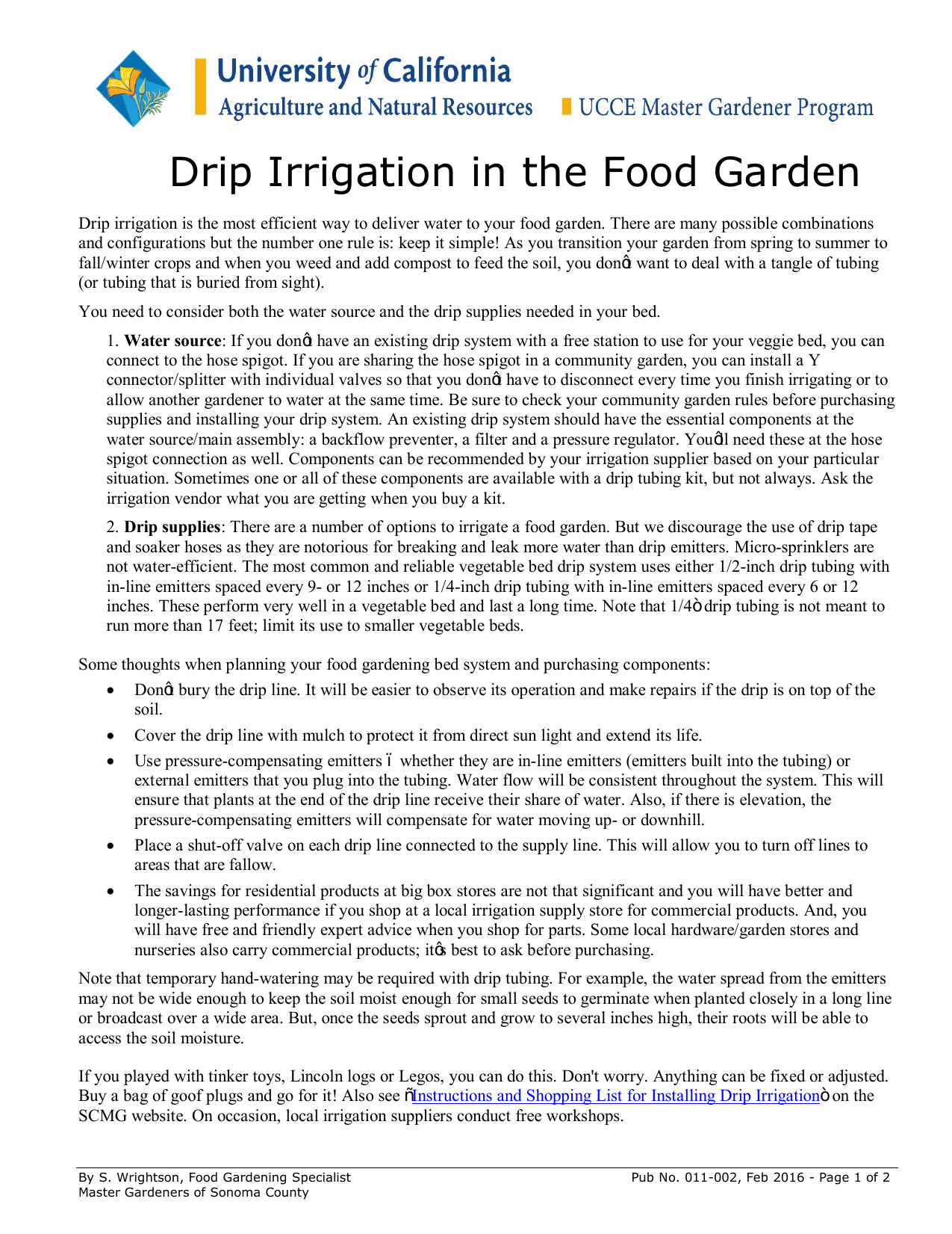 Drip Irrigation in the Food Garden Drip irrigation is the most efficient way to deliver water to your food garden. There are many possible combinations and configurations but the number one rule is: keep it simple! As you transition your garden from spring to summer to fall/winter crops and when you weed and add compost to feed the soil, you don’t want to deal with a tangle of tubing (or tubing that is buried from sight). You need to consider both the water source and the drip supplies needed in your bed. 1. Water source: If you don’t have an existing drip system with a free station to use for your veggie bed, you can connect to the hose spigot. If you are sharing the hose spigot in a community garden, you can install a Y connector/splitter with individual valves so that you don’t have to disconnect every time you finish irrigating or to allow another gardener to water at the same time. Be sure to check your community garden rules before purchasing supplies and installing your drip system. An existing drip system should have the essential components at the water source/main assembly: a backflow preventer, a filter and a pressure regulator. You’ll need these at the hose spigot connection as well. Components can be recommended by your irrigation supplier based on your particular situation. Sometimes one or all of these components are available with a drip tubing kit, but not always. Ask the irrigation vendor what you are getting when you buy a kit. 2. Drip supplies: There are a number of options to irrigate a food garden. But we discourage the use of drip tape and soaker hoses as they are notorious for breaking and leak more water than drip emitters. Micro-sprinklers are not water-efficient. The most common and reliable vegetable bed drip system uses either 1/2-inch drip tubing with in-line emitters spaced every 9- or 12 inches or 1/4-inch drip tubing with in-line emitters spaced every 6 or 12 inches. These perform very well in a vegetable bed and last a long time. Note that 1/4” drip tubing is not meant to run more than 17 feet; limit its use to smaller vegetable beds. Some thoughts when planning your food gardening bed system and purchasing components: · Don’t bury the drip line. It will be easier to observe its operation and make repairs if the drip is on top of the soil. · Cover the drip line with mulch to protect it from direct sun light and extend its life. · Use pressure-compensating emitters – whether they are in-line emitters (emitters built into the tubing) or external emitters that you plug into the tubing. Water flow will be consistent throughout the system. This will ensure that plants at the end of the drip line receive their share of water. Also, if there is elevation, the pressure-compensating emitters will compensate for water moving up- or downhill. · Place a shut-off valve on each drip line connected to the supply line. This will allow you to turn off lines to areas that are fallow. · The savings for residential products at big box stores are not that significant and you will have better and longer-lasting performance if you shop at a local irrigation supply store for commercial products. And, you will have free and friendly expert advice when you shop for parts. Some local hardware/garden stores and nurseries also carry commercial products; it’s best to ask before purchasing. Note that temporary hand-watering may be required with drip tubing. For example, the water spread from the emitters may not be wide enough to keep the soil moist enough for small seeds to germinate when planted closely in a long line or broadcast over a wide area. But, once the seeds sprout and grow to several inches high, their roots will be able to access the soil moisture. If you played with tinker toys, Lincoln logs or Legos, you can do this. Don't worry. Anything can be fixed or adjusted. Buy a bag of goof plugs and go for it! Also see “Instructions and Shopping List for Installing Drip Irrigation” on the SCMG website. On occasion, local irrigation suppliers conduct free workshops. By S. Wrightson, Food Gardening Specialist Master Gardeners of Sonoma County Pub No. 011-002, Feb 2016 - Page 1 of 2 Drip Irrigation in a 4’ x 8’ Vegetable Bed There are endless drip irrigation configurations for a food garden. This illustrates just one example of a simple system. A 1/2" supply line runs from the water source along one side of the vegetable bed. The end of the supply line is capped. Three 1/2” drip tubing lines with in-line emitters on 1 foot centers (i.e., emitters are 12” apart) run over the top of the soil. Pressure-compensating inline emitters will apply water uniformly. The emitters are 1/2 GPH (gallons per hour). These lines are capped and connected to the supply line using either slip-lock tees or compression tees. Add-ons may include: 1) shut-off valves on the individual drip lines; 2) a shut-off valve and slip-lock connection along the supply line that allows the entire assembly to be removed from the bed; and/or 3) a battery-operated timer if the water source is a hose spigot vs. an irrigation system station. Small beds can utilize 1/4" drip tubing with hollow transfer barbs punched into the supply line. But note that 1/4" drip tubing is not meant to run more than 17 feet. Both 1/2” and 1/4" drip tubing have in-line emitters with different spacing. The emitter spacing selection is determined by the crop spacing. Water Source References: 1) Drip Irrigation in the Home Landscape, University of California, Agriculture and Natural Resources, Publication 21579. 2) Drip Irrigation for Every Landscape and All Climates, Robert Kourik. For help with your garden problems, call the Master Gardener hotline at 565-2608 or visit the Master Gardener information desk in the University of California Cooperative Extension office (133 Aviation Blvd., # 109, Santa Rosa), or ask a Master Gardener at your local farmers market or the Sonoma County Fair or other event. See our w