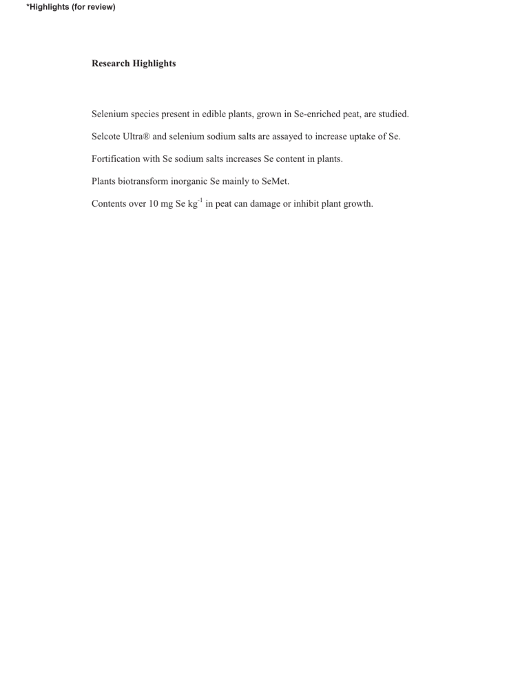 *Highlights (for review) Research Highlights Selenium species present in edible plants, grown in Se-enriched peat, are studied. Selcote Ultra® and selenium sodium salts are assayed to increase uptake of Se. Fortification with Se sodium salts increases Se content in plants. Plants biotransform inorganic Se mainly to SeMet. Contents over 10 mg Se kg-1 in peat can damage or inhibit plant growth. *Manuscript Click here to view linked References 1 Selenium uptake by edible plants from enriched peat 2 3 4 5 Funes-Collado Virginia*, Morell-Garcia Albert*, Rubio R.*,**, López-Sánchez J. Fermín* , ** 6 C/ Martí i Franquès 1-11, E- 08028, Barcelona (Spain) 7 ** Water Research Institute. Universitat de Barcelona. Barcelona. Spain 8 e-mail address: [email protected] * Departament de Química Analítica. Facultat de Química. Universitat de Barcelona 9 10 Abstract 11 As a constituent of selenoproteins, selenium (Se) is considered an essential element for human 12 health. The main way that Se enters the body is via the consumption of vegetables, whose 13 concentration of this element depends on soil Se content. We grew cabbage, lettuce, chard and 14 parsley, in peat enriched in Se by means of the additive Selcote Ultra® and Na2SeO3 and 15 Na2SeO4. Total Se in plants was determined by acidic digestion and Se speciation by an 16 enzymatic extraction. Both were measured by ICP/MS. The concentration ranges were between 17 0.1 mg Se kg-1 and 30 mg Se kg-1 for plants grown in Selcote Ultra® media, and between 0.4 mg 18 Se kg-1 and 1606 mg Se kg-1 for those grown in peat enriched with Se sodium salts. We found Se 19 (IV), Se (VI) and SeMet in all the extracts. Peat fortified with Selcote Ultra® gave slightly 20 higher Se concentration than natural content values. For plants grown with selenium sodium 21 salts, Se content increases with the Se added and part of the inorganic Se was converted mainly 22 to SeMet. A high Se fortification can damage or inhibit plant growth. Cabbage showed the 23 greatest tolerance to Se. 24 25 Keywords: edible plants, enzymatic extraction, LC-ICP/MS, Se-amino acids, Selenate, Selenite. 26 27 28 1. Introduction 1 29 30 Selenium (Se) is an essential element for humans and higher animals, since it is present in 31 several selenoproteins that contribute to preventing oxidative cellular degradation (Zeng and 32 Combs, 2008). This element is incorporated into the primary structure of these proteins as the 33 amino acid selenocysteine (SeCys). In the 1970s, it was discovered that Se was a constituent of 34 the anti-oxidant enzyme glutathione peroxidase (GPX). In addition, it is involved in thyroid 35 hormone homeostasis, immunity, and fertility, among other activities (Reilly 2006). Se generates 36 nutritional and toxicological concerns as the difference between its essentiality and toxicity in 37 dose-response curves is very narrow. The European Directive 2008/100/CE determines the RDA 38 (Recommended Daily Amount) of this element at 55 µg day-1, and the maximum Se 39 consumption without risk to health is 300 µg day-1 in adults. According with the literature, the 40 NOAEL (Non Observed Adverse Effects Level) is considered to be about 800 µg Se day-1 while 41 the LOAEL (Lowest Observed Adverse Effects Level) is 1500 µg Se day-1 and symptoms of 42 toxicity are observed with an intake of 6300 µg Se day-1 (Scientific Committee on Food, 2000; 43 Wangher et al., 1996). 44 Se deficiency in humans causes ailments such as Keshan disease, a heart disorder, and Kaschin- 45 Beck disease, a degenerative disorder that affects bone. However, at elevated doses Se can cause 46 toxic effects (Tan et al., 2002; Hartikanen, 2005; Lenz and Lens, 2009). Furthermore, the 47 essential or toxic effect of this element in humans depends on its chemical form (Reilly, 2006). 48 The major source of Se in most human diets is provided by plants. The availability of Se to the 49 plant is determined by soil properties and conditions. Thus Se can occur as inorganic (selenite 50 and selenate) or organic forms. Selenate, which is more soluble than selenite, can pass directly 51 into plant roots; in contrast the uptake mechanism for selenite is unclear (Sager, 2006; Lin, 52 2009). Selenate competes with sulphate transport in the root plasma membrane and it is much 2 53 more abundant in leaves than selenite (Reilly, 2006). Inorganic Se absorbed by plants is 54 metabolised in a variety of ways to organic Se compounds, the distinct molecular structures of 55 which depend on the plant species (Gammelgaard and Jackson, 2011). Soils differ greatly in Se 56 content, and in some geographical zones low concentrations lead to a decrease in plant Se uptake 57 (Moreno Rodriguez et al., 2005; Hawkesford and Zhao, 2007; Spadoni et al., 2007). In some 58 countries, inorganic Se compounds are commonly used as additives in fertilisers to improve the 59 nutritional quality of local foodstuffs. This practice of Se fertilisation has been applied mainly in 60 Finland and New Zealand (Eurola, 2000). A number of studies have addressed the effects of 61 distinct forms of Se and cultivation conditions on edible plants. These studies mainly used 62 selenite and selenate as sodium salts or barium salts (Iwashita and Nishi, 2004; Rayman et al., 63 2008; Broadley et al., 2010). Other strategies have been proposed to enhance the uptake of Se by 64 plants, thus the generation of wetting and drying cycles in soil can convert more Se into soluble 65 selenate, which is more amenable for uptake by plants (Shrestha et al., 2006). Several dominant 66 species have been identified in plant foods. The main one is SeMet, and its behaviour has been 67 examined widely due to interest in its biological activity (Reilly, 2006; Mechora et al., 2012; 68 Mazej et al., 2007). Here we addressed Se speciation in vegetables. For this purpose, we grew 69 cabbage (Brassica oleracea), lettuce (Lactuca sativa), chard (Beta vulgaris) and parsley 70 (Petroselinum cr