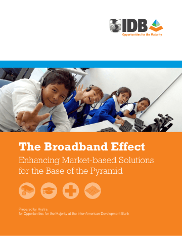 The Broadband Effect Enhancing Market-based Solutions for the Base of the Pyramid Prepared by Hystra for Opportunities for the Majority at the Inter-American Development Bank Authors Olivier Kayser, Hystra Managing Director Lucie Klarsfeld, Hystra Project Manager Simon Brossard, Hystra Consultant Disclaimer Hystra is the author of this report. The opinions expressed in this publication are those of the authors and do not necessarily reflect the views of the InterAmerican Development Bank, its Board of Directors, or the countries they represent. Contributors Inès Mazas, Hystra Consultant Caroline Nehls, Hystra Consultant Image credits Unless otherwise noted, all images were provided by case study teams and are copyrighted by the providing organizations. The following images are reproduced from Wikimedia Commons under Creative Commons license with the following attributions: Larry.vt.300 (p25), Gustavo Benítez (p26). IDB Internal Reviewers María Lourdes Gallardo de Montoya (Team Leader), Mónica Fernández Álvarez de Lugo, Antonio García Zaballos, Félix González, Enrique Iglesias, Nathaniel Jackson, Dana Martin, Enrique Moreno de Acevedo, Lina Salazar Ortegón and Ana Silva. Copyright The unauthorized commercial use of Bank documents is prohibited and may be punishable under the Bank’s policies and/or applicable laws. Copyright © 2014 Inter-American Development Bank. All rights reserved; may be freely reproduced for any non-commercial purpose. Design TRUTHstudio (www.truthstudio.com) Cataloging-in-Publication data provided by the Inter-American Development Bank Felipe Herrera Library Kayser, Olivier. The broadband effect: enhancing market-based solutions for the base of the pyramid / Olivier Kayser, Lucie Klarsfeld, Simon Brossard. p. cm. 1. Business enterprises—Technological innovations. 2. Broadband communication systems—Social aspects. 3. Broadband communication systems—Economic aspects. 4. Telecommunication policy. I. Klarsfeld, Lucie. II. Brossard, Simon. III. Inter-American Development Bank. Opportunities for the Majority Sector. IV. Title. IDB-BR-144 About the IDB About Hystra Opportunities for the Majority The Opportunities for the Majority (OMJ) initiative promotes and finances market-based, commercially viable business models that engage private sector companies, local governments, and communities in the development and delivery of quality goods and services for the base of the pyramid (BOP) in Latin America and the Caribbean. Hystra is a global consulting firm that works with business and social sector pioneers to design and implement BOP business approaches that are profitable and scalable, and that mitigate social and environmental problems. In order to “be the change we want to see in the world,” Hystra itself is a hybrid consulting firm – a for-profit tool for social change. Since its creation in 2009, Hystra has conducted in-depth sectoral studies on clean energy, safe water, affordable housing, and ICT-based business models for development; analyzed winning marketing strategies in micro distribution; designed new models to serve low-income communities with home improvement packages, irrigation pumps, solar lights, safe water, and improved nutrition products; prepared business plans for pioneering BOP businesses; and supported the creation of a social impact fund. The IDB team would like to thank the following individuals for their contributions: Rafael Anta, Johnny Jirón, Jorge Godoy, Daniel Granada, Francisco Hernández, Sergio Juarez, Claudia Martínez, Elizabeth Mondl, Mario Torres, and Eunjiin Kim. Please direct queries to: [email protected]. Created in 2007 as part of the Private Sector Group of the Inter-American Development Bank (IDB), OMJ provides financing to small, medium-size, and large companies, financial institutions, and funds that support the development or expansion of business models that serve BOP markets. OMJ has supported BOP business models in 18 countries of the region in different sectors such as health, education, housing, and financial services, among others. The Broadband Initiative The Inter-American Development Bank, through its Institutional Capacity of the State Division, offers operational instruments and knowledge products to support its clients, with the aim of accelerating broadband access and promoting broadband use through public policies that foster the implementation of broadband development plans and digitalization strategies, strategic regulations, infrastructure, and human capital in the public and private sectors. Hystra has served over 40 clients from 17 countries, supporting business models that change lives in low-income communities across the globe. Clients have included large corporations, international aid agencies, foundations, and governments. The Broadband Effect Enhancing Market-based Solutions for the Base of the Pyramid Prepared by Hystra for Opportunities for the Majority at the Inter-American Development Bank Contents List of Acronyms .................................................................................................................................................................................... iii Acknowledgements .............................................................................................................................................................................. iv Foreword .................................................................................................................................................................................................. 1 Executive Summary ............................................................................................................................................................................... 2 Three Market-based, Broadband-enabled Business Models...............................................................................................................................................