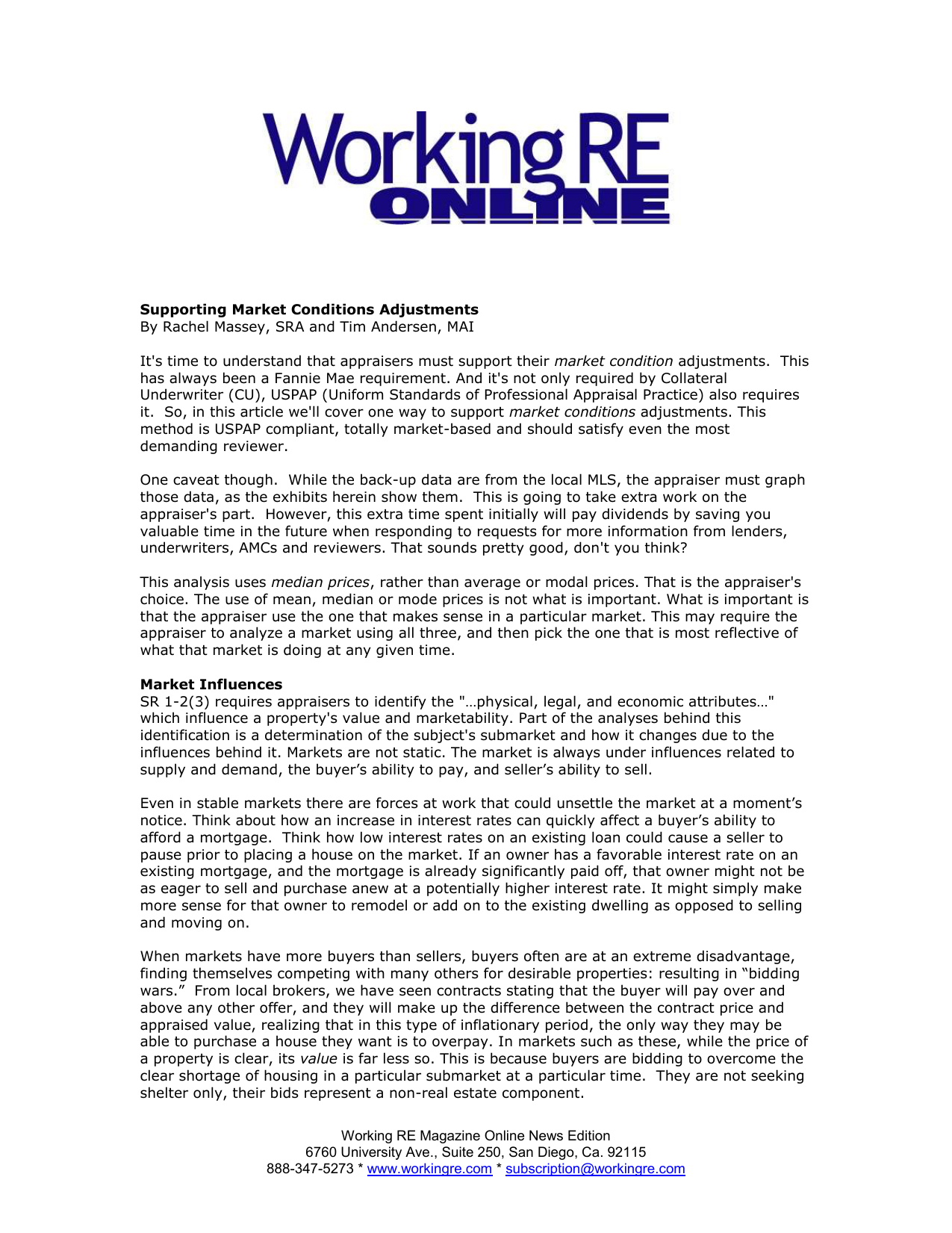 Supporting Market Conditions Adjustments By Rachel Massey, SRA and Tim Andersen, MAI It's time to understand that appraisers must support their market condition adjustments. This has always been a Fannie Mae requirement. And it's not only required by Collateral Underwriter (CU), USPAP (Uniform Standards of Professional Appraisal Practice) also requires it. So, in this article we'll cover one way to support market conditions adjustments. This method is USPAP compliant, totally market-based and should satisfy even the most demanding reviewer. One caveat though. While the back-up data are from the local MLS, the appraiser must graph those data, as the exhibits herein show them. This is going to take extra work on the appraiser's part. However, this extra time spent initially will pay dividends by saving you valuable time in the future when responding to requests for more information from lenders, underwriters, AMCs and reviewers. That sounds pretty good, don't you think? This analysis uses median prices, rather than average or modal prices. That is the appraiser's choice. The use of mean, median or mode prices is not what is important. What is important is that the appraiser use the one that makes sense in a particular market. This may require the appraiser to analyze a market using all three, and then pick the one that is most reflective of what that market is doing at any given time. Market Influences SR 1-2(3) requires appraisers to identify the "…physical, legal, and economic attributes…" which influence a property's value and marketability. Part of the analyses behind this identification is a determination of the subject's submarket and how it changes due to the influences behind it. Markets are not static. The market is always under influences related to supply and demand, the buyer’s ability to pay, and seller’s ability to sell. Even in stable markets there are forces at work that could unsettle the market at a moment’s notice. Think about how an increase in interest rates can quickly affect a buyer’s ability to afford a mortgage. Think how low interest rates on an existing loan could cause a seller to pause prior to placing a house on the market. If an owner has a favorable interest rate on an existing mortgage, and the mortgage is already significantly paid off, that owner might not be as eager to sell and purchase anew at a potentially higher interest rate. It might simply make more sense for that owner to remodel or add on to the existing dwelling as opposed to selling and moving on. When markets have more buyers than sellers, buyers often are at an extreme disadvantage, finding themselves competing with many others for desirable properties: resulting in “bidding wars.” From local brokers, we have seen contracts stating that the buyer will pay over and above any other offer, and they will make up the difference between the contract price and appraised value, realizing that in this type of inflationary period, the only way they may be able to purchase a house they want is to overpay. In markets such as these, while the price of a property is clear, its value is far less so. This is because buyers are bidding to overcome the clear shortage of housing in a particular submarket at a particular time. They are not seeking shelter only, their bids represent a non-real estate component. Working RE Magazine Online News Edition 6760 University Ave., Suite 250, San Diego, Ca. 92115 888-347-5273 * www.workingre.com * [email protected] Measuring Market Influences As appraisers, we need to measure the market for each and every appraisal we complete. We need to know whether prices are increasing in an undersupplied market or declining in a weak and/and oversupplied market. If the market is truly balanced between supply and demand, we need to be measuring this as well. There is more than one way to arrive at a conclusion related to market direction, as well as support adjustments related to changing market conditions. The following information is the method I use to determine both market direction as well as the dynamic that exists between supply and demand factors. It is labor-intensive from the standpoint of having to run data for multiple periods of time and in more than one market segment. However, it also provides an excellent measure of how the markets are behaving in a geographic area. For the purposes of comparison, I concluded that the boundaries of the local school district are reasonable for determining the larger market. These sales and listing data pertinent to the entire school district do not include any distressed and/or “to-be-built” sales or any data pertinent to a particular submarket that I have under study. The graph below shows the school district data in blue, with the submarket data in orange. While we actually ran more data, we believe the following is sufficient to indicate market direction. The subject for this example is a hypothetical 2,500 square foot house, built in 1998 on a quarter-acre site in a standard subdivision, including the townships, on the west side of Ann Arbor. The graph shows the school district as a whole, as well as the subject's submarket. The charts also show both median sales prices and median prices per square foot for both of these markets for further comparison purposes: Monthly data in median price Working RE Magazine Online News Edition 6760 University Ave., Suite 250, San Diego, Ca. 92115 888-347-5273 * www.workingre.com * [email protected] Monthly data in median price per square foot The two charts above compare median sales price for the entire Ann Arbor market (sans foreclosure and distress sales) compared to the west side of town, narrowed in size and age. The narrowed market is more the “submarket” in which the subject competes, and the wider market is the entire school district. The data above are from one year, run in monthly segments. Doing it this way provides a more nuanced view of market trends, rather th