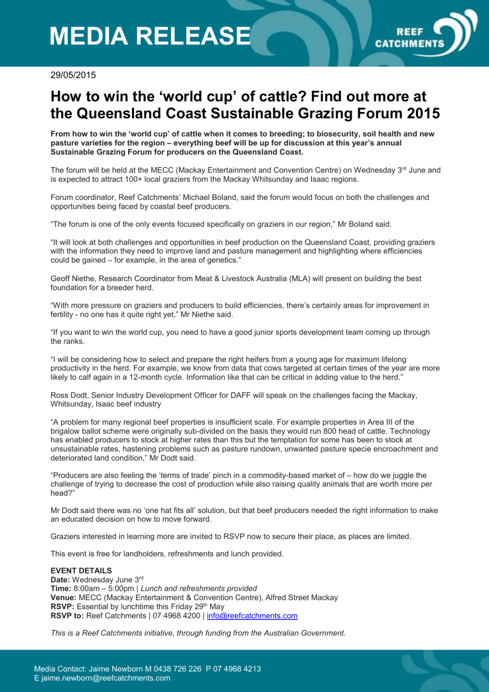 MEDIA RELEASE 29/05/2015 How to win the ‘world cup’ of cattle? Find out more at the Queensland Coast Sustainable Grazing Forum 2015 From how to win the ‘world cup’ of cattle when it comes to breeding; to biosecurity, soil health and new pasture varieties for the region – everything beef will be up for discussion at this year’s annual Sustainable Grazing Forum for producers on the Queensland Coast. The forum will be held at the MECC (Mackay Entertainment and Convention Centre) on Wednesday 3rd June and is expected to attract 100+ local graziers from the Mackay Whitsunday and Isaac regions. Forum coordinator, Reef Catchments’ Michael Boland, said the forum would focus on both the challenges and opportunities being faced by coastal beef producers. “The forum is one of the only events focused specifically on graziers in our region,” Mr Boland said. “It will look at both challenges and opportunities in beef production on the Queensland Coast, providing graziers with the information they need to improve land and pasture management and highlighting where efficiencies could be gained – for example, in the area of genetics.” Geoff Niethe, Research Coordinator from Meat & Livestock Australia (MLA) will present on building the best foundation for a breeder herd. “With more pressure on graziers and producers to build efficiencies, there’s certainly areas for improvement in fertility - no one has it quite right yet,” Mr Niethe said. “If you want to win the world cup, you need to have a good junior sports development team coming up through the ranks. “I will be considering how to select and prepare the right heifers from a young age for maximum lifelong productivity in the herd. For example, we know from data that cows targeted at certain times of the year are more likely to calf again in a 12-month cycle. Information like that can be critical in adding value to the herd.” Ross Dodt, Senior Industry Development Officer for DAFF will speak on the challenges facing the Mackay, Whitsunday, Isaac beef industry “A problem for many regional beef properties is insufficient scale. For example properties in Area III of the brigalow ballot scheme were originally sub-divided on the basis they would run 800 head of cattle. Technology has enabled producers to stock at higher rates than this but the temptation for some has been to stock at unsustainable rates, hastening problems such as pasture rundown, unwanted pasture specie encroachment and deteriorated land condition,” Mr Dodt said. “Producers are also feeling the ‘terms of trade’ pinch in a commodity-based market of – how do we juggle the challenge of trying to decrease the cost of production while also raising quality animals that are worth more per head?” Mr Dodt said there was no ‘one hat fits all’ solution, but that beef producers needed the right information to make an educated decision on how to move forward. Graziers interested in learning more are invited to RSVP now to secure their place, as places are limited. This event is free for landholders, refreshments and lunch provided. EVENT DETAILS Date: Wednesday June 3rd Time: 8:00am – 5:00pm | Lunch and refreshments provided Venue: MECC (Mackay Entertainment & Convention Centre), Alfred Street Mackay RSVP: Essential by lunchtime this Friday 29th May RSVP to: Reef Catchments | 07 4968 4200 | [email protected] This is a Reef Catchments initiative, through funding from the Australian Government. Media Contact: Jaime Newborn M 0438 726 226 P 07 4968 4213 E [email protected] MEDIA RELEASE IMAGE1: Eungella grazier Kel Tennent. After receiving funding for improved land management through the Reef Programme, the Tennent's have completed 2.8km of riparian fencing, installed three off-stream watering points, completed a Stocktake pasture course and implemented pasture monitoring and improved pasture management. Graziers can find out more at the Mackay Grazing Forum 2015, on again Wednesday 3rd June at the MECC. IMAGE2: How to win the ‘world cup’ of cattle? MLA’s Geoff Niethe will present on building the best foundation for a breeder herd. Media Contact: Jaime Newborn M 0438 726 226 P 07 4968 4213 E [email protected]