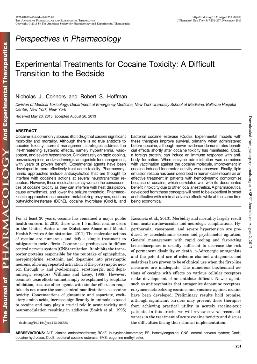 1521-0103/347/2/251–257$25.00 THE JOURNAL OF PHARMACOLOGY AND EXPERIMENTAL THERAPEUTICS Copyright ª 2013 by The American Society for Pharmacology and Experimental Therapeutics http://dx.doi.org/10.1124/jpet.113.206383 J Pharmacol Exp Ther 347:251–257, November 2013 Perspectives in Pharmacology Experimental Treatments for Cocaine Toxicity: A Difficult Transition to the Bedside Nicholas J. Connors and Robert S. Hoffman Division of Medical Toxicology, Department of Emergency Medicine, New York University School of Medicine, Bellevue Hospital Center, New York, New York ABSTRACT Cocaine is a commonly abused illicit drug that causes significant morbidity and mortality. Although there is no true antidote to cocaine toxicity, current management strategies address the life-threatening systemic effects, namely hyperthermia, vasospasm, and severe hypertension. Clinicians rely on rapid cooling, benzodiazepines, and a-adrenergic antagonists for management, with years of proven benefit. Experimental agents have been developed to more effectively treat acute toxicity. Pharmacodynamic approaches include antipsychotics that are thought to interfere with cocaine’s actions at several neurotransmitter receptors. However, these medications may worsen the consequences of cocaine toxicity as they can interfere with heat dissipation, cause arrhythmias, and lower the seizure threshold. Pharmacokinetic approaches use cocaine-metabolizing enzymes, such as butyrylcholinesterase (BChE), cocaine hydrolase (CocH), and For at least 30 years, cocaine has remained a major public health concern. In 2010, there were 1.5 million cocaine users in the United States alone (Substance Abuse and Mental Health Services Administration, 2011). The molecular actions of cocaine are numerous and defy a simple treatment to mitigate its toxic effects. Cocaine use predisposes to diffuse central nervous system (CNS) excitation. It inhibits the transporter proteins responsible for the reuptake of epinephrine, norepinephrine, serotonin, and dopamine into presynaptic neurons, allowing repeated activation of the postsynaptic neuron through a- and b-adrenergic, serotonergic, and dopaminergic receptors (Williams and Lacey, 1988). However, cocaine’s toxic effects cannot simply be explained by reuptake inhibition, because other agents with similar effects on reuptake do not cause the same clinical manifestations as cocaine toxicity. Concentrations of glutamate and aspartate, excitatory amino acids, increase significantly in animals exposed to cocaine and may play a crucial role in acute toxicity and neuromodulation resulting in addiction (Smith et al., 1995; dx.doi.org/10.1124/jpet.113.206383. bacterial cocaine esterase (CocE). Experimental models with these therapies improve survival, primarily when administered before cocaine, although newer evidence demonstrates beneficial effects shortly after cocaine toxicity has manifested. CocE, a foreign protein, can induce an immune response with antibody formation. When enzyme administration was combined with vaccination against the cocaine molecule, improvement in cocaine-induced locomotor activity was observed. Finally, lipid emulsion rescue has been described in human case reports as an effective treatment in patients with hemodynamic compromise because of cocaine, which correlates well with its documented benefit in toxicity due to other local anesthetics. A pharmaceutical developed from these concepts will need to be expedient in onset and effective with minimal adverse effects while at the same time being economical. Kasanetz et al., 2013). Morbidity and mortality largely result from acute cardiovascular and neurologic complications. Hyperthermia, vasospasm, and severe hypertension are produced by catecholamine excess and psychomotor agitation. General management with rapid cooling and fast-acting benzodiazepines is usually sufficient to decrease the risk of permanent disability or death. a-Adrenergic antagonists and the potential use of calcium channel antagonists and sedatives have proven to be of clinical use when the first-line measures are inadequate. The numerous biochemical actions of cocaine with effects on various cellular receptors make development of an antidote difficult. Newer agents such as antipsychotics that antagonize dopamine receptors, enzymes-metabolizing cocaine, and vaccines against cocaine have been developed. Preliminary results hold promise, although significant barriers may prevent these therapies from achieving practical utility in acutely cocaine-toxic patients. In this article, we will review several recent advances in the treatment of acute cocaine toxicity and discuss the difficulties facing their clinical implementation. ABBREVIATIONS: ALT, alanine aminotransferase; BChE, butyrylcholinesterase; BE, benzoylecgonine; CNS, central nervous system; CocH, cocaine hydrolase; CocE, bacterial cocaine esterase; EME, ecgonine methyl ester. 251 Downloaded from jpet.aspetjournals.org at ASPET Journals on August 2, 2017 Received May 20, 2013; accepted August 26, 2013 252 Connors and Hoffman Current Clinical Management Cooling Benzodiazepines Generalized suppression of central nervous system activity antagonizes the sympathomimetic effects of cocaine. In animal models of cocaine toxicity, sedation with a benzodiazepine increases the mean lethal and convulsive doses of cocaine (Guinn et al., 1980) and improves survival (Guinn et al., 1980; Catravas and Waters, 1981; Yuksel et al., 2013). Through their action on the g-aminobutyric acid receptors in the amygdala and reticular activating system, benzodiazepines function as anxiolytics, sedatives, and antiepileptics. Additionally, benzodiazepines may enhance the effect of endogenous adenosine on the myocardium by inhibiting the nucleoside transporter responsible for adenosine reuptake with resultant coronary vasodilation from A2A receptor agonism (Seubert et al., 2000). Benzodiazepines also relieve tachycardia, hypertension, an
