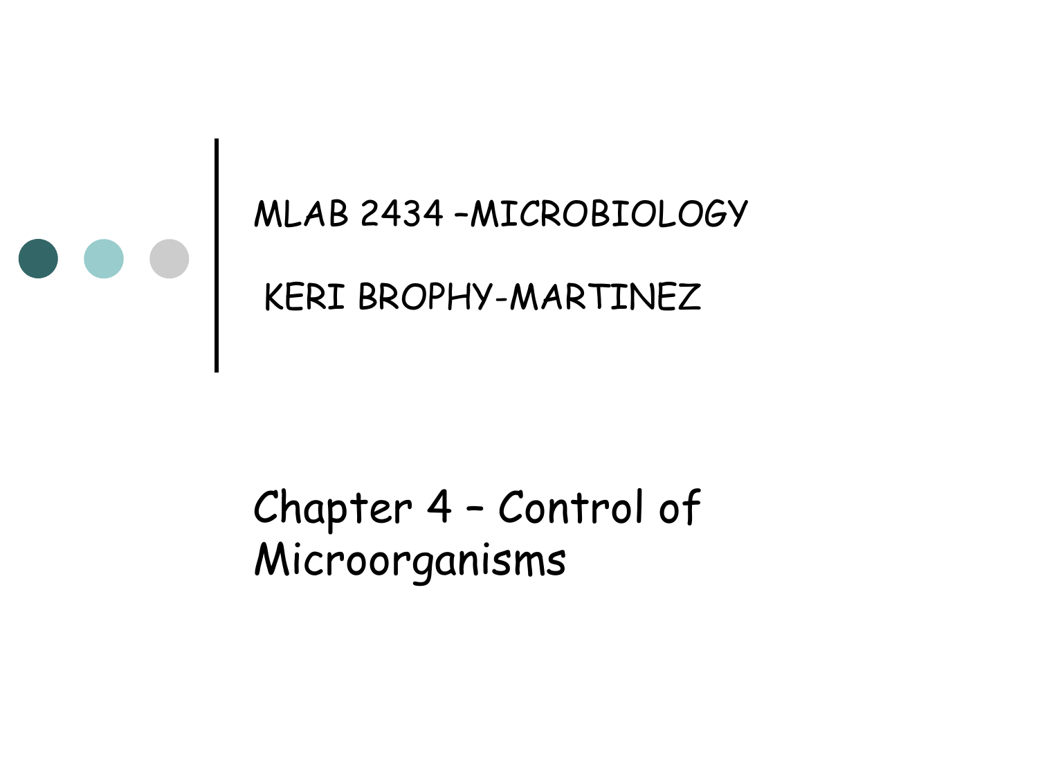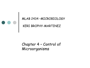 MLAB 2434 –MICROBIOLOGY KERI BROPHY-MARTINEZ Chapter 4 – Control of Microorganisms Control of Microorganisms (cont’d) Sterilization vs. Disinfectant Sterilization • Removes all forms of life, including spores • “All or nothing” process • Chemical or physical Control of Microorganisms (cont’d) Disinfection • Removes all pathogenic organisms but not necessarily all spores • “Disinfectants” are chemicals applied to inanimate objects • “Antiseptics” are disinfectants applied to living tissue. They do not kill spores. Control of Microorganisms (cont’d) Factors Influencing Degree of Killing Types of organisms - Bacterial spores, mycobacteria, nonlipid viruses, fungi, bacteria, lipid viruses (most resistant to least resistant) Control of Microorganisms (cont’d) Number of organisms – microbial load • The higher the number of organisms, more exposure to the killing agent is required. Concentration of disinfecting agent Presence of organic material • Affects killing activity by inactivating disinfecting agent Nature of the surface to be disinfected Contact time Temperature Control of Microorganisms (cont’d) Methods of Disinfection & Sterilization Physical Methods: mainly for sterilization • Moist Heat – autoclave = 15 psi at 121° C for 15 minutes • Dry Heat- 1.5-3 hours @ 160- 180o • Bacticinerator • Hot air ovens ( glassware) • Boiling & pasteurization • Do NOT sterilize or remove spores Control of Microorganisms (cont’d) • Radiation: used to sterilize disposable medical supplies (catheters, syringes) • Filtration • Liquids: liquid is pulled through cellulose acetate or cellulose nitrate membrane with a vacuum. Used for heat sensitive liquids such as serum, antibiotic solutions, toxic chemicals and vaccines • Air: use high-efficiency-particulate air (HEPA) filters. Designed to remove organisms larger than 0.3 µm from isolation rooms, biological cabinets and respirators Control of Microorganisms Quality control for Sterilization Procedures For each load: • Temperature & duration of cycle should be checked and recorded • Indicator tape is attached to each item Weekly: • Check biological indicators • Bacterial spores are used as indicator of sterilization • Sporestrips are placed in the center of the load to be sterilized. After the cycle, the strips are cultured to demonstrate complete kill. • Spores used • Bacillus stearothermophilusmoist steam • Bacillus subtilis- dry heat Control of Microorganisms Chemical Methods: used in disinfection Control of Microorganisms (cont’d) Microbiology Laboratory Safety Program Address biological hazards Describe safe handling, storage and disposal of biological hazards & chemicals • MSDS: Material Safety Data Sheets • Biohazard bags & sharps containers Correct techniques for lifting and moving heavy objects Procedures in event of fire, natural disasters, and bomb threats • Fires: R= rescue A= alarm C= contain E=extinguish • Electrical: grounded 3-pronged plugs, check for frayed cords Control of Microorganisms (cont’d) Occupational Safety and Health Administration (OSHA) Safety training for potentially exposed employees Goal is to protect workers Control of Microorganisms (cont’d) Exposure Control Plan Required by OSHA • Determine tasks that may result in hazards • A plan to investigate exposure and prevent reoccurrences • Methods of compliance with universal precautions • Engineering and work practice controls • Personal protective equipment (PPE) • Workplace cleanliness • Handling and disposal of waste • Active hazard training programs Control of Microorganisms (cont’d) Universal/standard precautions Developed in 1985, redone in 1996 All blood and body fluids are treated as infectious • Lone exception is sweat Precautions address • Hand washing • Gloves, mask, eye protection • Lab coats • Appropriate sharps disposal • Environmental controls • Employers are required to provide appropriate PPE Control of Microorganisms (cont’d) Engineering controls Controls designed to remove hazards from the workplace • Some examples are eye wash stations, safety showers, eye shields Control of Microorganisms (cont’d) Handling Biological Hazards Two sources of hazards: • Patient specimens • Actively growing cultures of microorganisms Control of Microorganisms (cont’d) Biosafety levels (BSL) BSL-1 • Well classified and not known to cause disease • Standard PPE BSL-2 • Moderate potential hazard • PPE and BSC class I Control of Microorganisms (cont’d) BSL-3 • Potential aerosol transmission • Agents may have serious lethal consequences • PPE, BSC Class II or III, negative-pressure rooms BSL-4 • Dangerous and exotic pathogens • PPE, BSC Class III, negative-pressure rooms • Decontamination of room and personnel after use Control of Microorganisms (cont’d) Safety Cabinets (Hoods) Class I – exhaust fan moves the air inward through the open front. Air passes through HEPA filter. Example = chemical fume hood Class II – air pulled inward and downward and then passes through HEPA filter before reaching work surface. Example = most common microbiology laboratory hood Control of Microorganisms (cont’d) Class III Self-contained, ventilated system for highly infectious microorganisms Provides highest level of personal protection Closed front contains attached gloves for work on bench Safety Cabinets (Hoods) References Engelkirk, P., & Duben-Engelkirk, J. (2008). Laboratory Diagnosis of Infectious Diseases: Essentials of Diagnostic Microbiology . Baltimore, MD: Lippincott Williams and Wilkins. http://www.diytrade.com/china/4/products/3957592/EO_Gas_Indicator_ta pe.html http://www.fishersci.com/ecomm/servlet/fsproductdetail?catalogId=1&productId=664041&langId=1&storeId=10652&distype=2&isChemical=false&fromSearch=0 Mahon, C. R., Lehman, D. C., & Manuselis, G. (2011). Textbook of Diagnostic Microbiology (4th ed.). Maryland Height