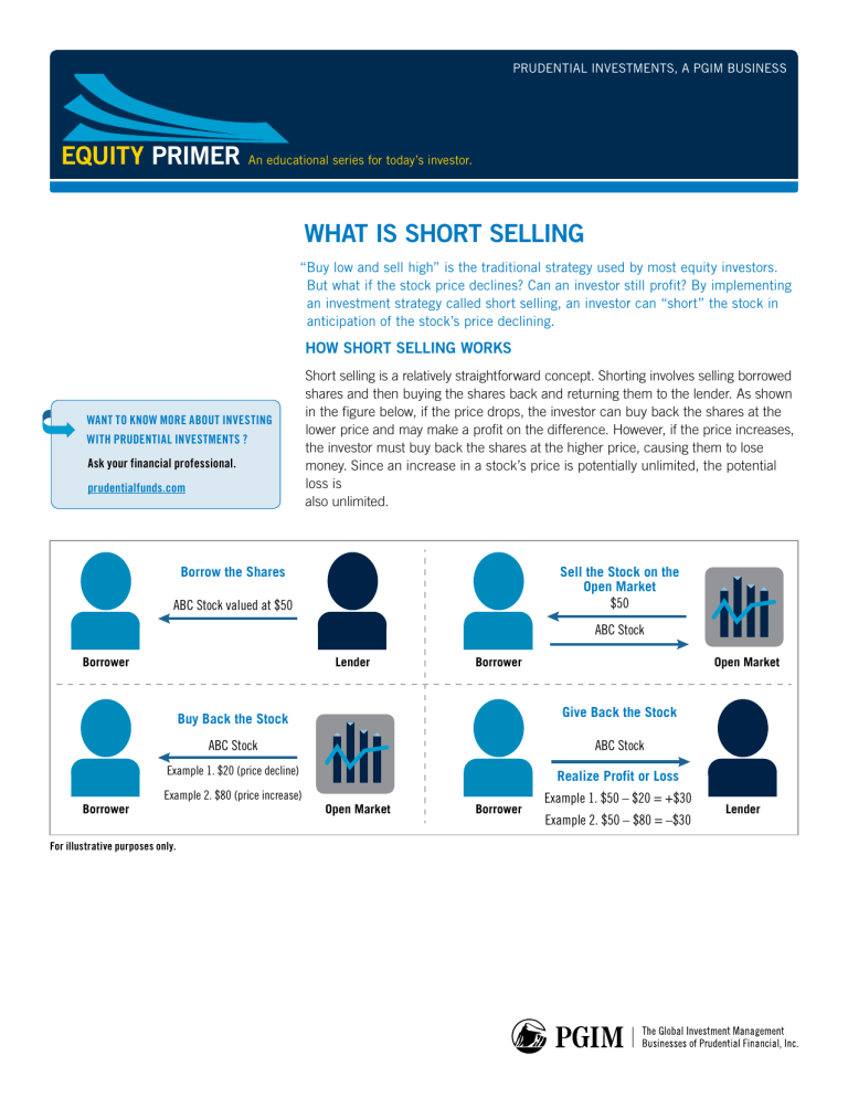 PRUDENTIAL INVESTMENTS, A PGIM BUSINESS EQUITY PRIMER An educational series for today’s investor. WHAT IS SHORT SELLING “Buy low and sell high” is the traditional strategy used by most equity investors. But what if the stock price declines? Can an investor still profit? By implementing an investment strategy called short selling, an investor can “short” the stock in anticipation of the stock’s price declining. HOW SHORT SELLING WORKS WANT TO KNOW MORE ABOUT INVESTING WITH PRUDENTIAL INVESTMENTS ? Ask your financial professional. prudentialfunds.com Short selling is a relatively straightforward concept. Shorting involves selling borrowed shares and then buying the shares back and returning them to the lender. As shown in the figure below, if the price drops, the investor can buy back the shares at the lower price and may make a profit on the difference. However, if the price increases, the investor must buy back the shares at the higher price, causing them to lose money. Since an increase in a stock’s price is potentially unlimited, the potential loss is also unlimited. Borrow the Shares Sell the Stock on the Open Market $50 ABC Stock valued at $50 ABC Stock Borrower Borrower Lender Borrower Open Market Buy Back the Stock Give Back the Stock ABC Stock ABC Stock Example 1. $20 (price decline) Realize Profit or Loss Example 2. $80 (price increase) For illustrative purposes only. Open Market Borrower Example 1. $50 – $20 = +$30 Example 2. $50 – $80 = –$30 Lender EQUITY PRIMER INVESTMENT STRATEGIES THAT USE SHORTING Conditions in the stock market can vary. Short selling can be a useful tool to broaden an investor’s opportunity set and decrease portfolio volatility. There are three primary strategies that utilize short selling. Market exposure and the percentage of long and short assets are the primary differences between each strategy. Market Neutral Strategies have equal long and short positions. These strategies seek to neutralize market risk with a targeted market exposure (Beta) of 0. 100% Long 100% Short 0% Net Market Exposure Long/short Strategies have disproportionate long/short positions with a long bias. These strategies seek equitylike returns with less risk than the overall market. Market exposure (Beta) will vary based on market condition. 100% Long 0-100% Short 100-0% Net Market Exposure 130/30 Strategies have disproportionate long/short position, typically 130% long and 30% short with a targeted market exposure (Beta) of 1.0. 130% Long CONCLUSION 30% Short 100% Net Market Exposure For illustrative purposes only. While the concept of short selling is straightforward, proper implementation of a short selling strategy is not trivial. Because shorting comes with its own risks and costs, and involves the challenge of identifying attractive short selling opportunities, investors are best served with a disciplined and skilled manager at the helm. DEFINITIONS Net market exposure is the percentage of assets invested in long equity holdings minus the percentage of assets invested in short equity holdings. Beta shows the volatility of a manager as compared to the volatility of the benchmark, specifically, the performance that the stock, fund, or portfolio has experienced in a given period of time as the index moved 1% up or down. A beta above 1 is more volatile than the index, while a beta below 1 is less volatile. RISKS Investing involves risk. Some investments are riskier than others. Equities and equity-related securities values will fluctuate, and shares, when sold, may be worth more or less than the original cost. Small- and mid-cap securities may be subject to more erratic market movements than large-cap stocks, which may go in and out of favor based on market and economic conditions. The Fund may engage substantially in short sales (borrowing securities), which may prevent it from implementing its investment strategy to the extent the Fund is obligated to cover a short position at a higher price, resulting in a loss. Because the Fund’s loss on a short sale arises from increases in the value of the security sold short, such loss is theoretically unlimited. Diversification does not assure a profit or protect against loss in declining markets. The comments, opinions, and estimates contained herein are based on and/or derived from publicly available information. Past performance is not a guarantee of future results. ABOUT PRUDENTIAL INVESTMENTS Prudential Investments® strives to be a leader in a broad range of investments to help you stay on course to your financial goals. Our investment professionals also manage money for major organizations, which means you benefit from the same expertise, innovation, and attention to risk demanded by today’s most sophisticated investors. FOR MORE INFORMATION, contact your financial professional or visit our website at prudentialfunds.com. These materials are for informational or educational purposes only. The information is not intended as investment advice and is not a recommendation about managing or investing your retirement savings. In providing these materials Prudential Investments is not acting as your fiduciary as defined by the Department of Labor. © 2017 Prudential Financial, Inc. and its related entities. The Prudential logo and the Rock symbol are service marks of Prudential Financial, Inc. and its related entities, registered in many jurisdictions worldwide. 0302451-00002-00 PI4648 Expiration: 9/30/2018