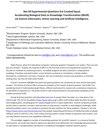 bioRxiv preprint first posted online Jun. 25, 2017; doi: http://dx.doi.org/10.1101/155150. The copyright holder for this preprint (which was not peer-reviewed) is the author/funder. All rights reserved. No reuse allowed without permission. Not All Experimental Questions Are Created Equal: Accelerating Biological Data to Knowledge Transformation (BD2K) via Science Informatics, Active Learning and Artificial Intelligence. Simon Kasif*1,3,5, Stan Letovsky*1, Richard J. Roberts*1,2, Martin Steffen*3,5 1Bioinformatics Program, Boston University, Boston, MA, USA 2 New England Biolabs, Ipswich, MA, USA 3Department of Biomedical Engineering, Boston University, Boston, MA, USA 4 Department of Pathology and Laboratory Medicine, Boston University School of Medicine, Boston, MA, USA 5Joslin Diabetes Center, Harvard Medical School, MA, USA Correspondence should be sent to [email protected] and [email protected]. The authors are listed alphabetically. * Pablo Picasso, when first told about computers, famously quipped “Computers are useless. They can only give you answers.” Indeed, the majority of effort in the first half-‐century of computational research has focused on methods for producing answers. Incredible progress has been achieved in computational modeling, simulation and optimization, across domains as diverse as astrophysics, climate studies, biomedicine, architecture, and chess. However, the use of computers to pose new questions, or prioritize existing ones, has thus far been quite limited. Picasso’s comment highlights the point that good questions can sometimes be more elusive than good answers. The history of science offers numerous examples of the impact of good questions. Paul Erdős, the wandering monk of mathematical graph theory, offered small prizes for anyone who could prove conjectures he identified as important (1). The prizes varied in cash amounts based on the perceived complexity of the problem posed by Erdős. Posing technical questions and allocating resources to answer them has taken on a new guise in the Internet age. The X-‐Prize foundation (http://www.xprize.org/ ) offers multi-‐million dollar bounties for grand technological goals, including goals for sequencing genomes or space exploration. Several companies provide portals where customers can place cash bounties on educational, scientific or technological challenges, while potential problem solvers can compete to produce the best solutions for these problems. Amazon’s Turk site (https://www.mturk.com/mturk/welcome) links people requesting performance of intellectual tasks to people willing to work on them for a fee. Such crowd-‐sourcing systems create markets of questions and answers, and can help allocate resources and capabilities efficiently. This paradigm suggests a number of interesting questions for scientific research. In a resource limited environment, can funds and research capacity be allocated more efficiently? Can knowledge demand provide an alternative or complementary mechanism to traditional investigator-‐initiated research grants? bioRxiv preprint first posted online Jun. 25, 2017; doi: http://dx.doi.org/10.1101/155150. The copyright holder for this preprint (which was not peer-reviewed) is the author/funder. All rights reserved. No reuse allowed without permission. The fathers of Artificial Intelligence (AI) and Herbert Simon in particular envisioned the application of AI to Scientific Discovery in different forms and styles (focusing on physics). We follow on these early dreams and describe a novel approach aimed at remodeling of the biomedical research infrastructure and catalyze gene function determination. We aim to start a bold discussion of new ideas aimed towards increasing the efficiency of the allocation of research capacities, reproducibility, provenance tracking, removing redundancy and catalyzing knowledge gain with each experiment. In particular, we describe a tractable computational framework and infrastructure that can help researchers assess the potential information gain of millions of experiments before conducting them. The utility of experiments in this case is modeled as the predictive knowledge (formalized as information) to be gained as a result of performing the experiment. The experimentalist would then be empowered to select experiments that maximized information gain if they wished, recognizing that there are frequently other considerations, such as a specific technological or medical utility, that might over-‐ride the priority of maximizing information gain. The conceptual approach we develop is general, and here we apply it to the study of gene function. What are the best genes to study? Prioritizing gene function research. The newly established initiative in Biological Data to Knowledge Transfer (BD2K) (http://commonfund.nih.gov/bd2k/index) aims to develop transformative approaches to maximize the integration and utility of Big Data into biomedical research. While a conservative view might suggest that knowledge is just a set of experimentally validated facts, modern sciences are often driven by predictive models that organize facts, which cumulatively enhances our ability to predict behavior of complex physical or biological systems. The field of genomics provides an interesting case study for the allocation of research resources to BD2K. High-‐throughput sequencing has led to the discovery of a plethora of new genes, many of which are poorly understood. Each gene gives rise to a set of questions: what is its function (2, 3)? If it codes for an enzyme, what substrates does it act on? If it codes for a regulator, what does it regulate (4)? What is its role in the life of the organism (5)? Is the function maintained across conditions and across species? How did it evolve? Does the gene have an important clinical relevance such as contributing to antibiotic resistance (6) or cancer (7)? A fairly typical protein cluster contains hundreds of evolutionary 