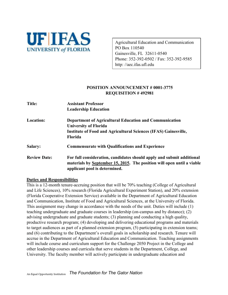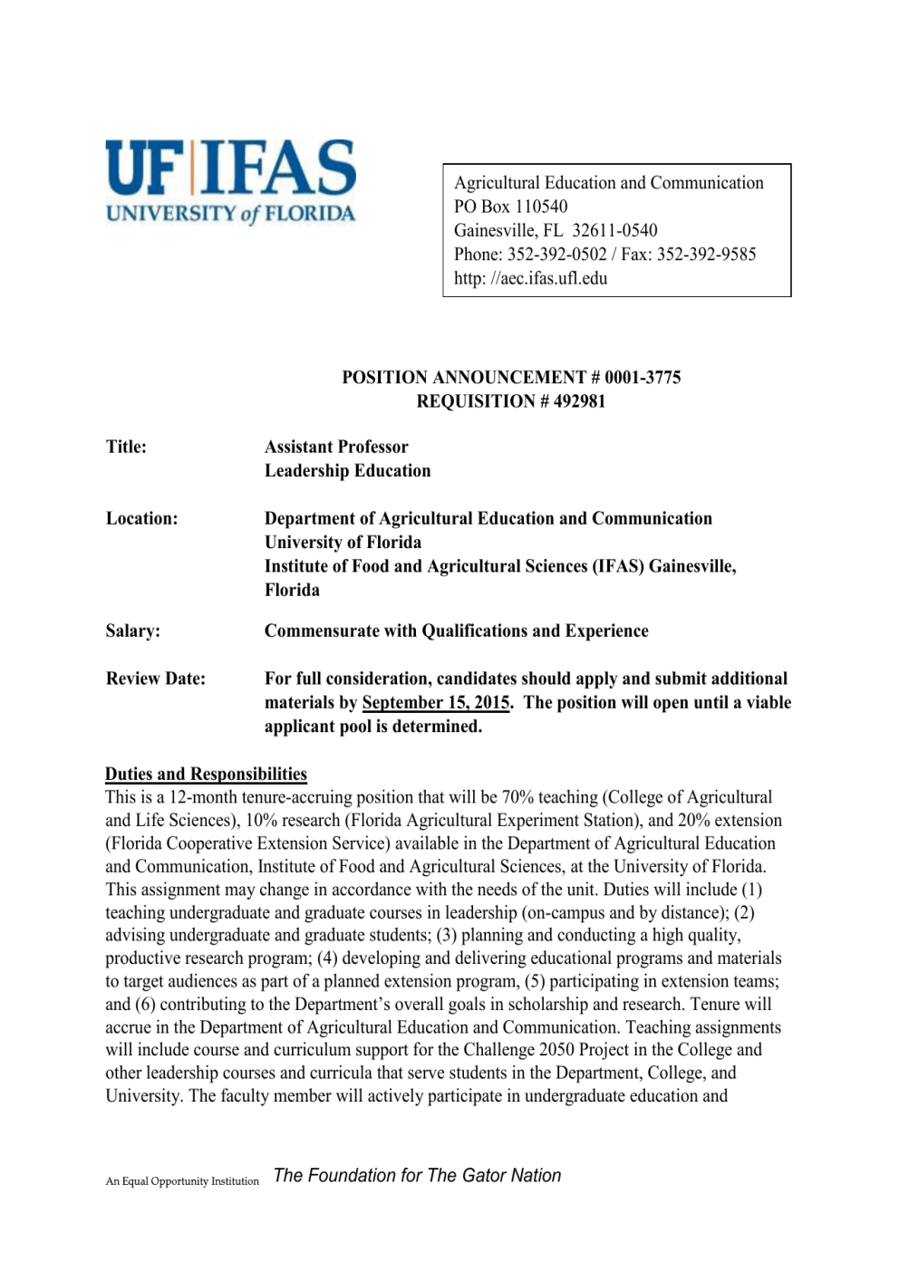 Agricultural Education and Communication PO Box 110540 Gainesville, FL 32611-0540 Phone: 352-392-0502 / Fax: 352-392-9585 http: //aec.ifas.ufl.edu POSITION ANNOUNCEMENT # 0001-3775 REQUISITION # 492981 Title: Assistant Professor Leadership Education Location: Department of Agricultural Education and Communication University of Florida Institute of Food and Agricultural Sciences (IFAS) Gainesville, Florida Salary: Commensurate with Qualifications and Experience Review Date: For full consideration, candidates should apply and submit additional materials by September 15, 2015. The position will open until a viable applicant pool is determined. Duties and Responsibilities This is a 12-month tenure-accruing position that will be 70% teaching (College of Agricultural and Life Sciences), 10% research (Florida Agricultural Experiment Station), and 20% extension (Florida Cooperative Extension Service) available in the Department of Agricultural Education and Communication, Institute of Food and Agricultural Sciences, at the University of Florida. This assignment may change in accordance with the needs of the unit. Duties will include (1) teaching undergraduate and graduate courses in leadership (on-campus and by distance); (2) advising undergraduate and graduate students; (3) planning and conducting a high quality, productive research program; (4) developing and delivering educational programs and materials to target audiences as part of a planned extension program, (5) participating in extension teams; and (6) contributing to the Department’s overall goals in scholarship and research. Tenure will accrue in the Department of Agricultural Education and Communication. Teaching assignments will include course and curriculum support for the Challenge 2050 Project in the College and other leadership courses and curricula that serve students in the Department, College, and University. The faculty member will actively participate in undergraduate education and The Foundation for The Gator Nation graduate education by chairing and serving on graduate committees, supervising thesis and dissertation research, supervising undergraduate research, and publishing research results with his/her graduate students. The faculty member will actively seek contract and grant funding to support his/her program and engage in Extension activities in his or her program area. The successful candidate will engage in scholarly activities related to instruction, including teaching undergraduate and/or graduate courses, advising and mentoring undergraduate and graduate students, participating in curriculum revision and enhancement, seeking funding for the teaching program, supervising undergraduate and graduate research and creative work, publishing teaching-related scholarship, producing learning tools, and engaging in professional development activities related to teaching and advising. Faculty members are encouraged to support and participate in the CALS Honors Program, distance education, and international education. Because of the IFAS land-grant mission, all faculty members are expected to be supportive of and engaged in all three mission areas—Research, Teaching and Extension—regardless of the assignment split specified in the position description. Qualifications A doctorate (foreign equivalent acceptable) in agricultural leadership or a closely related discipline is required. Candidates should have demonstrated skills in verbal and written communication, interpersonal relationships, and procurement of extramural funding. Candidates must be supportive of the mission of the land-grant system and demonstrate commitment to IFAS core values of excellence, diversity, global involvement, and accountability. The successful applicant must have a strong commitment to teaching, research, and extension and a proven ability to work effectively with professional colleagues, students, and stakeholders. Candidates must show clear promise in research and teaching at the undergraduate and graduate levels and demonstrate excellent skills in verbal and written communication, collaboration and teamwork, interpersonal communication, and procurement of extramural funding. Background Information: The Department of Agricultural Education and Communication is a comprehensive academic unit in the Institute of Food and Agricultural Sciences (IFAS) at the University of Florida and has diverse teaching, research, and extension education programs with 23 faculty members and 10 support personnel located on the Gainesville campus. An additional faculty member directs the department’s off-campus undergraduate program in agricultural education at the UF/IFAS Plant City campus. The departmental web site at http://aec.ifas.ufl.edu provides additional information. The University of Florida (http://www.ufl.edu) is a Land-Grant, Sea-Grant, and Space-Grant institution, encompassing virtually all academic and professional disciplines, with an enrollment of more than 50,000 students. UF is a member of The Association of American Universities. The Institute of Food and Agricultural Sciences (http://ifas.ufl.edu) includes the College of Agricultural and Life Sciences (http://cals.ufl.edu), the Florida Agricultural Experiment Station The Foundation for The Gator Nation (http://research.ifas.ufl.edu), the Florida Cooperative Extension Service (http://extension.ifas.ufl.edu), the College of Veterinary Medicine (http://www.vetmed.ufl.edu), the Florida Sea Grant program (http://www.flseagrant.org/ ), and encompasses 16 on-campus academic departments and schools, 12 Research and Educational Centers (REC) located throughout the state, 6 Research sites/demonstration units administered by RECs or academic departments, and Florida Cooperative Extension Service offices in all 67 counties (counties operate and maintain). The School of Natural Resources and Environment is an interdisciplinary unit housed in IFAS and managed by several colleges on campus. IFAS employs 