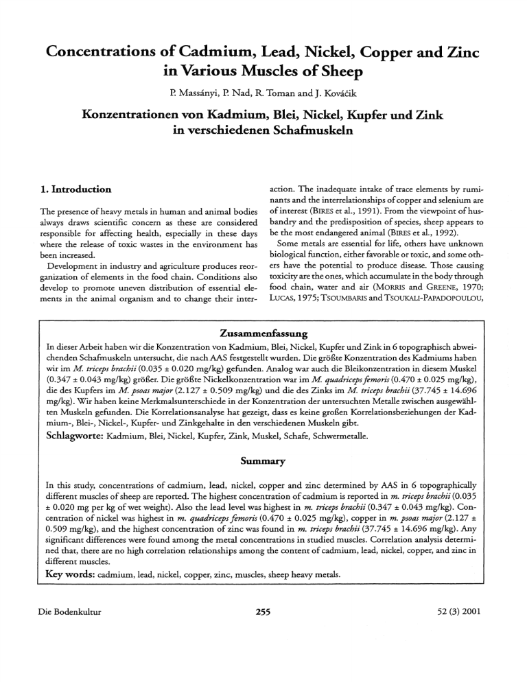 Concentrations of Cadmium, Lead, Nickel, Copper and Zinc in Various Museies of Sheep E Massänyi, E Nad, R. Toman and J. Koväcik Konzentrationen von Kadmium, Blei, Nickel, Kupfer und Zink in verschiedenen Schafinuskeln 1. Introduction The presence ofheavy metals in human and animal bodies always draws scientific concern as these are considered responsible for affecting health, especially in these days where the release of toxic wastes in the environment has been increased. Development in industry and agriculture produces reorganization of elements in the food chain. Conditions also develop to promote uneven distribution of essential elements in the animal organism and to change their inter- action, The inadequate intake of trace elements by ruminants and the interrelationships ofcopper and selenium are of interest (BIRES et al., 1991). From the viewpoint ofhusbandry and the predisposition of species, sheep appears to be the most endangered animal (BIRES et al., 1992). Same metals are essential for life, others have unknown biological function, either favorable or toxic, and some others have the potential to produce disease. Those causing toxicity are the ones, which accumulate in the body through food chain, water and air (MORRIS and GREENE, 1970; LUCAS, 1975; TSOUMBARIS and TSOUKALI-PAPADOPOULOU, Zusammenfassung In dieser Arbeit haben wir die Konzentration von Kadmium, Blei, Nickel, Kupfer und Zink in 6 topographisch abweichenden Schafmuskeln untersucht, die nach AAS festgestellt wurden. Die größte Konzentration des Kadmiums haben wir im M triceps bracbii (0.035 ± 0.020 mg/kg) gefunden. Analog war auch die Bleikonzentration in diesem Muskel (0.347 ± 0.043 mg/kg) größer. Die größte Nickelkonzentration war im M quadriceps femoris (0.470 ± 0.025 mg/kg), die des Kupfers im M psoas major (2.127 ± 0.509 mg/kg) und die des Zinks im M triceps brachii (37.745 ± 14.696 mg/kg). Wir haben keine Merkmalsunterschiede in der Konzentration der untersuchten Metalle zwischen ausgewählten Muskeln gefunden. Die Korrelationsanalyse hat gezeigt, dass es keine großen Korrelationsbeziehungen der Kadmium-, Blei-, Nickel-, Kupfer- und Zinkgehalte in den verschiedenen Muskeln gibt. Schlagworte: Kadmium, Blei, Nickel, Kupfer, Zink, Muskel, Schafe, Schwermetalle. Summary In this study, concentrations of cadmium, lead, nickel, copper and zinc determined by AAS in 6 topographically different muscles ofsheep are reported. The highest concentration ofcadmium is reported inm. triceps brachii (0.035 ± 0.020 mg per kg of wet weight). Also the lead level was highest in m. triceps brachii (0.347± 0.043 mg/kg). Concentration of nickel was highest in m. quadriceps femoris (0.470 ± 0.025 mg/kg), copper inm. psoas major (2.127 ± 0.509 mg/kg), and the highest concentration of zinc was found in m. triceps bracbii (37.745 ± 14.696 mg/kg). Any significant differences were found among the meta! concentrations in studied muscles. Correlation analysis determined rhar, there are no high correlation relationships among the content of cadmium, lead, nickel, copper, and zinc in different muscles. Key words: cadmium, lead, nickel, eopper, zine, muscles, sheep heavy metals. Die Bodenkultur 255 52 (3) 2001 ~ Massänyi, l? Nad, R. Toman andJ. Koväcik 1994). Cadmium and lead are not ubiquitous in the environrnent, but have been extensively used in industries. They are persistent in the environment once discharged, and they stay in the human bodywith long half-lives when absorbed. These behavioral characteristics make them good long-term markers of environmental pollution. Further, they are insidious inroxicanrs to humans (IKEDA et al., 1996). The amount of an element accumulated in the organs of sheep depends on the interval of exposure, the quantity ingested, the production and reproduction phase of the animals as well as their age and breed (VAN DER SCHEE et al., 1983). Element toxicityupon the biological systems ofanimals is effected by the route and form of ingestion as weIl as by the interacrion berween essential and toxic elements (CHOWDHURY and CHANDRA, 1987). The purpose of this study was to determine cadmium, lead, nickel, copper, and zinc concentrations in topographically differentmuseies and find whether there are differences in accumulation. 2. Materials and Methods Ten improved Wallachian ewes 2 years of age were used for the analysis ofcadmium, lead, nickel, copper and zinc in six topographically various museies. Sheep were kept indoor and the nourishment was designed as normal without higher concentration of contaminants. During necropsy following 1 cm 3 of muscles in the same middle region (venter) were obtained for analytical purposes: musculuspsoas major (PM), m. longissimus dorsi (LD) , m. semitendinosus (ST), m. semimembranosus (SM), m. triceps the body, m. semitendinosus is a lang, fleshy, fusiform muscle, lying on the caudolateral aspect of the rump, m. semimembranosusis a long, thick, fleshy muscle which lies on the caudal aspect of the rump, m. triceps brachiiis a large muscle which fills the angle between the caudal border of the scapula and humerus and is the major extensor of the elbow and m. quadricepsfimoris occupies the area along the cranial, lateral and medial aspects of the thigh and is a streng extensor of the stifle joint. Generally two types of muscles were analyzed - museies with lower motor activity (PM, LD) and muscles with high activity (ST, SM, TB, QF). The samples taken were processed by means of a mineralization system MLS-1 200 MEGA of fy MILESTONE, using microwave decomposition technology and low-boiling acids (HN0 3, Hel). Digestion prograrn: l-st step 250~ 2 minutes; 2-nd step - O~ 2 minutes; 3-rd step 250~ 5 minutes; 4-th step - 400~ 5 minutes; 5-th step - 500~ 5 minutes and 6-th step - 600~ 2 minutes. Muscles were analyzed by atomic absorption spectrophotometry as folIows: eopper and zinc were analyzed by graphite furnanee using a Perkin-Elmer 306 instrument, whereas cadmium,