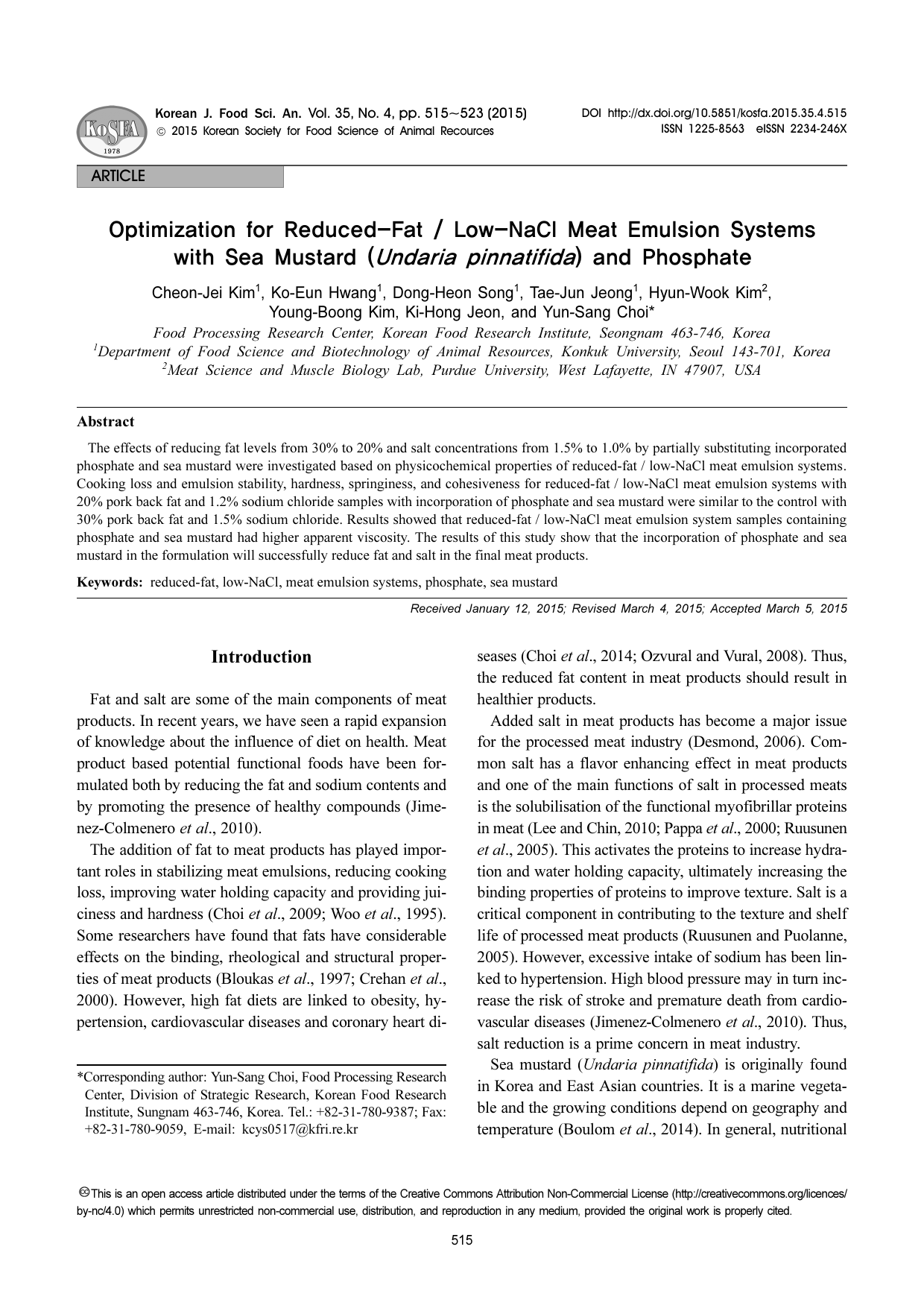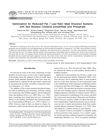 Korean J. Food Sci. An. Vol. 35, No. 4, pp. 515~523 (2015) © 2015 Korean Society for Food Science of Animal Recources DOI http://dx.doi.org/10.5851/kosfa.2015.35.4.515 ISSN 1225-8563 eISSN 2234-246X ARTICLE Optimization for Reduced-Fat / Low-NaCl Meat Emulsion Systems with Sea Mustard (Undaria pinnatifida) and Phosphate Cheon-Jei Kim1, Ko-Eun Hwang1, Dong-Heon Song1, Tae-Jun Jeong1, Hyun-Wook Kim2, Young-Boong Kim, Ki-Hong Jeon, and Yun-Sang Choi* 1 Food Processing Research Center, Korean Food Research Institute, Seongnam 463-746, Korea Department of Food Science and Biotechnology of Animal Resources, Konkuk University, Seoul 143-701, Korea 2 Meat Science and Muscle Biology Lab, Purdue University, West Lafayette, IN 47907, USA Abstract The effects of reducing fat levels from 30% to 20% and salt concentrations from 1.5% to 1.0% by partially substituting incorporated phosphate and sea mustard were investigated based on physicochemical properties of reduced-fat / low-NaCl meat emulsion systems. Cooking loss and emulsion stability, hardness, springiness, and cohesiveness for reduced-fat / low-NaCl meat emulsion systems with 20% pork back fat and 1.2% sodium chloride samples with incorporation of phosphate and sea mustard were similar to the control with 30% pork back fat and 1.5% sodium chloride. Results showed that reduced-fat / low-NaCl meat emulsion system samples containing phosphate and sea mustard had higher apparent viscosity. The results of this study show that the incorporation of phosphate and sea mustard in the formulation will successfully reduce fat and salt in the final meat products. Keywords: reduced-fat, low-NaCl, meat emulsion systems, phosphate, sea mustard Received January 12, 2015; Revised March 4, 2015; Accepted March 5, 2015 seases (Choi et al., 2014; Ozvural and Vural, 2008). Thus, the reduced fat content in meat products should result in healthier products. Added salt in meat products has become a major issue for the processed meat industry (Desmond, 2006). Common salt has a flavor enhancing effect in meat products and one of the main functions of salt in processed meats is the solubilisation of the functional myofibrillar proteins in meat (Lee and Chin, 2010; Pappa et al., 2000; Ruusunen et al., 2005). This activates the proteins to increase hydration and water holding capacity, ultimately increasing the binding properties of proteins to improve texture. Salt is a critical component in contributing to the texture and shelf life of processed meat products (Ruusunen and Puolanne, 2005). However, excessive intake of sodium has been linked to hypertension. High blood pressure may in turn increase the risk of stroke and premature death from cardiovascular diseases (Jimenez-Colmenero et al., 2010). Thus, salt reduction is a prime concern in meat industry. Sea mustard (Undaria pinnatifida) is originally found in Korea and East Asian countries. It is a marine vegetable and the growing conditions depend on geography and temperature (Boulom et al., 2014). In general, nutritional Introduction Fat and salt are some of the main components of meat products. In recent years, we have seen a rapid expansion of knowledge about the influence of diet on health. Meat product based potential functional foods have been formulated both by reducing the fat and sodium contents and by promoting the presence of healthy compounds (Jimenez-Colmenero et al., 2010). The addition of fat to meat products has played important roles in stabilizing meat emulsions, reducing cooking loss, improving water holding capacity and providing juiciness and hardness (Choi et al., 2009; Woo et al., 1995). Some researchers have found that fats have considerable effects on the binding, rheological and structural properties of meat products (Bloukas et al., 1997; Crehan et al., 2000). However, high fat diets are linked to obesity, hypertension, cardiovascular diseases and coronary heart di- *Corresponding author: Yun-Sang Choi, Food Processing Research Center, Division of Strategic Research, Korean Food Research Institute, Sungnam 463-746, Korea. Tel.: +82-31-780-9387; Fax: +82-31-780-9059, E-mail: [email protected] This is an open access article distributed under the terms of the Creative Commons Attribution Non-Commercial License (http://creativecommons.org/licences/ by-nc/4.0) which permits unrestricted non-commercial use, distribution, and reproduction in any medium, provided the original work is properly cited. 515 516 Korean J. Food Sci. An., Vol. 35, No. 4 (2015) composition of sea mustard is varying depending with location and seasonal changes. Furthermore, Undaria pinnatifida is an excellent source of dietary fiber, vitamins, minerals, and phytosterols (MacArtain et al., 2007). In particular, Undaria pinnatifida is a major source of dietary fiber such as alginic acid, fucoidan, and laminaran, all of which are beneficial to human health (Fung et al., 2013; Urbano and Gorii, 2002). Dietary fiber has been added to different meat products to counteract the problems caused by fat and salt reduction (Kim et al., 2014; Turhan et al., 2005). Some studies have been carried out on low-fat or low-salt meat products with fat or salt partially replaced by dietary fiber, which helps to improve rheological properties and emulsion stability (Tobin et al., 2012). However, application in meat products with dietary fiber both low-fat and low-salt have so far been limited research. Sodium tripolyphosphate (STPP) is commonly used in the production of value added meat products (Detienne and Wicker, 1999) and it imparts improved sensory characteristics to the meat products. Also, STPP has demonstrated improved yield, tenderness, water holding capacity and extractable protein (Cannon et al., 1993; Murphy and Zerby, 2004). A well known, but not well understood, interaction has been reported among NaCl, STPP and sea mustard. A clear understanding of this interaction could lead to more effective methods for commercial meat emulsion s