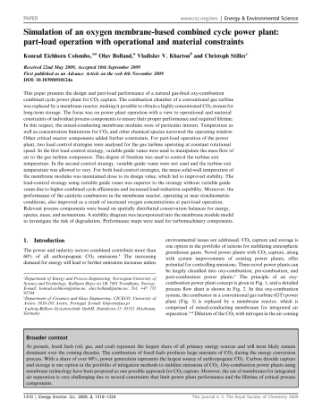 PAPER www.rsc.org/ees | Energy & Environmental Science Simulation of an oxygen membrane-based combined cycle power plant: part-load operation with operational and material constraints Konrad Eichhorn Colombo,*a Olav Bolland,a Vladislav V. Khartonb and Christoph Stillerc Received 22nd May 2009, Accepted 10th September 2009 First published as an Advance Article on the web 4th November 2009 DOI: 10.1039/b910124a This paper presents the design and part-load performance of a natural gas-fired oxy-combustion combined cycle power plant for CO2 capture. The combustion chamber of a conventional gas turbine was replaced by a membrane reactor, making it possible to obtain a highly concentrated CO2 stream for long-term storage. The focus was on power plant operation with a view to operational and material constraints of individual process components to ensure their proper performance and required lifetime. In this respect, the mixed-conducting membrane modules were of particular interest. Temperature as well as concentration limitations for CO2 and other chemical species narrowed the operating window. Other critical reactor components added further constraints. For part-load operation of the power plant, two load control strategies were analysed for the gas turbine operating at constant rotational speed. In the first load control strategy, variable guide vanes were used to manipulate the mass flow of air to the gas turbine compressor. This degree of freedom was used to control the turbine exit temperature. In the second control strategy, variable guide vanes were not used and the turbine exit temperature was allowed to vary. For both load control strategies, the mean solid-wall temperature of the membrane modules was maintained close to its design value, which led to improved stability. The load-control strategy using variable guide vanes was superior to the strategy without variable guide vanes due to higher combined cycle efficiencies and increased load-reduction capability. Moreover, the performance of the catalytic combustors in the membrane reactor, operating at near stoichiometric conditions, also improved as a result of increased oxygen concentrations at part-load operation. Relevant process components were based on spatially distributed conservation balances for energy, species, mass, and momentum. A stability diagram was incorporated into the membrane module model to investigate the risk of degradation. Performance maps were used for turbomachinery components. 1. Introduction The power and industry sectors combined contribute more than 60% of all anthropogenic CO2 emissions.1 The increasing demand for energy will lead to further emissions increases unless a Department of Energy and Process Engineering, Norwegian University of Science and Technology, Kolbjørn Hejes vei 1B, 7491 Trondheim, Norway. E-mail: [email protected]; [email protected]; Tel: +47 735 92744 b Department of Ceramics and Glass Engineering, CICECO, University of Aveiro, 3810-193 Aveiro, Portugal. E-mail: [email protected] c Ludwig-B€ olkow-Systemtechnik GmbH, Daimlerstr.15, 85521 Ottobrunn, Germany environmental issues are addressed. CO2 capture and storage is one option in the portfolio of actions for stabilizing atmospheric greenhouse gases. Novel power plants with CO2 capture, along with system improvements of existing power plants, offer potential for controlling emissions. These novel power plants can be largely classified into oxy-combustion, pre-combustion, and post-combustion power plants.1 The principle of an oxycombustion power plant concept is given in Fig. 1, and a detailed process flow sheet is shown in Fig. 2. In this oxy-combustion system, the combustor in a conventional gas turbine (GT) power plant (Fig. 3) is replaced by a membrane reactor, which is comprised of mixed-conducting membranes for integrated air separation.1–6 Dilution of the CO2 with nitrogen in the air coming Broader context At present, fossil fuels (oil, gas, and coal) represent the largest share of all primary energy sources and will most likely remain dominant over the coming decades. The combustion of fossil fuels produces large amounts of CO2 during the energy conversion process. With a share of over 60%, power generation represents the largest source of anthropogenic CO2. Carbon dioxide capture and storage is one option in the portfolio of mitigation methods to stabilize emissions of CO2. Oxy-combustion power plants using membrane technology have been proposed as one possible approach for CO2 capture. However, the use of membranes for integrated air separation is very challenging due to several constraints that limit power plant performance and the lifetime of critical process components. 1310 | Energy Environ. Sci., 2009, 2, 1310–1324 This journal is ª The Royal Society of Chemistry 2009 Fig. 1 Membrane-based combined cycle power plant. The temperature distribution is indicated throughout the process. from the GT compressor is avoided and only oxygen-depleted air is emitted to the atmosphere after it passes the heat recovery steam generator. However, the use of afterburners (Fig. 2) leads to some CO2 emissions, although efficiency and power output are both increased. Heat is generated by the combustion of natural gas, here assumed to be pure methane, with the oxygen that is transported through the membranes. The combustion products (mainly water vapour and CO2) are recycled to moderate the combustion temperature and to increase the driving force for oxygen transport. The recycle loop is indicated in Fig. 1 and Fig. 2. A fraction of this stream is bled off from the recycle loop and used to produce steam in a steam cycle for additional power generation. After heat recovery, the CO2 is conditioned, compressed, and transported to a storage site. Fig. 2 Membrane-based combined cycle power plant with CO2 conditioning. This journal is ª The Royal Society of Chemistry 2009 Energy Environ. Sci., 2009, 2, 1310–1324 | 1311 Fig. 3 Convent