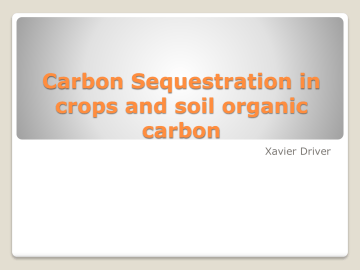 Carbon Sequestration in crops and soil organic carbon Xavier Driver Drylands in the northern Great Plains have lost 30 to 50% of their original soil organic carbon levels during the last 50 to 100 years due to continuous cultivation and summer fallowing (Upendra M. Sainju et al., 2005). North America alone gives off 6,613Tg of CO2 each year, which is second in regions of the world to China, while the total world gives off 23,900Tg per year (Lemus, R. R., & Lal, R. R. (2005). “Bioenergy crops have the potential to sequester approximately 318 Tg C yr in the United States and1631 Tg C yr worldwide.“ (Lemus, R. et al 2005) Switchgrass Panicam virgatum Tall Fescue Elephantgrass Continuous Tilling No Tilling Fallowing Nitrogen Fixation CRP Land Crop rotation Cultural Practice Soil Tiller Fallowing Two cultural practices Regular-conventional seed rates and plant spacing, conventional planting date, broadcast N fertilization, and reduced stubble height Ecological-variable seed rates and plant spacing, delayed planting, banded N fertilization, and increased stubble height. Cultural practice CRP program Participants enroll in CRP contracts for 10 to 15 years. CRP protects millions of acres of American topsoil from erosion and is designed to safeguard the Nation's natural resources. By reducing water runoff and sedimentation, CRP protects groundwater and helps improve the condition of lakes, rivers, ponds, and streams. Acreage enrolled in the CRP is planted to resource-conserving vegetative covers, making the program a major contributor to increased wildlife populations in many parts of the country. CRP land Green needlegrass Western wheatgrass Slender wheatgrass Continuous spring wheat (CW), spring wheat-fallow (W-F), spring wheat-lentil (Lens culinaris Medic.) (W-L), spring wheat-spring wheat-fallow (W-W-F), and spring wheat-pea (Pisum sativum L.)fallow (W-P-F) in Havre, MT. Crop Rotations Spring Wheat Garden Pea Barley Lentil Corn Continuous Tilling to No Tilling, on land that was recently used as Conservation Reserve Program land, can sequester an average of 570±140 kg C ha−1 yr−1 (Upendra M. Sainju et al., 2005). “Although no-tillage and ecological cultural practice increased surface residue amount and C and N contents compared with conventional tillage and regular cultural practice, they did not influence soil C and N” (Upendra M. Sainju et al 2007) Switchgrass Panicam virgatum Switch grass grown on Conservation Reserve Program land with less than 112 kg ammonium nitrate showed increased carbon sequestration at the 0-5 cm level and also at 30-90 cm levels(Lee, D. K., et al., 2007). Soil C was sequestered at a rate of 2.4 ± 0.9 and 4.0 ± 1.0 Mg C ha-1 yr-1 at the 0- to 90-cm depth with NH4NO3-N and manure-N, respectively(Lee, D. K., et al., 2007). Despite the differences in soil and climate among sites, the NT had a higher concentration and total mass of C and N in the surface 5 cm relative to the tilled system (Fabrizzi, K. P. et al 2009). Microbial biomass was greater under NT than T in the Oxisol and Mollisol, but was similar among treatments in the Vertisol (Fabrizzi, K. P. et al 2009). Mollisol Oxisol Vertisol References Lemus, R. R., & Lal, R. R. (2005). Bioenergy Crops and Carbon Sequestration. Critical Reviews In Plant Sciences, 24(1), 1-21. doi:10.1080/07352680590910393 Sainju, U. M., Lenssen, A., & Caesar-Thonthat, T. (2006). Carbon Sequestration in Dryland Soils and Plant Residue as Influenced by Tillage and Crop Rotation. Journal Of Environmental Quality, 35(4), 1341-1347 Song, Y., Ding, X. X., Zheng, D. D., & Li, Q. Q. (2007). Depiction of the Variations of Great Plains Precipitation and Its Relationship with Tropical Central-Eastern Pacific SST. Journal Of Applied Meteorology & Climatology, 46(2), 136-153. doi:10.1175/JAM2455.1 Fuhlendorf, S., Zhang, H., Tunnell, T., Engle, D., & Cross, A. (2002). Effects of Grazing on Restoration of Southern Mixed Prairie Soils. Restoration Ecology, 10(2), 401-407. doi:10.1046/j.1526-100X.2002.00013.x Lee, D. K., Owens, V. N., & Doolittle, J. J. (2007). Switchgrass and Soil Carbon Sequestration Response to Ammonium Nitrate, Manure, and Harvest Frequency on Conservation Reserve Program Land. Agronomy Journal, 99(2), 462-468 Fabrizzi, K. P., Rice, C. W., Amado, T. C., Fiorin, J., Barbagelata, P., & Melchiori, R. (2009). Protection of soil organic C and N in temperate and tropical soils: effect of native and agroecosystems. Biogeochemistry, 92(1/2), 129-143. doi:10.1007/s www.fsa.usda.gov Sainju, U. M., Lenssen, A. W., Caesar-TonThat, T., Jabro, J. D., Lartey, R. T., Evans, R. G., & Allen, B. L. (2011). Dryland residue and soil organic matter as influenced by tillage, crop rotation, and cultural practice. Plant & Soil, 338(1/2), 27-41. doi:10.1007/s11104-0100403-5