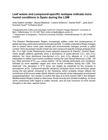 Leaf waxes and compound-specific isotopes indicate more humid conditions in Spain during the LGM Imke Kathrin Schäfer*, Marcel Bliedtner*, Lorenz Wüthrich*, Daniel Wolf**, Jana Zech*, Dominik Faust** & Roland Zech* *Geographisches Institut and Oeschger Centre for Climate Change Research, University of Bern, Hallertsrasse 12, CH-3007 Bern ([email protected]) ** Department of Geography, Technical University Dresden, Helmholtzstrasse 10, DE-01069 Dresden The Western Mediterranean Region increasingly suffers under the consequences of global warming, particularly extreme drought periods. To better understand these changes and to predict future ones, past climate and environmental changes provide a useful context. Here we present results of leaf wax and compound-specific isotope analyses from the ~8 m high ((Late Pleistocene)) loess paleosol sequence El Paraíso, Central Spain. Chain length patterns generally show a dominance of grass-derived n-C31 and n-C33 alkanes, but more deciduous tree-derived n-C27 and n-C29 alkanes at ~2 m depth, interpreted to reflect more humid conditions during the Last Glacial Maximum (LGM: ~25 ka). Most enriched δ13Cn-alkane values before ~30 ka indicate particularly arid conditions, followed by more depleted values and more humid conditions during the LGM. The observed ~2‰ decrease in δ13C since can largely be explained by the increase in atmospheric pCO2. Compound-specific deuterium analyses show more enriched values during the last glacial compared to the Holocene, which probably simply reflects the enrichment of the source water (North Atlantic) and should not be interpreted as enhanced evapotranspiration. Our results (i) confirm the idea of a more humid LGM in the Western Mediterranean Region based on lake leves, fluvial records and climate modelling, (ii) show some controversy with regard to pollen records, and (iii) fuel concerns of more severe droughts in the near, warmer future.