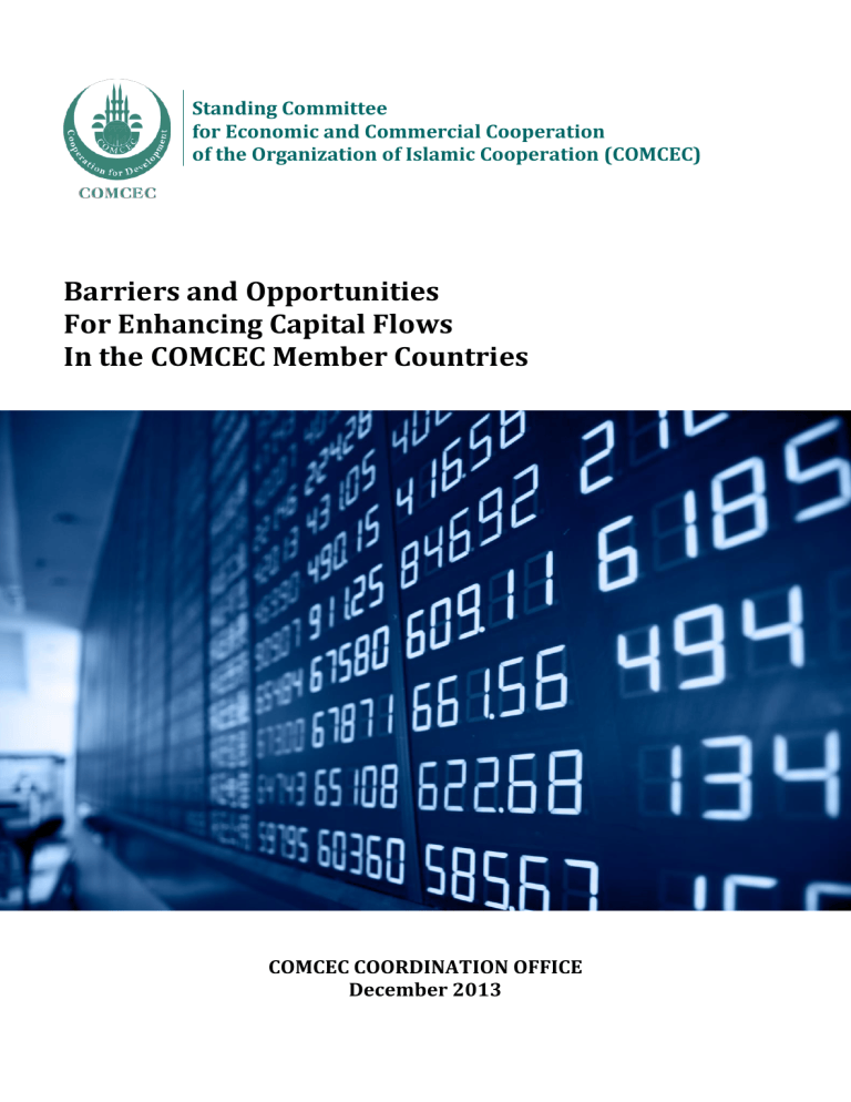 Standing Committee for Economic and Commercial Cooperation of the Organization of Islamic Cooperation (COMCEC) Barriers and Opportunities For Enhancing Capital Flows In the COMCEC Member Countries COMCEC COORDINATION OFFICE December 2013 Standing Committee for Economic and Commercial Cooperation of the Organization of Islamic Cooperation (COMCEC) BARRIERS AND OPPORTUNITIES FOR ENHANCING CAPITAL FLOWS IN THE COMCEC MEMBER COUNTRIES COMCEC COORDINATION OFFICE December 2013 This study was prepared by the Economist Intelligence Unit, commissioned by the COMCEC Coordination Office. The Economist Intelligence Unit’s editorial team designed the study and conducted the research. Research was based on existing, publicly available information and data sources, as well as government websites and the Economist Intelligence Unit’s own data. Interviews were conducted with experts in capital flows, regional specialists, banks and relevant government officials in the autumn of 2013. Vanessa Foo was the primary project manager, and Stefano Scuratti acted as the supporting manager. Thanks for research efforts go to Simon Baptist, John Bowler, John Ferguson, Brian Gardner, Camilo Guerrero, Jital Patel and Christopher Watts. The views and opinions expressed in this publication are those of the Economist Intelligence Unit and do not necessarily reflect the official position of the COMCEC Coordination Office or the COMCEC Member Countries. For further information please contact: COMCEC Coordination Office Necatibey Caddesi No 110/A 06100 Yücetepe Ankara/TURKEY Phone: +90 312 294 57 10 Fax: +90 312 294 57 77 Web: www.comcec.org CONTENTS INTRODUCTION ...................................................................................................................................................... 1 DEFINITIONS ....................................................................................................................................................... 1 GROUPS ................................................................................................................................................................. 2 METHODOLOGY ................................................................................................................................................. 4 1 – CAPITAL FLOW TRENDS IN THE COMCEC MEMBER COUNTRIES ................................................... 5 1.1. CAPITAL INFLOWS TO THE COMCEC MEMBER COUNTRIES – AN OVERVIEW .................. 8 1.2. TRENDS AMONG COUNTRY INCOME GROUPS ............................................................................ 13 1.3. GLOBAL CARITAL OUTFLOWS- A SNAPSHOT ............................................................................. 20 2 – LEGAL AND INSTITUTIONAL FRAMEWORKS IN THE COMCEC MEMBER COUNTRIES .......... 25 2.1. LOW-INCOME COUNTRIES ................................................................................................................. 26 2.2 LOWER-MIDDLE INCOME COUNTRIES .......................................................................................... 30 2.3. UPPER-MIDDLE INCOME COUNTRIES ........................................................................................... 35 2.4. HIGH-INCOME COUNTRIES ................................................................................................................ 40 3 – COMPLINACE WITH INTERNATIONAL FRAMEWORKS GOVERNING CAPITAL ACCOUNT LIBERALISATION AMONG THE COMCEC MEMBER COUNTRIES........................................................... 45 3.1. APPLICABILITY OF FRAMEWORKS AMONG THE COMCEC MEMBER COUNTRIES ......... 48 3.1.1. LOW-INCOME COUNTRIES ......................................................................................................................... 49 3.1.2. LOWER-MIDDLE INCOME COUNTRIES ................................................................................................. 50 3.1.3. UPPER-MIDDLE INCOME COUNTRIES................................................................................................... 52 3.1.4. HIGH-INCOME COUNTRIES ........................................................................................................................ 54 4 – ENHANCING CAPITAL FLOWS AMONG THE COMCEC MEMBER COUNTRIESOPPORTUNITIES AND OBSTACLES ................................................................................................................ 58 4.1. HOW REFORMS CAN AFFECT CAPITAL FLOWS .......................................................................... 58 4.2. THE ROLE OF COUNTRY ENDOWMENT AND INVESTOR MOTIVATION ............................. 59 4.3. THE IMPORTANCE OF SEQUENCING .............................................................................................. 60 4.4. GLOBAL LIQUIDITY AS A DRIVER OF FINANCIAL FLOWS ...................................................... 61 4.5. THE POTENTIAL EFFECT OF ENHANCED CAPITAL FLOWS ON ECONOMIC GROTH WITHIN COUNTIRES ....................................................................................................................................... 64 4.6. OBSTACLES AND OPPORTUNITIES AMONG THE COMCEC MEMBER COUNTRIES ......... 66 4.6.1. LOW- INCOME CONUNTRIES .................................................................................................. 66 4.6.2. LOWER-MIDDLE INCOME COUNTRIES.................................................................................... 69 4.6.3. UPPER-MIDDLE INCOME COUNTRIES ..................................................................................... 71 4.6.4. HIGH-INCOME COUNTRIES ..................................................................................................... 74 5- CONCLUSION .................................................................................................................................................... 77 5.1. ACHIEVING THE RIGHT POLICIES TO ENHANCE CAPITAL FLOWS ...................................... 80 APPENDICES .........