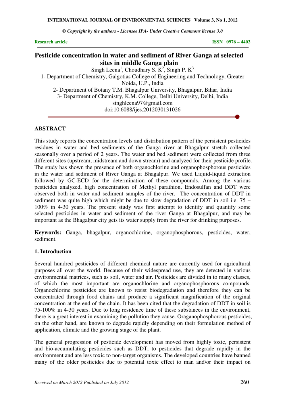 INTERNATIONAL JOURNAL OF ENVIRONMENTAL SCIENCES Volume 3, No 1, 2012 © Copyright by the authors - Licensee IPA- Under Creative Commons license 3.0 Research article ISSN 0976 – 4402 Pesticide concentration in water and sediment of River Ganga at selected sites in middle Ganga plain Singh Leena1, Choudhary S. K2, Singh P. K3 1- Department of Chemistry, Galgotias College of Engineering and Technology, Greater Noida, U.P., India 2- Department of Botany T.M. Bhagalpur University, Bhagalpur, Bihar, India 3- Department of Chemistry, K.M. College, Delhi University, Delhi, India [email protected] doi:10.6088/ijes.2012030131026 ABSTRACT This study reports the concentration levels and distribution pattern of the persistent pesticides residues in water and bed sediments of the Ganga river at Bhagalpur stretch collected seasonally over a period of 2 years. The water and bed sediment were collected from three different sites (upstream, midstream and down stream) and analyzed for their pesticide profile. The study has shown the presence of both organochlorine and organophosphorous pesticides in the water and sediment of River Ganga at Bhagalpur. We used Liquid-liquid extraction followed by GC-ECD for the determination of these compounds. Among the various pesticides analyzed, high concentration of Methyl parathion, Endosulfan and DDT were observed both in water and sediment samples of the river. The concentration of DDT in sediment was quite high which might be due to slow degradation of DDT in soil i.e. 75 – 100% in 4-30 years. The present study was first attempt to identify and quantify some selected pesticides in water and sediment of the river Ganga at Bhagalpur, and may be important as the Bhagalpur city gets its water supply from the river for drinking purposes. Keywords: Ganga, bhagalpur, organochlorine, organophosphorous, pesticides, water, sediment. 1. Introduction Several hundred pesticides of different chemical nature are currently used for agricultural purposes all over the world. Because of their widespread use, they are detected in various environmental matrices, such as soil, water and air. Pesticides are divided in to many classes, of which the most important are organochlorine and organophosphorous compounds. Organochlorine pesticides are known to resist biodegradation and therefore they can be concentrated through food chains and produce a significant magnification of the original concentration at the end of the chain. It has been cited that the degradation of DDT in soil is 75-100% in 4-30 years. Due to long residence time of these substances in the environment, there is a great interest in examining the pollution they cause. Oraganophosphorous pesticides, on the other hand, are known to degrade rapidly depending on their formulation method of application, climate and the growing stage of the plant. The general progression of pesticide development has moved from highly toxic, persistent and bio-accumulating pesticides such as DDT, to pesticides that degrade rapidly in the environment and are less toxic to non-target organisms. The developed countries have banned many of the older pesticides due to potential toxic effect to man and\or their impact on Received on March 2012 Published on July 2012 260 Pesticide concentration in water and sediment of River Ganga at selected sites in middle Ganga plain ecosystems, in favour of more pesticide formulations. In the developing countries, however, organochlorine pesticides still remain the cheapest to produce and, for some purposes, remain highly effective. Developing countries maintain that they cannot afford, for reason of cost or efficacy, to ban certain older pesticides. The dilemma of cost/efficacy, versus ecological impacts, including long range transport, and access to modern pesticides formulations at low cost remains a contentious global issue. Pesticides like DDT and HCH were used extensively in India till recently both for agricultural and sanitary purposes. It is estimated that about 25000 MT of chlorinated pesticides were used annually in India and DDT accounted for 40% of this group (Mathur, 1993). Pesticide residues reach the aquatic environment through direct runoff, leaching, and careless disposal of empty container, equipment washing etc. (Milindis, 1994). Surface water contamination may have ecotoxicological effects for aquatic flora and fauna as well as for human health if used for public consumption (Forney and Davis, 1981; Leonard, 1988; Miyamoto et.al, 1990; Mulla and Mian, 1981). Sediments are ecologically important components of the aquatic habitat, which play a significant role in maintaining the trophic status of any water body (Singh et.al, 1997). Highly polluted sediments are adversely affecting the ecological functioning of rivers due to persistence in the environment and longrange transport (Singh et.al, 2002). In India, the concentration of these pesticides have been detected in almost all segments of environment due to their extensive use in past, which have shown potential to biomagnified/accumulate in animal tissue, human blood, adipose tissue and breast milk (Beg et.al, 1989). Since the pesticides are lipid soluble in nature, cumulative accumulation of low concentration of these in the body fat of mammals might pose potential hazards in long run (Metcaf, 1997). In India, River Ganges originates from the source glacier Gangotri in northern India extending to a length of 2525 Km and basin area over 1 million Km2 and is considered as the sacred river of India. River Ganges alone sustains 114 cities in basin populated by over 400 million people. River Ganges, once valued for her absolute purity, has become a site for environment catastrophe in last hundred years. Poor sanitation untreated urban sewage, improper waste management by industries and disposal of solid corpses along its banks have led to severe environmental stress. Nearly, all sewage from these populations goes directly in to the river, totaling