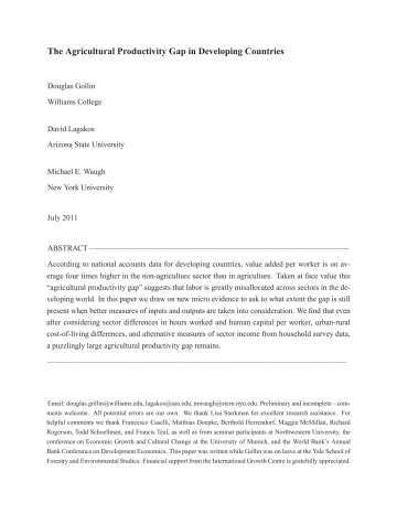 The Agricultural Productivity Gap in Developing Countries Douglas Gollin Williams College David Lagakos Arizona State University Michael E. Waugh New York University July 2011 ABSTRACT —————————————————————————————————According to national accounts data for developing countries, value added per worker is on average four times higher in the non-agriculture sector than in agriculture. Taken at face value this “agricultural productivity gap” suggests that labor is greatly misallocated across sectors in the developing world. In this paper we draw on new micro evidence to ask to what extent the gap is still present when better measures of inputs and outputs are taken into consideration. We find that even after considering sector differences in hours worked and human capital per worker, urban-rural cost-of-living differences, and alternative measures of sector income from household survey data, a puzzlingly large agricultural productivity gap remains. ——————————————————————————————————————– Email: [email protected], [email protected], [email protected]. Preliminary and incomplete – comments welcome. All potential errors are our own. We thank Lisa Starkman for excellent research assistance. For helpful comments we thank Francesco Caselli, Matthias Doepke, Berthold Herrendorf, Maggie McMillan, Richard Rogerson, Todd Schoellman, and Francis Teal, as well as from seminar participants at Northwestern University, the conference on Economic Growth and Cultural Change at the University of Munich, and the World Bank’s Annual Bank Conference on Development Economics. This paper was written while Gollin was on leave at the Yale School of Forestry and Environmental Studies. Financial support from the International Growth Centre is gratefully appreciated. 1. Introduction The agriculture sector accounts for large fractions of employment and value added in developing countries. Almost always, agriculture’s share of employment is higher than its share of value added. As a simple matter of arithmetic, this implies that value added per worker is higher in the non-agriculture sector than in agriculture. According to data from national income and product accounts, this “agricultural productivity gap” (APG) is around a factor of four in developing countries, on average. In many poor countries the gaps are even higher, with a number of countries having gaps above ten. These large agricultural productivity gaps have several important implications for developing countries. First, with minimal assumptions on production technologies, they imply that labor is misallocated across sectors. Second, they imply that developing countries trail the developed world by a much larger margin in agriculture than in non-agriculture. Put together, these two implications suggest that the problem of economic development is closely linked to an apparent “misallocation” of workers across sectors, with too many workers in the less-productive agriculture sector. In this paper we draw on new micro evidence to ask to what extent these gaps are still present when better measures of inputs and outputs are taken into consideration. Our analysis addresses a basic, yet unanswered question: how much of the agricultural productivity gaps are due to problems of omitted factors and mis-measurement, as opposed to real differences in income per worker? To answer this question, we consider a sequence of adjustments to the data on agriculture’s shares of value added and employment. These adjustments attempt to control for differences across sectors in hours worked per worker, human capital per worker, and cost-of-living differences between rural and urban areas. We then ask to what extent value added in the national accounts differs from value added measures constructed using data from household income surveys. Our analysis draws on a new database that we constructed from population censuses and labor force surveys for a large set of developing countries. We use these data to construct measures of hours worked by sector for 46 developing countries and measures of human capital by sector for 97 countries. We complement these data with evidence on urban-rural differences in the cost of living for 78 developing countries, constructed by the World Bank. We find that taking these differences into consideration jointly reduces the size of the average agricultural productivity gap to around two. We then ask whether the gaps are consistent with sector value added measures computed from household income survey data. We construct these measures from the World Bank’s Living Standards Measurement Studies (LSMS), which are designed explicitly to obtain measures of household income and expenditure. These surveys allow us to compute, among other things, the market 1 value of all output produced by agricultural households, whether they are ultimately sold or consumed at home. They also allow to construct measures of average income and expenditure by agriculture and non-agricultural households. Our analysis suggests that the agricultural productivity gaps in most developing countries are unlikely to be completely explained by any of the measurement issues we address. We conclude that a better understanding is needed of why so many workers remain in the agriculture sector, given the large residual productivity gaps that we find in most developing countries. Understanding these gaps will help determine, in particular, whether policy makers in the developing world should pursue polices that encourage movement of the workforce out of agriculture. To be sure, we are not the first to point out the existence of large agricultural productivity gaps in some countries. As Lewis (1955) noted (pp. 349-40):1 There is usually a marked difference between incomes per head in agriculture and in industry. Some of the differen