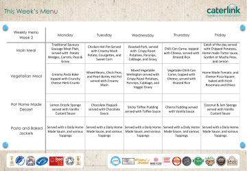 This Week’s Menu Weekly menu Week 2 Main Meal Vegetarian Meal Hot Home Made Dessert Pasta and Baked Jackets Monday Tuesday Wednesday Thursday Traditional Savoury Sausage Meat Plait, served with Potato Wedges, Carrots, Peas & Gravy Chicken Hot Pot Served with Creamy Mash Potato, Courgettes, and Sweet Corn Roasted Pork, served with Crispy Roast Potatoes, Parsnips, Cabbage, and Gravy Creamy Pasta Bake topped with Crunchy Cheese Herb Crumb Mixed Beans, Chick Peas, and Pearl Barley Hot Pot served with Creamy Mash Mixed Vegetable Wellington served with Crispy Roast Potatoes, Parsnips, Cabbage, and Veggie Gravy Vegetable Chilli Con Carne, topped with Cheese, served with Braised Rice Lemon Drizzle Sponge served with Vanilla Custard Sauce Chocolate Flapjack served with Chocolate Sauce Sticky Toffee Pudding served with Toffee Sauce Cherry Pudding served with Vanilla Sauce Friday Catch of the day served Chilli Con Carne, topped with Chipped Potatoes, with Cheese, served with Home made Tartar sauce, Braised Rice Garden or Mushy Peas, and Lemon Home Made Tomato, and Cheese Pizza Square, baked with fresh Rosemary and Olives Coconut & Jam Sponge served with Vanilla Custard Sauce Served with a Daily Home Served with a Daily Home Served with a Daily Home Served with a Daily Home Served with a Daily Home Made Sauce, and various Made Sauce, and various Made Sauce, and various Made Sauce, and various Made Sauce, and various Toppings Toppings Toppings Toppings Toppings