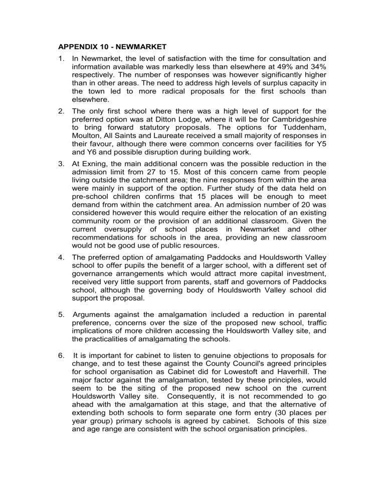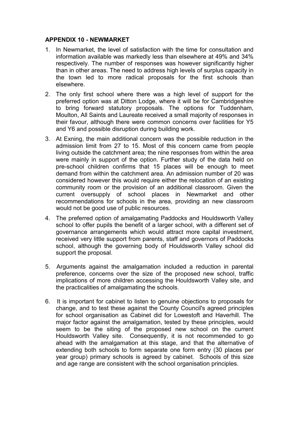 APPENDIX 10 - NEWMARKET 1. In Newmarket, the level of satisfaction with the time for consultation and information available was markedly less than elsewhere at 49% and 34% respectively. The number of responses was however significantly higher than in other areas. The need to address high levels of surplus capacity in the town led to more radical proposals for the first schools than elsewhere. 2. The only first school where there was a high level of support for the preferred option was at Ditton Lodge, where it will be for Cambridgeshire to bring forward statutory proposals. The options for Tuddenham, Moulton, All Saints and Laureate received a small majority of responses in their favour, although there were common concerns over facilities for Y5 and Y6 and possible disruption during building work. 3. At Exning, the main additional concern was the possible reduction in the admission limit from 27 to 15. Most of this concern came from people living outside the catchment area; the nine responses from within the area were mainly in support of the option. Further study of the data held on pre-school children confirms that 15 places will be enough to meet demand from within the catchment area. An admission number of 20 was considered however this would require either the relocation of an existing community room or the provision of an additional classroom. Given the current oversupply of school places in Newmarket and other recommendations for schools in the area, providing an new classroom would not be good use of public resources. 4. The preferred option of amalgamating Paddocks and Houldsworth Valley school to offer pupils the benefit of a larger school, with a different set of governance arrangements which would attract more capital investment, received very little support from parents, staff and governors of Paddocks school, although the governing body of Houldsworth Valley school did support the proposal. 5. Arguments against the amalgamation included a reduction in parental preference, concerns over the size of the proposed new school, traffic implications of more children accessing the Houldsworth Valley site, and the practicalities of amalgamating the schools. 6. It is important for cabinet to listen to genuine objections to proposals for change, and to test these against the County Council's agreed principles for school organisation as Cabinet did for Lowestoft and Haverhill. The major factor against the amalgamation, tested by these principles, would seem to be the siting of the proposed new school on the current Houldsworth Valley site. Consequently, it is not recommended to go ahead with the amalgamation at this stage, and that the alternative of extending both schools to form separate one form entry (30 places per year group) primary schools is agreed by cabinet. Schools of this size and age range are consistent with the school organisation principles. 7. However, the demographic and other issues which led to the suggestion that these two schools should amalgamate remain. These will need to be addressed outside of the School Organisation Review process, and the governing bodies will be encouraged to work closely together to ensure the quality of educational provision in both schools is developed, and that they are sustainable in the long term, given current and projected need for primary school places in Newmarket. 8. The Catholic first school, St. Louis, occupies a constrained site. Together with the need to address the over supply of school places in Newmarket, this led to the suggestion that with two more year groups on site, the admission number should be limited to 30 places per year. During consultation it has been argued that with only 30 places available each year the school would not be able to meet demand from Catholic families. It has also been argued that many of the pupils attending the school do not come from Newmarket and if they did not attend St. Louis, they would not take up surplus places at other schools in the town. The school have commissioned a feasibility study to show how 315 places (45 in each year group), can be provided on its site and how off-site playing fields can be provided. 9. Given the arguments presented during consultation it is recommended that the governors’ preferred size of school is supported. 10. The County Council’s preferred option of a two-tier school system means that if a two-tier system is adopted in an area the consequence is that middle schools would be closed. Consultation on the future of Scaltback and St. Felix Middle Schools elicited strong feelings in support of retaining the three-tier system. 11. Much of the support for the three-tier system was based on perceptions of the middle schools as being good schools achieving high standards and perception of Newmarket College as underachieving. This picture is not entirely supported by the evidence which continues to confirm the findings of the Policy Development Panel during Phase 1 of the Review. This makes it unsustainable for Newmarket to be an exception to the Council’s preferred option. 12. All three schools are recognised in their most recent full Ofsted reports as “satisfactory”. While Scaltback is one of the middle schools where achievement at Key Stage 2 is around national and local average, the evidence shows this has not been the case at St. Felix. Published Contextual Value Added data for 2006 and 2007 shows that pupils at Scaltback make the expected progress from KS1 to KS2, while at St. Felix progress has been less than could be expected based on pupils’ background and previous achievements. 13. Although one of the two middle schools in Newmarket is one of the higher achieving middle schools, the continuing gap between performance in the two and three-tier systems referred to in the main report does not justify the retention of a three tier system. 14. The loss of sporting facilities, in particular for rugby, at Scaltback has been another area of concern